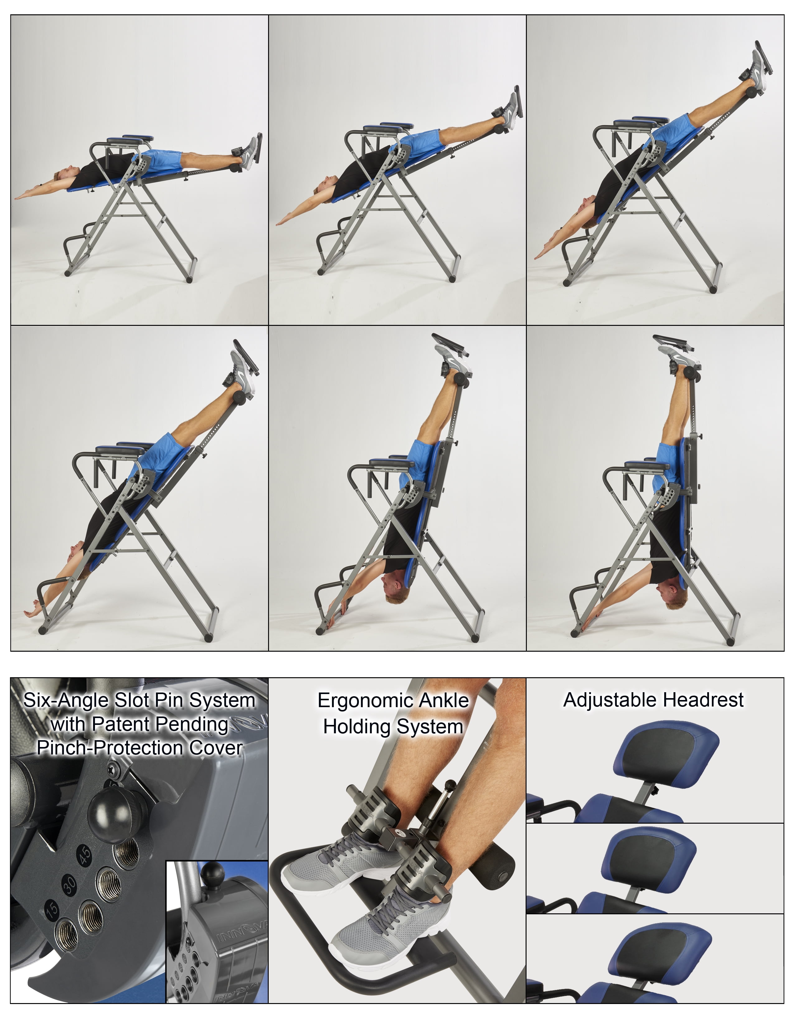 Innova ITP1000 Heavy Duty Inversion Table with Power Tower • Assembly Required • Versatile home fitness Inversion Table with Power Tower with 12 functions in one machine • Six (6) Position Adjustable Pin System with added Patented Protective Cover for easy positioning • Large, Comfortable Backrest with Adjustable Headrest • Accommodates users 4ft-10in to 6ft-6in with a 300 lb Weight Capacity • Consult with a licensed physician before starting any new exercise regime. Disclaimer: inversion tables are intended to provide immediate and lasting back relief, but may not work for all customers, we cannot guarantee pain relief with the purchase of this product