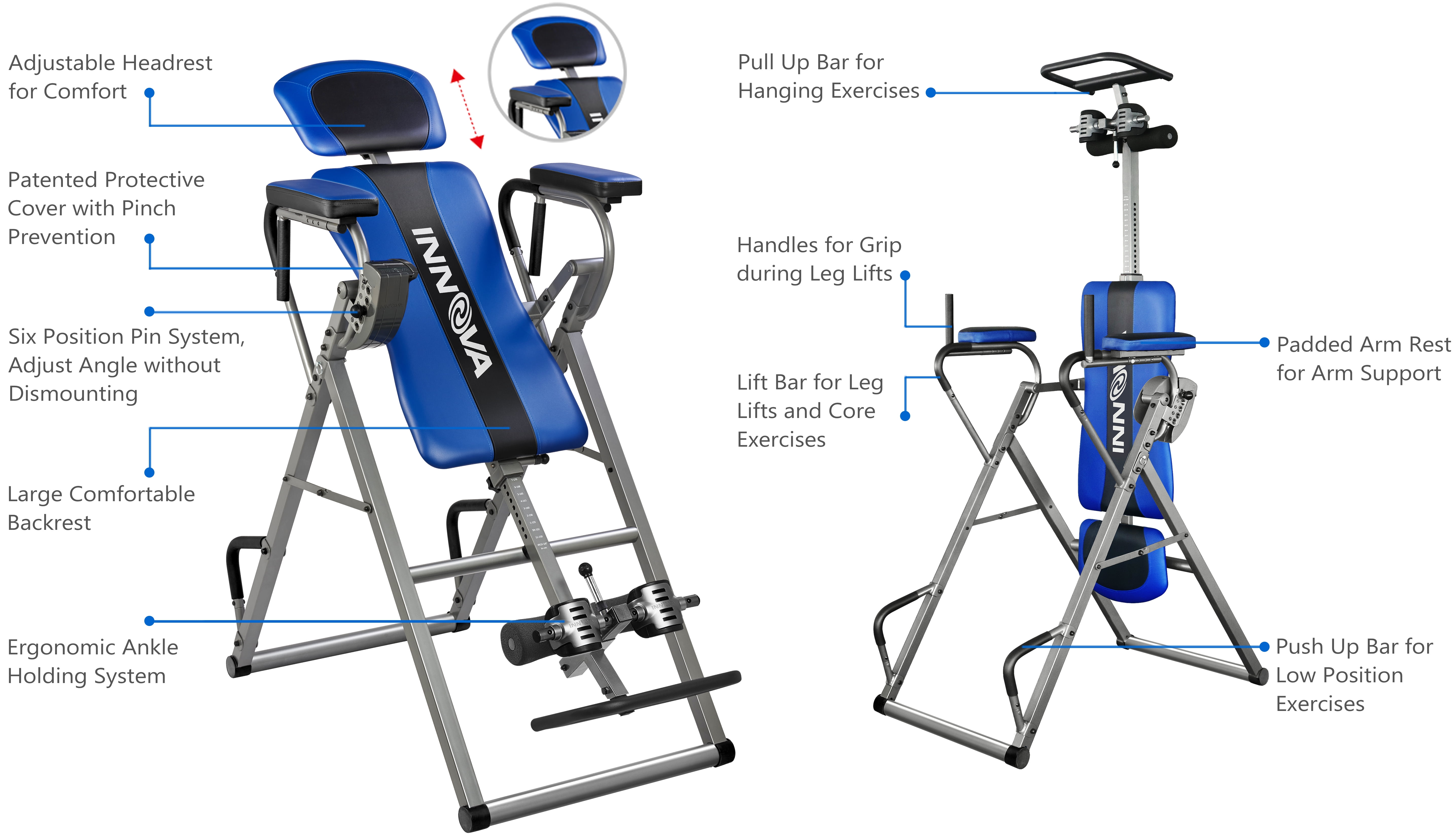 Innova Health and Fitness, Model ITP1000 The Innova ITP1000 is a heavy-duty inversion table that comes with many features that set it apart from other inversion tables. Starting with its large backrest pad and soft touch foam handlebars, it provides a comfortable, easy inversion. But these are just the basics. The ITP1000’s True Balance System allows each user to find their own unique center of gravity. The Six Angle Pin System allows users to trust that the ITP1000 will easily, safely, and consistently deliver on the finest inversion experience. Converts to Power Tower Our Innova ITP1000 12-in-1 Inversion Table with Power Tower Workout Station will be a perfect addition to your home gym! This space saving, convenient station has 12 functions in just one unit. You will be able to easily workout your body with pull-ups, chin up, dips, leg lifts, and pushups. The inversion table easily convert into a power tower and vice versa! True Balance System – Double Adjustment Structure Unlike other inversion tables, which only have one adjustable part, the ITP1000’s True Balance System has two adjustable features, to help each individual user find the smoothest and most comfortable inversion experience for them. The True Balance Structure allows users to adjust the headrest and the height to micromanage the center of gravity. The 6-Angle Pin System with Protective Cover The ITP1000 also includes a patented protective cover for the easy to adjust six angle pin system. Just position the pin in the desired slope and know that your inversion position will be safe, comfortable, and consistent every time. Old tether strap systems require the user to dismount entirely and climb underneath the table in order to adjust and can loosen after repeated use. Disclaimer: inversion tables are intended to provide immediate and lasting back relief, but may not work for all customers, we cannot guarantee pain relief with the purchase of this product Safety Information: Consult with a licensed physician before using this inversion table. Some medical conditions may not be suitable for use with this product. Disclaimer: Although we strive to ensure all product details and information is accurate, there may be slight variations by the manufacturer. Actual product packaging and materials may vary and may contain different information than shown on our product page or website. Please do not rely solely on the information presented and be sure to read all labels, warnings, and instructions before using the product. For additional information on the product, please do not hesitate to contact the manufacturer.