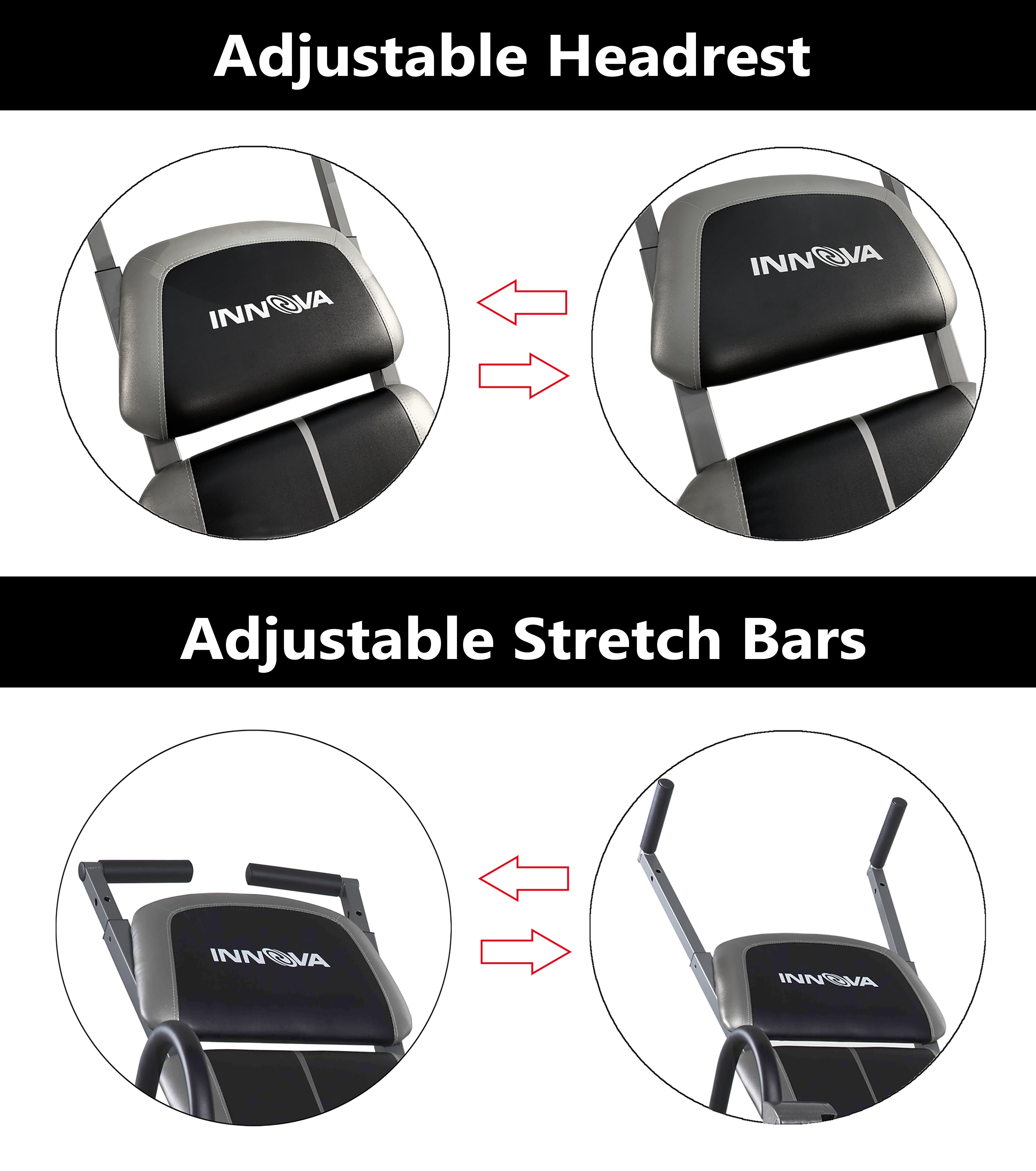 Innova Health and Fitness, Model ITX1200 The Innova ITX1200 is a heavy-duty inversion table that comes with many features that set it apart from other inversion tables. Starting with its adjustable Stretch Bars that allows for a full body stretch at a lower slope setting. This model also has a large backrest, adjustable headrest, and soft touch foam handlebars to allow for a comfortable, easy inversion. But these are just the basics. The ITX1200’s True Balance System allows each user to find their own unique center of gravity. The Three Angle Pin System allows users to trust that the ITX1200 will easily, safely, and consistently deliver on the finest inversion experience. True Balance System – Double Adjustment Structure Unlike other inversion tables, which only have one adjustable part, the ITX1200’s True Balance System has two adjustable features, to help each individual user find the smoothest and most comfortable inversion experience for them. The True Balance Structure allows users to adjust the headrest and the height to micromanage the center of gravity. The 3-Angle Pin System with Protective Cover The ITX1200 also includes a patented protective cover for the easy to adjust three angle pin system. Just position the pin in the desired slope and know that your inversion position will be safe, comfortable, and consistent every time. Old tether strap systems require the user to dismount entirely and climb underneath the table in order to adjust and can loosen after repeated use. This inversion table is not intended for full inversion. Disclaimer: inversion tables are intended to provide immediate and lasting back relief, but may not work for all customers, we cannot guarantee pain relief with the purchase of this product Safety Information: Consult with a licensed physician before using this inversion table. Some medical conditions may not be suitable for use with this product. Disclaimer: Although we strive to ensure all product details and information is accurate, there may be slight variations by the manufacturer. Actual product packaging and materials may vary and may contain different information than shown on our product page or website. Please do not rely solely on the information presented and be sure to read all labels, warnings, and instructions before using the product. For additional information on the product, please do not hesitate to contact the manufacturer.