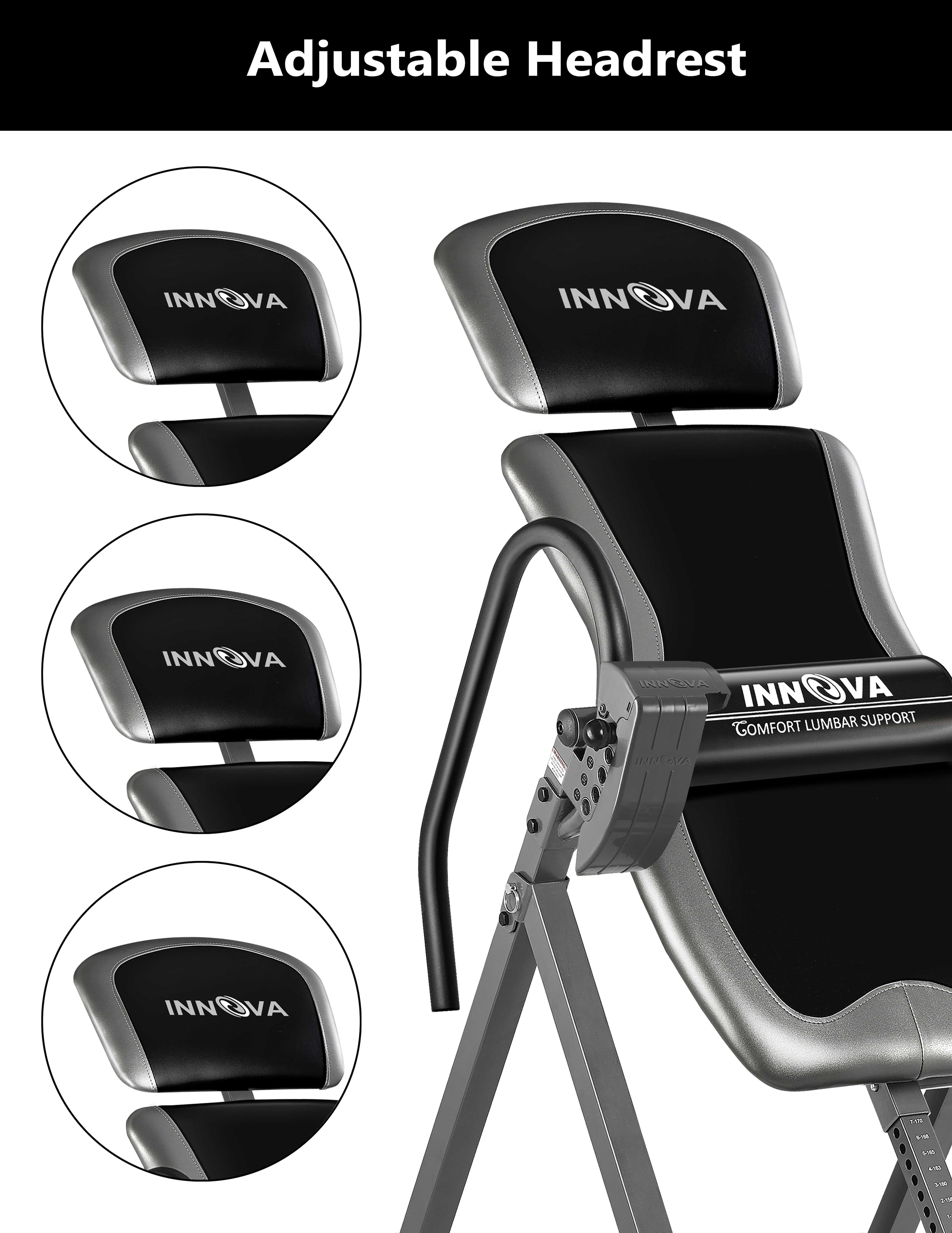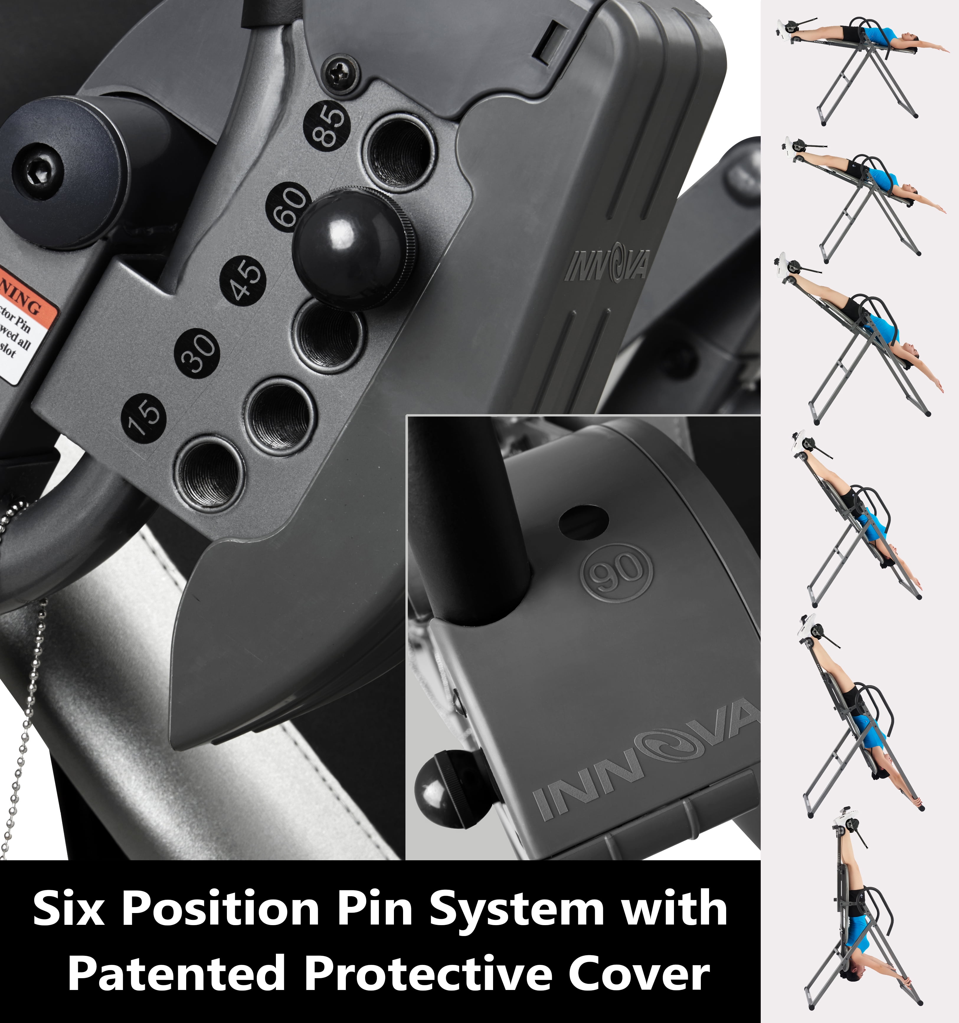 Innova Health and Fitness, Model ITX9688 The Innova ITX9688 is a heavy-duty inversion table that comes with many features that set it apart from other inversion tables. Starting with its large backrest, adjustable headrest, and soft touch foam handlebars, it provides a comfortable, easy inversion. But these are just the basics. The ITX9688’s True Balance System allows each user to find their own unique center of gravity. The Six Angle Pin System allows users to trust that the ITX9688 will easily, safely, and consistently deliver on the finest inversion experience. True Balance System – Double Adjustment Structure Unlike other inversion tables, which only have one adjustable part, the ITM4800’s True Balance System has two adjustable features, to help each individual user find the smoothest and most comfortable inversion experience for them. The True Balance Structure allows users to adjust the headrest and the height to micromanage the center of gravity. The 6-Angle Pin System with Protective Cover The ITM4800 also includes a patented protective cover for the easy to adjust six angle pin system. Just position the pin in the desired slope and know that your inversion position will be safe, comfortable, and consistent every time. Old tether strap systems require the user to dismount entirely and climb underneath the table in order to adjust and can loosen after repeated use. Disclaimer: inversion tables are intended to provide immediate and lasting back relief, but may not work for all customers, we cannot guarantee pain relief with the purchase of this product Safety Information: Consult with a licensed physician before using this inversion table. Some medical conditions may not be suitable for use with this product. Disclaimer: Although we strive to ensure all product details and information is accurate, there may be slight variations by the manufacturer. Actual product packaging and materials may vary and may contain different information than shown on our product page or website. Please do not rely solely on the information presented and be sure to read all labels, warnings, and instructions before using the product. For additional information on the product, please do not hesitate to contact the manufacturer.