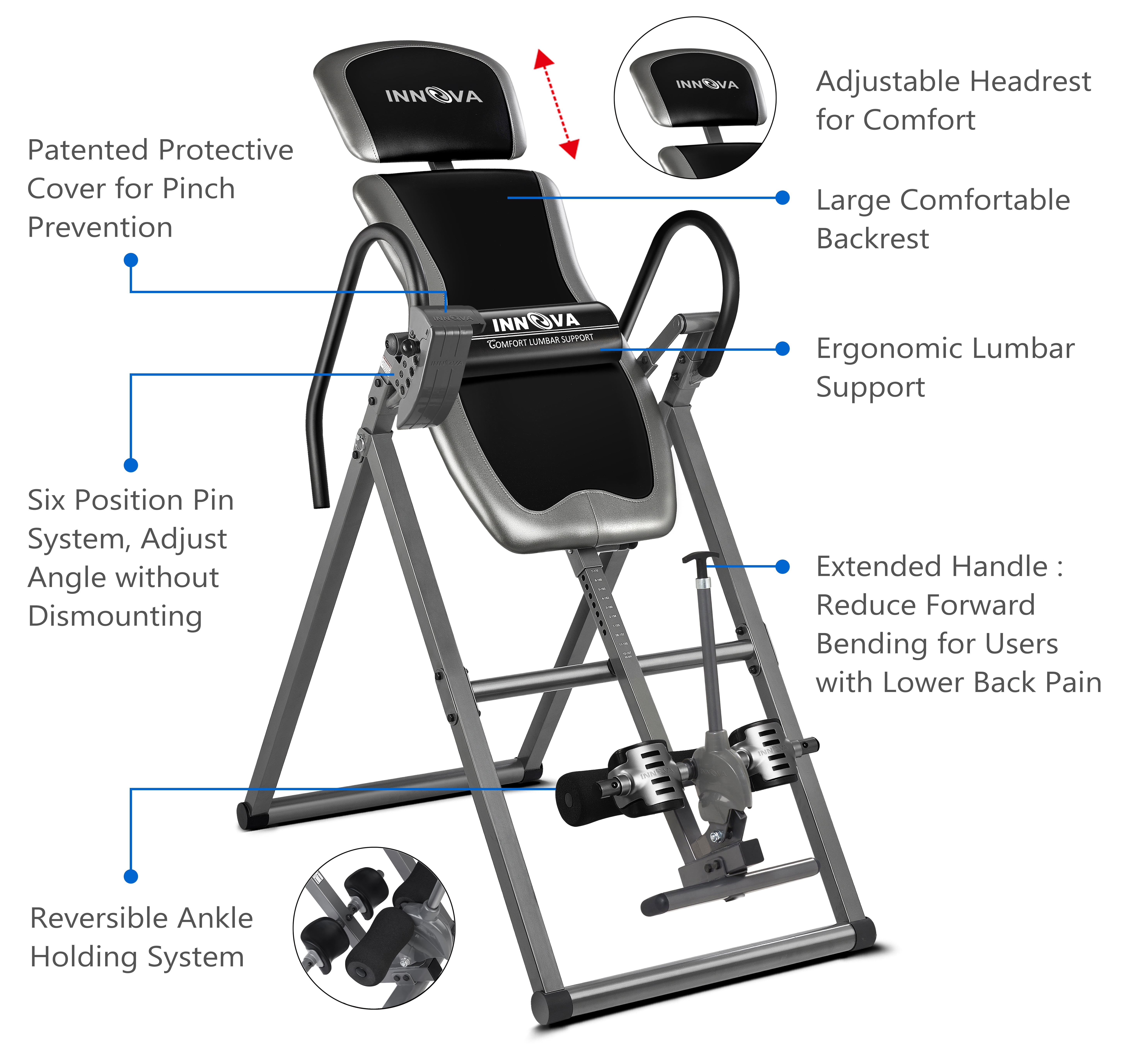 Innova ITX9688 Heavy Duty Deluxe Inversion Table • Assembly Required • Longer Ankle Holding Knob for easier release with Ergonomic Ankle Holding System • Ergonomic and Reversible Ankle Holding System (Ankle Holders can trade places) • True Balance System for easy inverting • Six (6) Position Adjustable Pin System with added Patented Protective Cover for easy positioning • Large, Comfortable Backrest with Adjustable Headrest • Accommodates users 4ft-10in to 6ft-6in with a 300 lb Weight Capacity • Consult with a licensed physician before starting any new exercise regime. Disclaimer: inversion tables are intended to provide immediate and lasting back relief, but may not work for all customers, we cannot guarantee pain relief with the purchase of this product