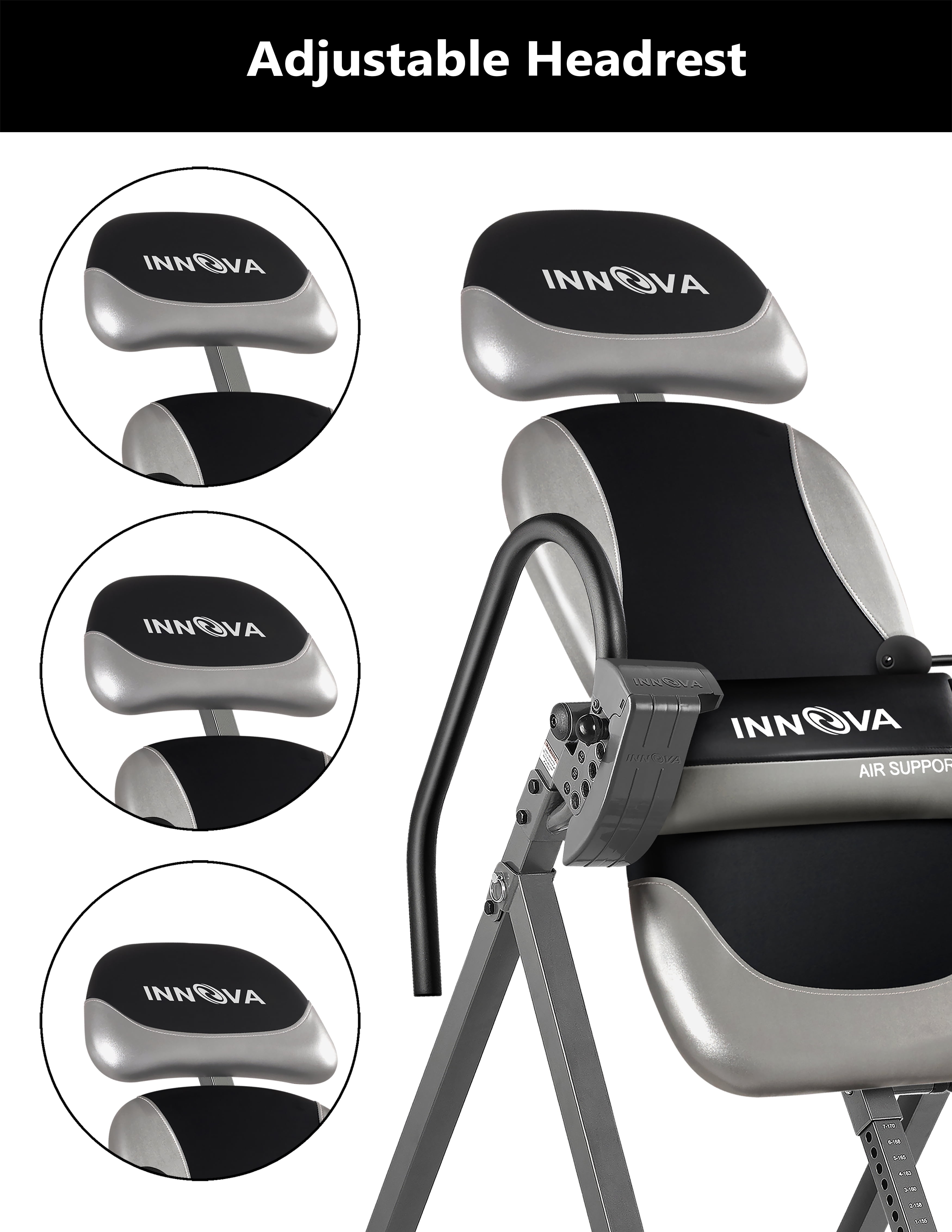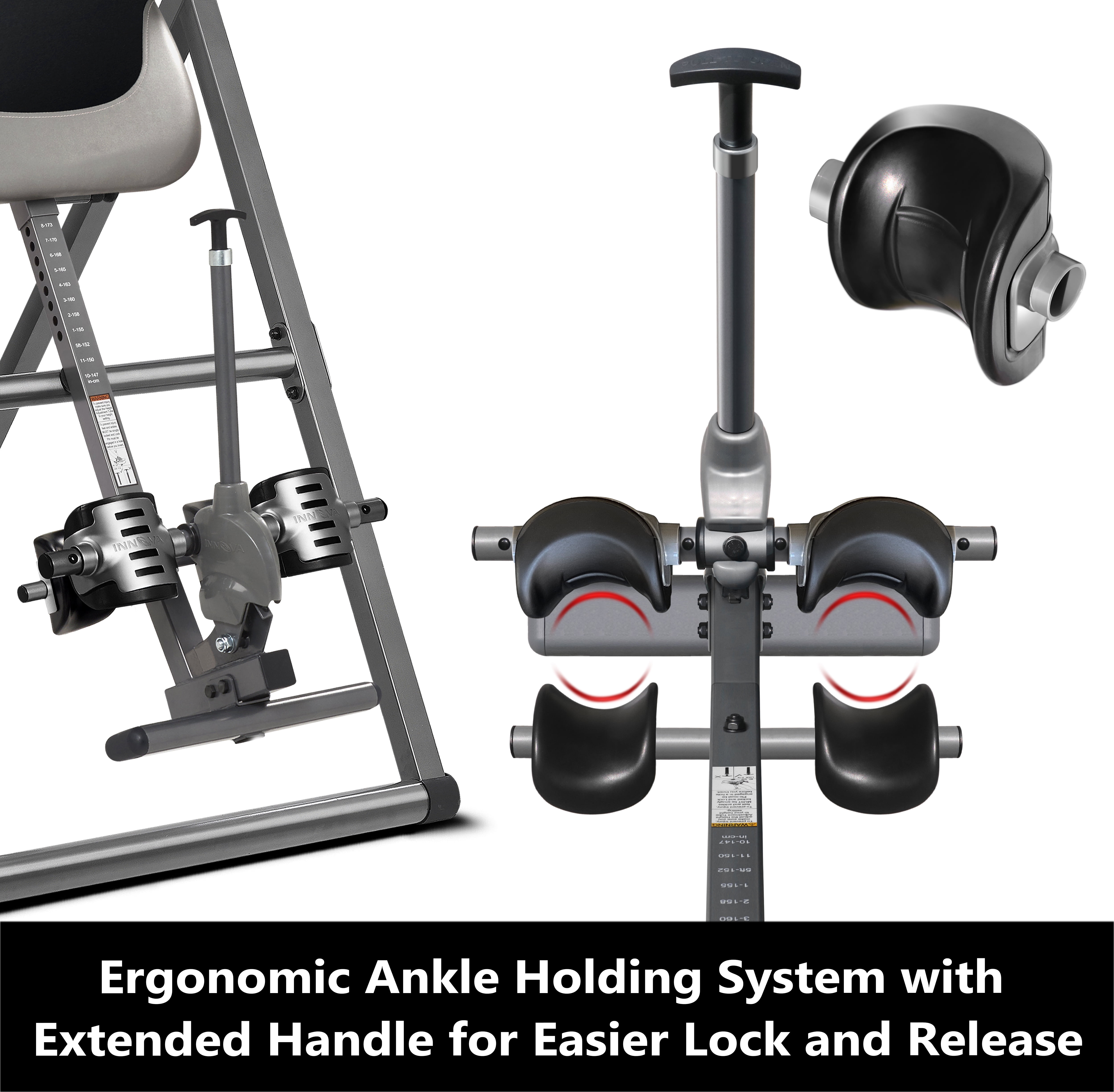 Innova ITX9900 Heavy Duty Deluxe Inversion Table • Assembly Required • Air Lumbar Pad – to personalize your lumbar support • Longer Ankle Holding Knob for easier release with Ergonomic Ankle Holding System • True Balance System for easy inverting • Six (6) Position Adjustable Pin System with added Patented Protective Cover for easy positioning • Large, Comfortable Backrest with Adjustable Headrest • Accommodates users 4ft-10in to 6ft-6in with a 300 lb Weight Capacity • Consult with a licensed physician before starting any new exercise regime. Disclaimer: inversion tables are intended to provide immediate and lasting back relief, but may not work for all customers, we cannot guarantee pain relief with the purchase of this product
