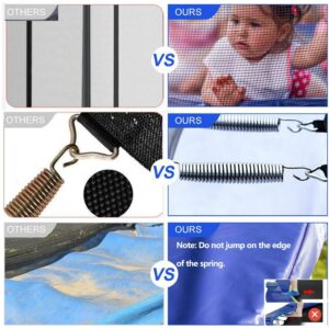 – Set Includes: 1 x Instructions, 1 x ladder, 6 x Arc-shaped tube, 6 x Up safety pole with EPE tube, 6 x Bottom safety pole with EPE tube, 3 x U-leg, 60 x Spring, 6 x Connecting tube, 1 x Wrench, 12 x Screws and Nuts, 1 x Drag hook, 1 x Spring cover pad, 1 x Safety net, 1 x Water proof jumping mat