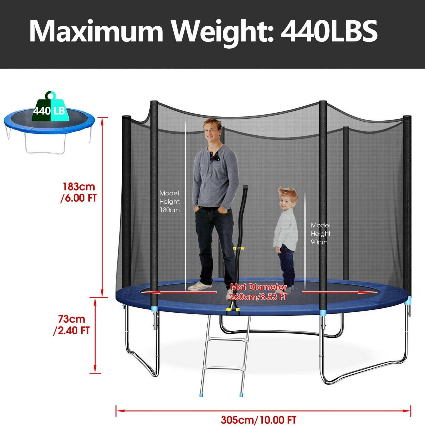 – Trampoline with enclosure net protects your kids all-round, they can play happily inside, and the family can not worry any more.