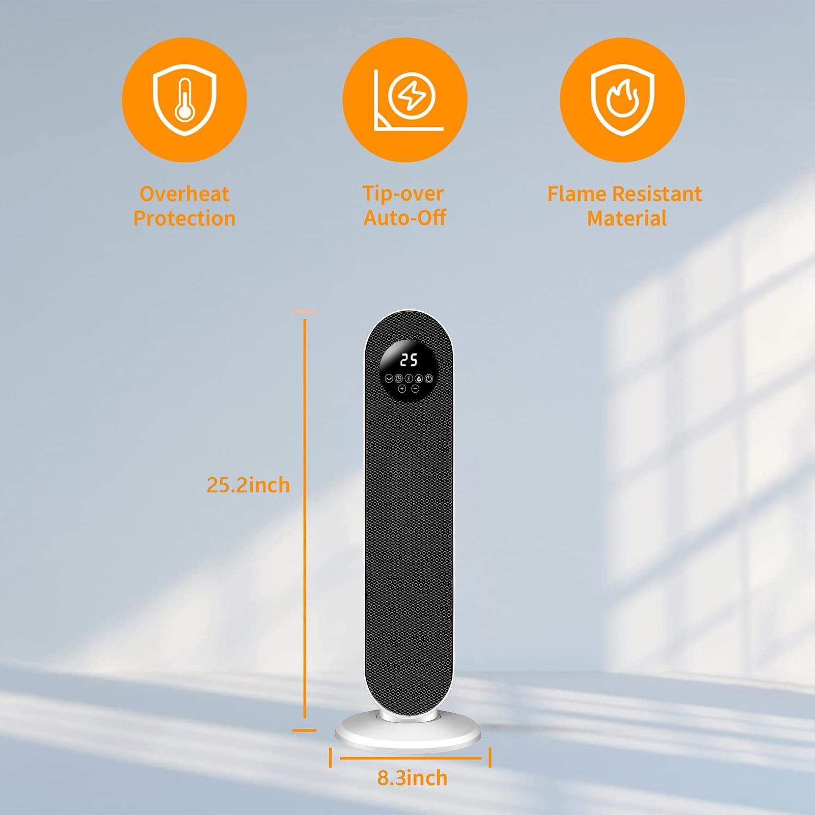About this item Ceramic Technology: Ceramic heating element that provides faster and more efficient heating than traditional heaters. With PTC ceramic heating tech and high speed fan, heaters maximize heat out and are long lasting quiet operation. Handy and Mighty: Give your home’s heating system a boost with our handy heater. Unlike those small space heaters, it offers a wider heating range & dissipation grill and widespread 60° oscillation, dispersing the air evenly. The perfect space heater for office, bathroom, bedroom and so on. Adjust the Temperature to Your Needs : Equipped with an adjustable thermostat, our space heater will keep you comfortable at all times. Just set the dial to the desired heat setting and let the thermostat monitor the surrounding air temperature and keep you warm. Low Noise : The noise this heater makes is lower than 40 dB, quiet enough for most people to use in a bedroom while sleeping. Provide a quiet environment for you in cold days. Overheated Protection:Our portable heater is equipped with an automatic overheat protection device located inside the body of the heater. If personal space heater gets too hot for any reason, the automatic overheat protect device will turn the heater off. Specifications: Special Feature: Overheat Protection, 60° oscillation Material: Plastic, Metal, PTC Color: White Power Source: Corded Electric Heating Method: Convection Heat Output :1500 Watts Dimensions: 25.2 x 8.3 x 8.3 inches Item Weight: 5 pounds 3 Heat Settings: High(1500W), Low(1000W), Fan-Only(8W)