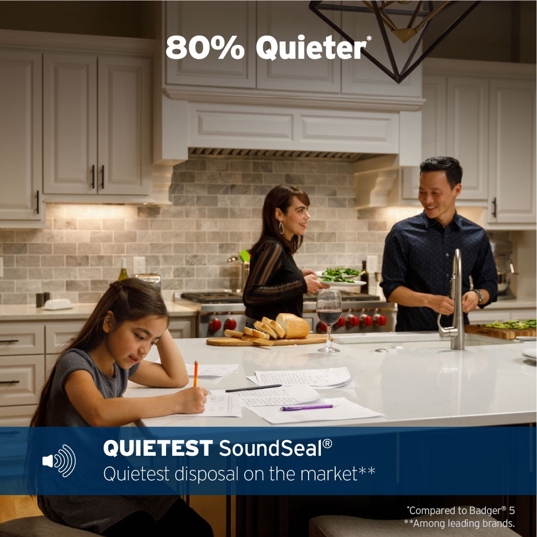 InSinkErator Evolution 1 HP, Garbage Disposal, with 12.25-inch height, 8.25-inch width; includes EZ Connect Hardwire Adapter and garbage disposal flange, gaskets, bolts, etc., for installation, plus jam-buster wrenchette and kitchen drain stopper USA-assembled InSinkErator garbage disposal; compatible EZ Connect Power Cord sold separately Quiet sink disposal featuring Quietiest SoundSeal technology for quietest disposal available; space-saving design that easily fits under sink, leaving room for other small kitchen appliances, like an instant hot water dispenser Sink disposal with 4-Stage MultiGrind technology designed to prevent clogs by grinding tough food scraps the finest; 1 HP Dura-Drive induction motor and stainless steel grind components; removable, antimicrobial Quiet Collar sink baffle InSinkErator garbage disposer featuring rubber Anti-Vibration Mount and removable Quiet Collar sink baffle that’s antimicrobial and dishwasher-safe DIY EZ Connect food waste disposer kitchen appliance with EZ Grip Handles, EZ Removable Dishwasher Inlet Plug with included wrenchette, EZ Connect Hardwire Adapter, and Lift and Latch technology for easiest installation of InSinkErator food waste disposer Backed by InSinkErator 10-Year “We Come to You” Limited Service Warranty that covers in-home repair or replacement of kitchen garbage disposal by an authorized dealer