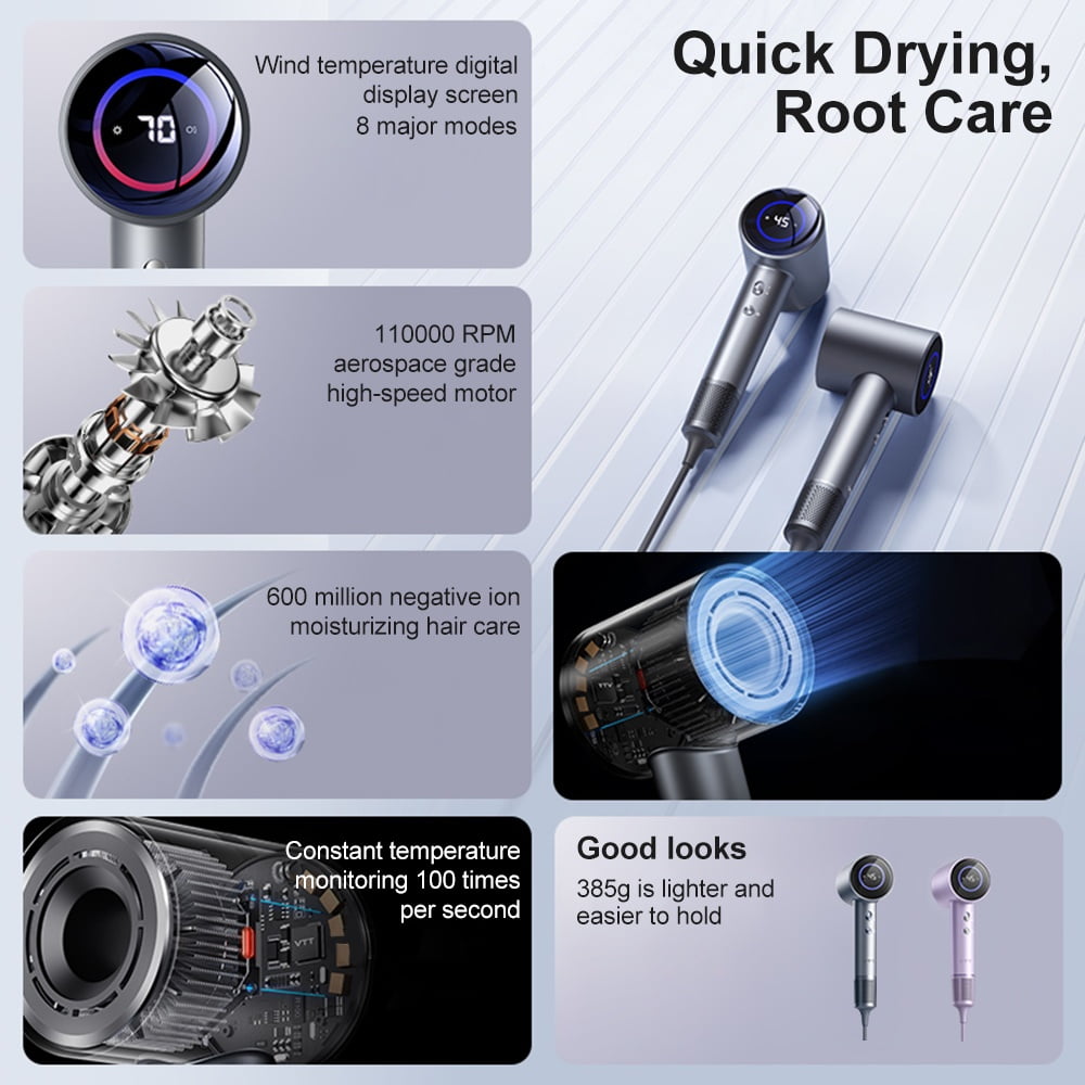 INSMART Hair Dryer, 110,000 RPM Brushless Motor High Speed Hair Dryer, 8 Modes and 4 Temperatures with LED Screen for Home and Travel.