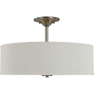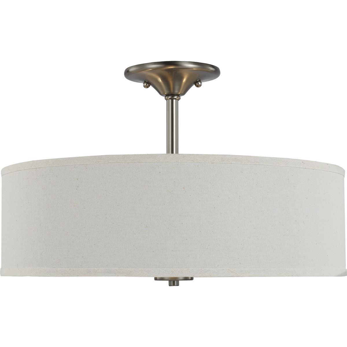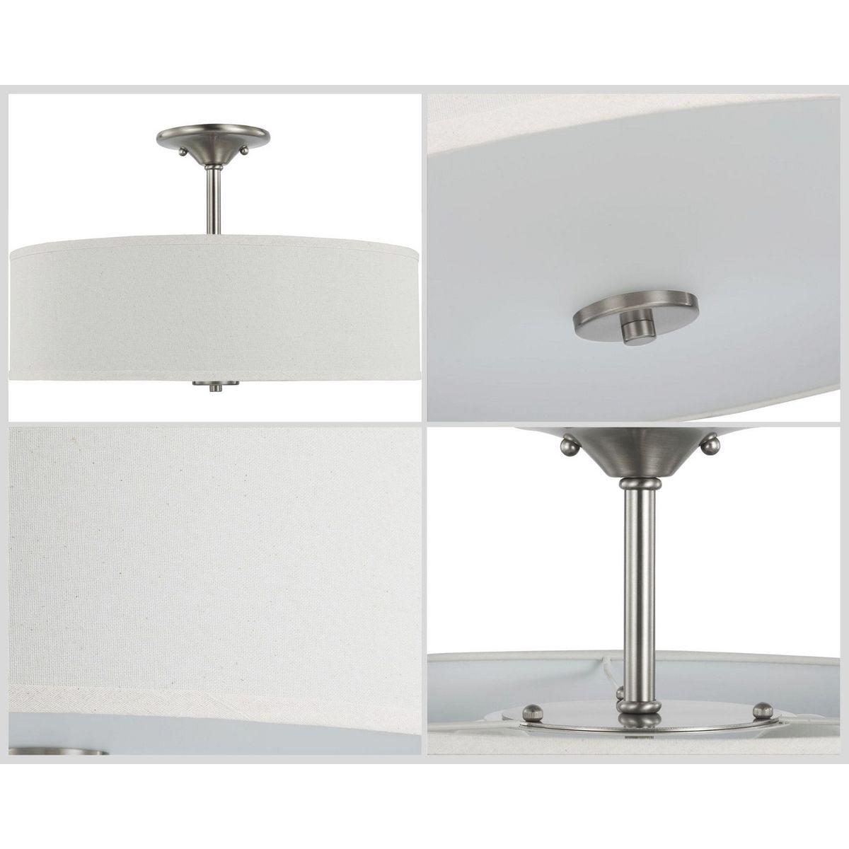 Harkening back to a simpler time, the Inspire Collection Brushed Nickel Three-Light Semi-Flush Mount’s timeless demeanor is sure to become a favorite for generations. A round, off-white linen shade with an etched glass diffuser steals the show and creates a beautiful muted glow. Understated metal accents complement the light fixture as it fosters a casual, friendly atmosphere.