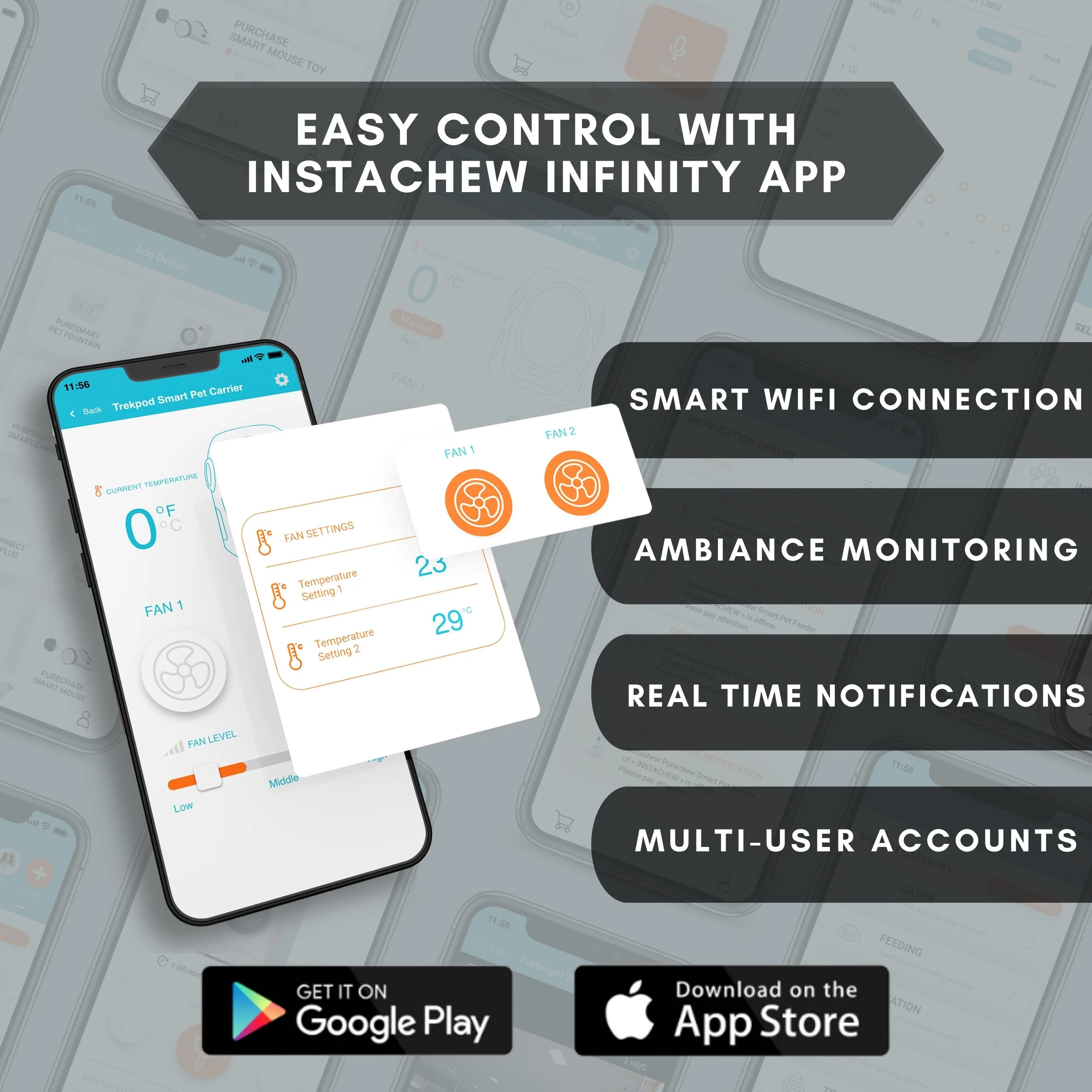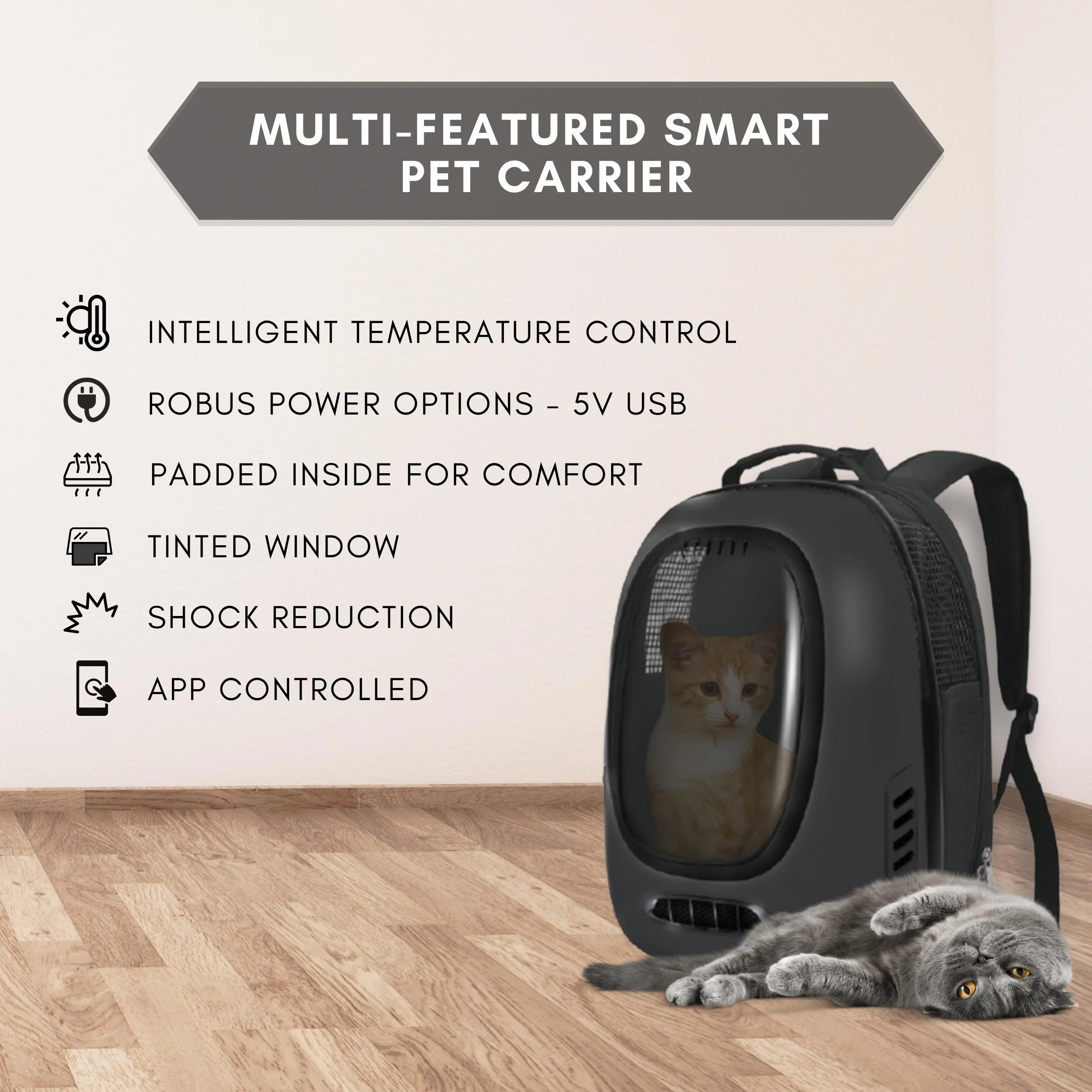 INTELLIGENT TEMPERATURE CONTROL: The instachew trekpod pet carrier backpack utilizes modern technology always to ensure the optimal temperature. when the temperature reaches 25 degrees, one fan turns on automatically. When the temperature reaches 28 degrees, both fans are turned on. The temperature is reduced to 27 degrees. Fans will time out and adjust. This allows your cat to travel with you in hot weather and cold! SHOCK REDUCTION: The smart shock absorption system is built into the backplate of the backpack and is designed to the force of your pet’s weight on your body and minimize shock from moving around. Specially designed metal-plated food pads prevent the bag from falling when placed on the floor. ROBUS POWER OPTIONS: The cat carrier is powered by a 5V USB power bank which doubles as a portal charger if needed! Charge any device with the portable outlet. TINTED WINDOW: The tinted viewing panel allows your pet to enjoy the beautiful scenery while being protected and shaded by the harsh sun. BREATHABLE: The intelligent ventilation system allows for smart, automatic air control dependent on the internal temperature of the bag. This keeps the bag comfortable, and breathable, and minimizes noise interference. You can control it by the INSTACHEW Infinity app. CAPACITY: The carrier measures 13 inches in length and 17 inches in height. It can support a maximum weight of 17 pounds. A perfect fit for your cats and small dog SATISFACTION GUARANTEED: It is our mission to provide the highest quality products to our customers. In case of any query feel free to contact us at [email protected]