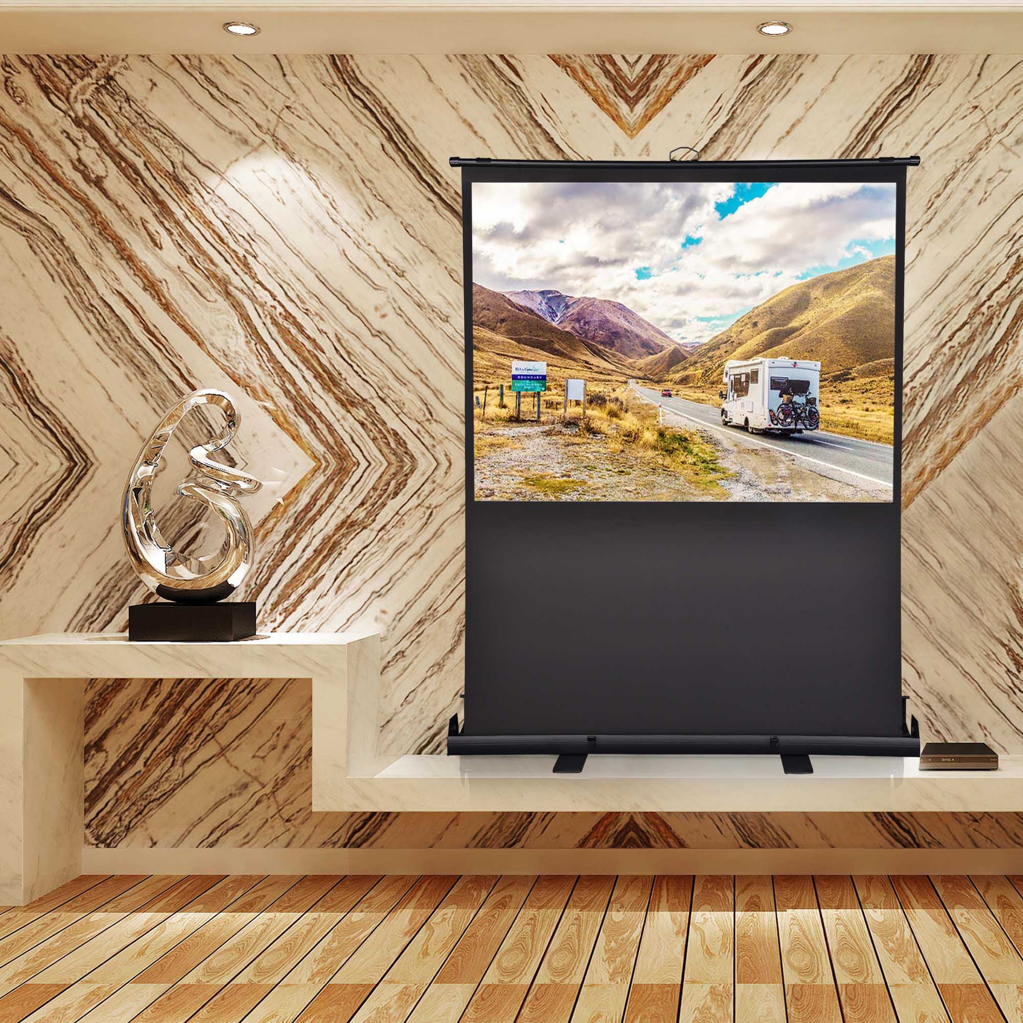 Portable Design – 60″ Pull Up Floor Projector Screen features a one-piece design and can be retracted fully into the case, ensuring easy storage, transport and perfect working synergy with handheld projectors for playing video presentations on-the-go. Pull-out to Use – Self-standing design with stable feet and telescoping pull-up mechanism that provides fast & quiet extension while the self-lock system allows the screen to stop at any desired position when you pull up to suit your preference. Good Light Diffuser – 60″ large matte white screen features 160 degree viewing angle for large viewing area and 1.3 gain to provide sharp and clear image, suitable for projections of all resolutions up to 4K or Ultra HD; Standard 4-side black borders help to increase picture focus & contrast for better viewing experience. Durable & Stable – Strong and rust-resistant aluminum frame and housing ensure frequent and long-lasting usage; Lockable feet to stabilize the screen when installed. Widely Applicable – Floor Projector Screen is ideal for indoor and outdoor use such as home theater, outdoor garden viewing, trade fair, meeting room and more to conveniently provide quality viewing wherever you are 0: Specifications: – Unfolded Overall Dimension(LxWxH): 52 3/4″ x 15 9/16″ x 82 5/16″ (134 x 39.5 x 209 cm) – Folded Overall Dimension (LxWxH): 52 3/4″ x 4 3/4″ x 5 1/8″ (134 x 12 x 13 cm) – Viewing Area Size (LxW): 48″ x 35 7/8″ (122 x 91 cm) – Diagonal: 60″ (152 cm) – Aspect Ratio: 4:3 – Viewing Angle: 160 degrees – Gain: 1.3 – Net Weight:19.95 Lbs (9.05 kg) Package Contents: – 1x Pull-Up Projector Screen – 1x Manual Notice: – Suitable for front projection