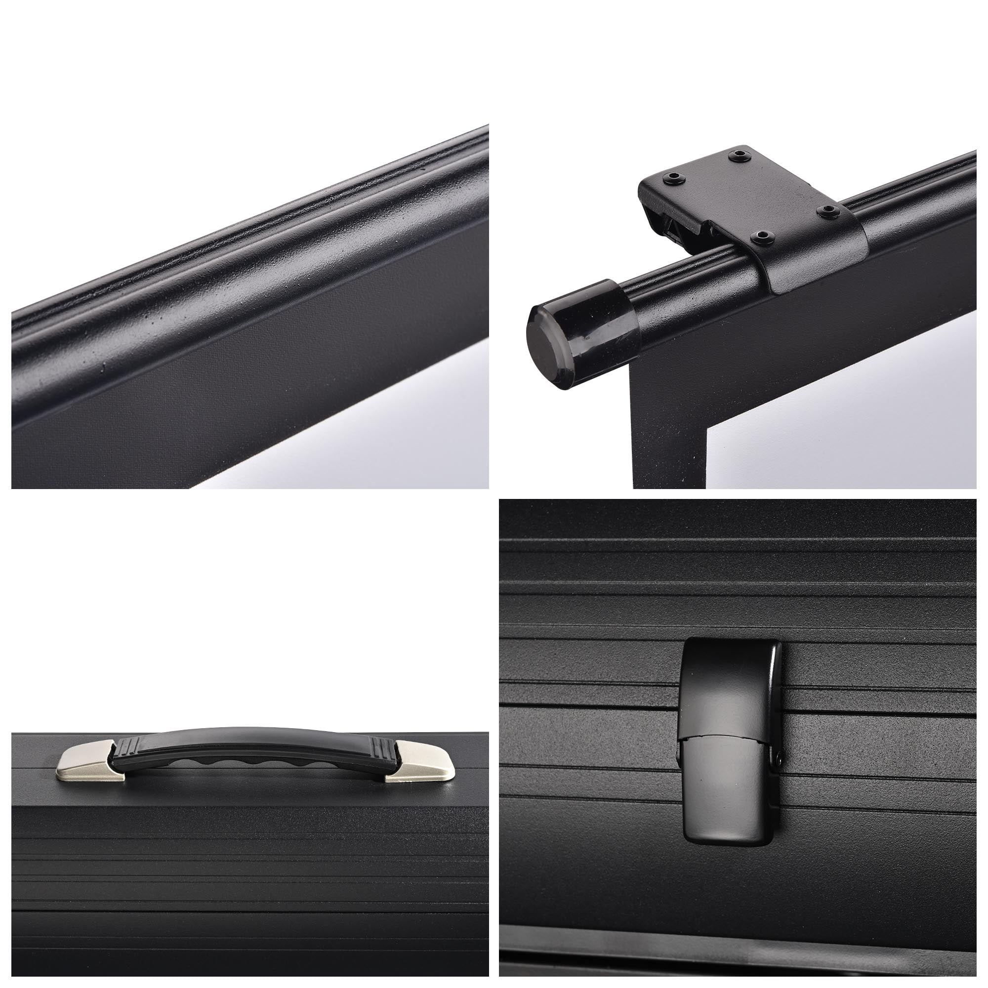 60″ Pull Up Projector Screen features one-piece design and can be retracted into the case Self-standing design with stable feet and telescoping pull-up mechanism provides fast extension Large matte screen with 160 degree viewing angle for large viewing area, 1.3 gain to provide clear image Rust-resistant aluminum frame and housing for frequent and long time use; Lockable feet to stabilize the screen Ideal for indoor and outdoor use such as home theater, outdoor garden viewing, trade fair, meeting room and more