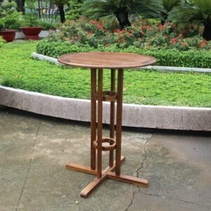 The Tivoli 43 in. Bar Height Bistro Patio Table makes an elegant addition to your patio furniture collection thanks to its timeless acacia hardwood construction and oil stained finish. Two round flat areas in the middle of the table are perfect for holding small utensils. Dimensions: 31L x 31W x 43H inches.