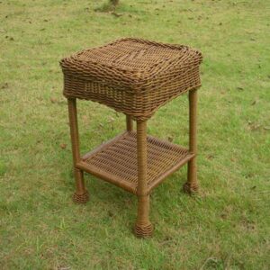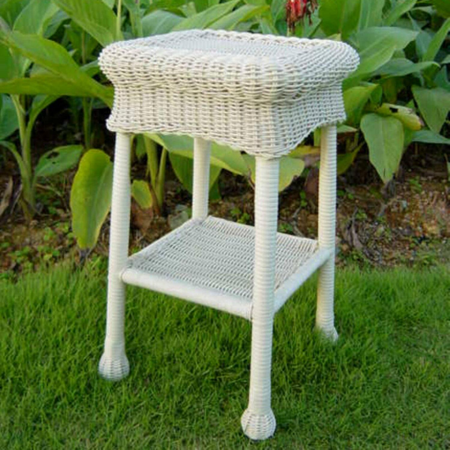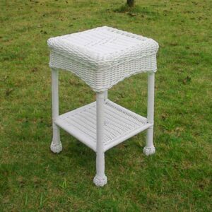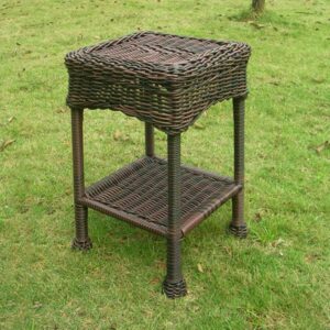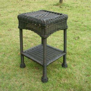 The Madison Wicker Resin 2-Tier Patio Side Table adds an attractive accent to your patio furniture arrangement with its contemporary style. The table is constructed of durable PVC and steel, and features a lower shelf for extra storage or display space. Dimensions: 12L x 12W x 20H inches.