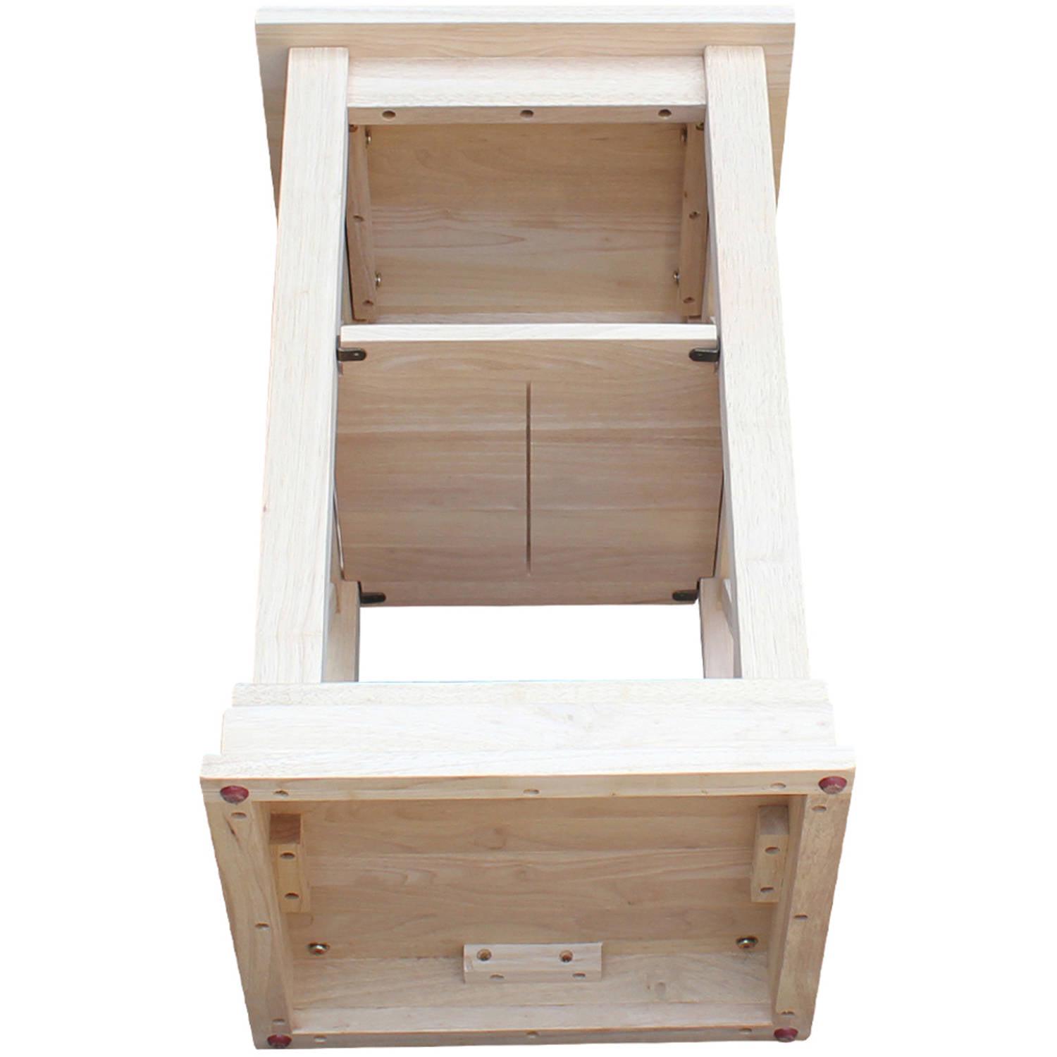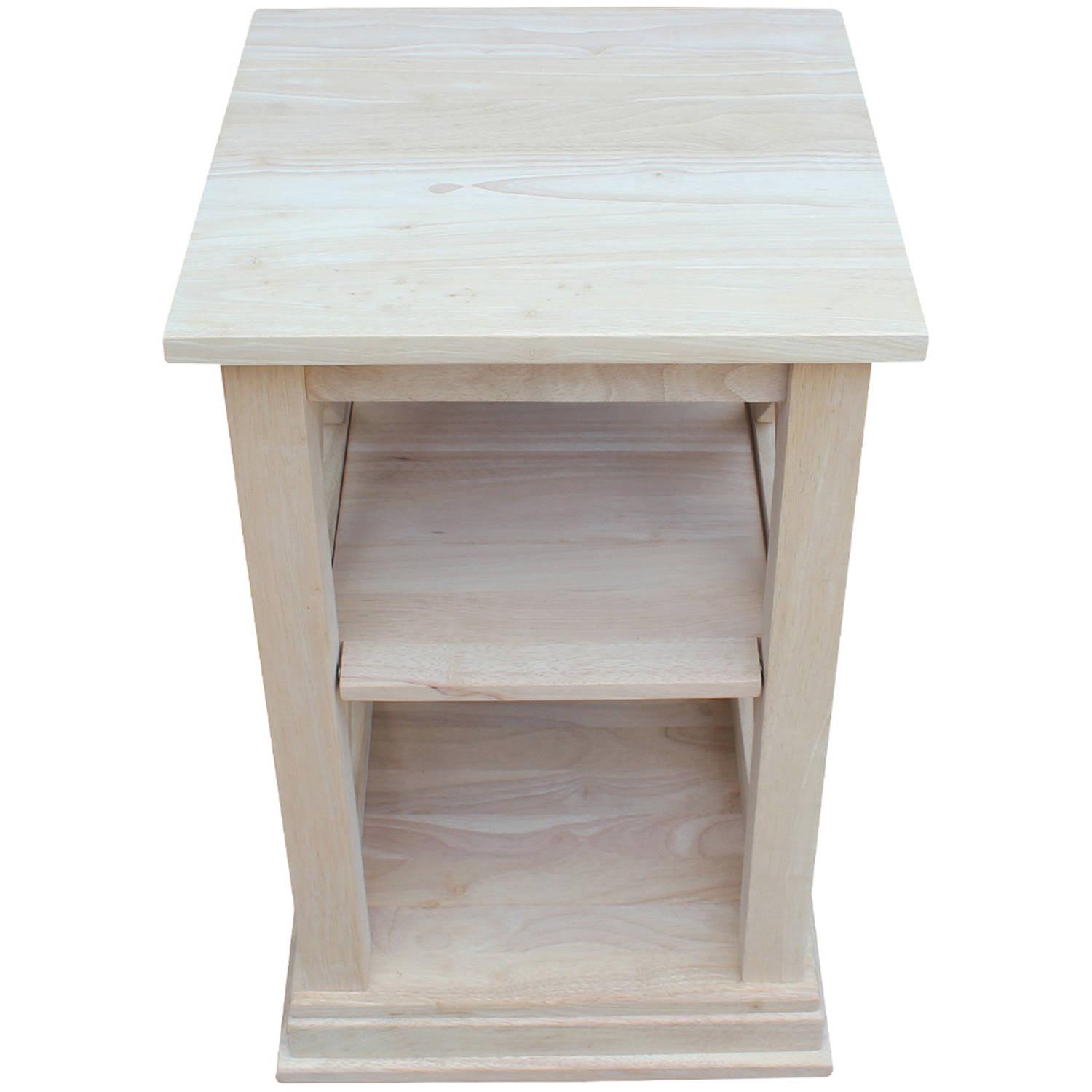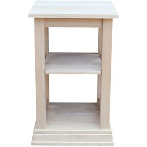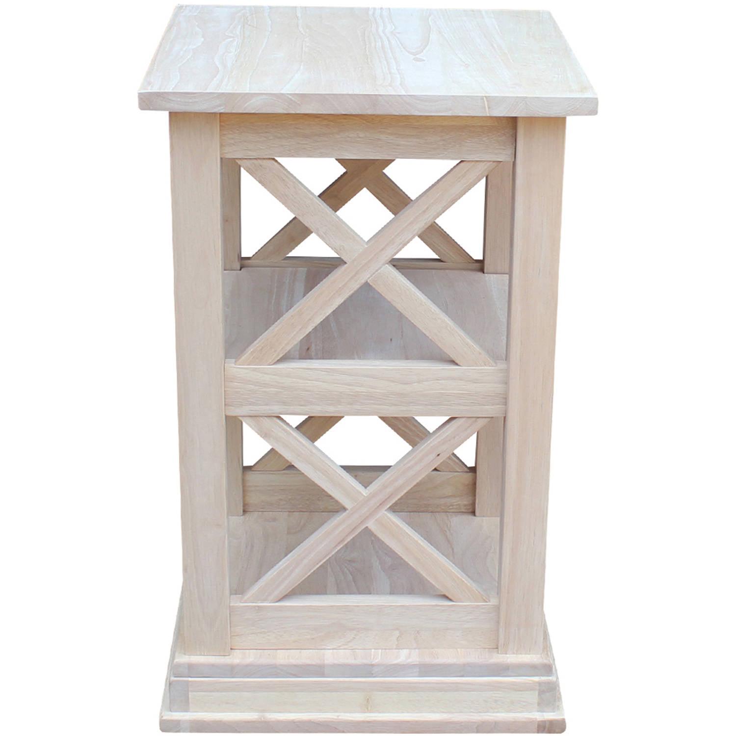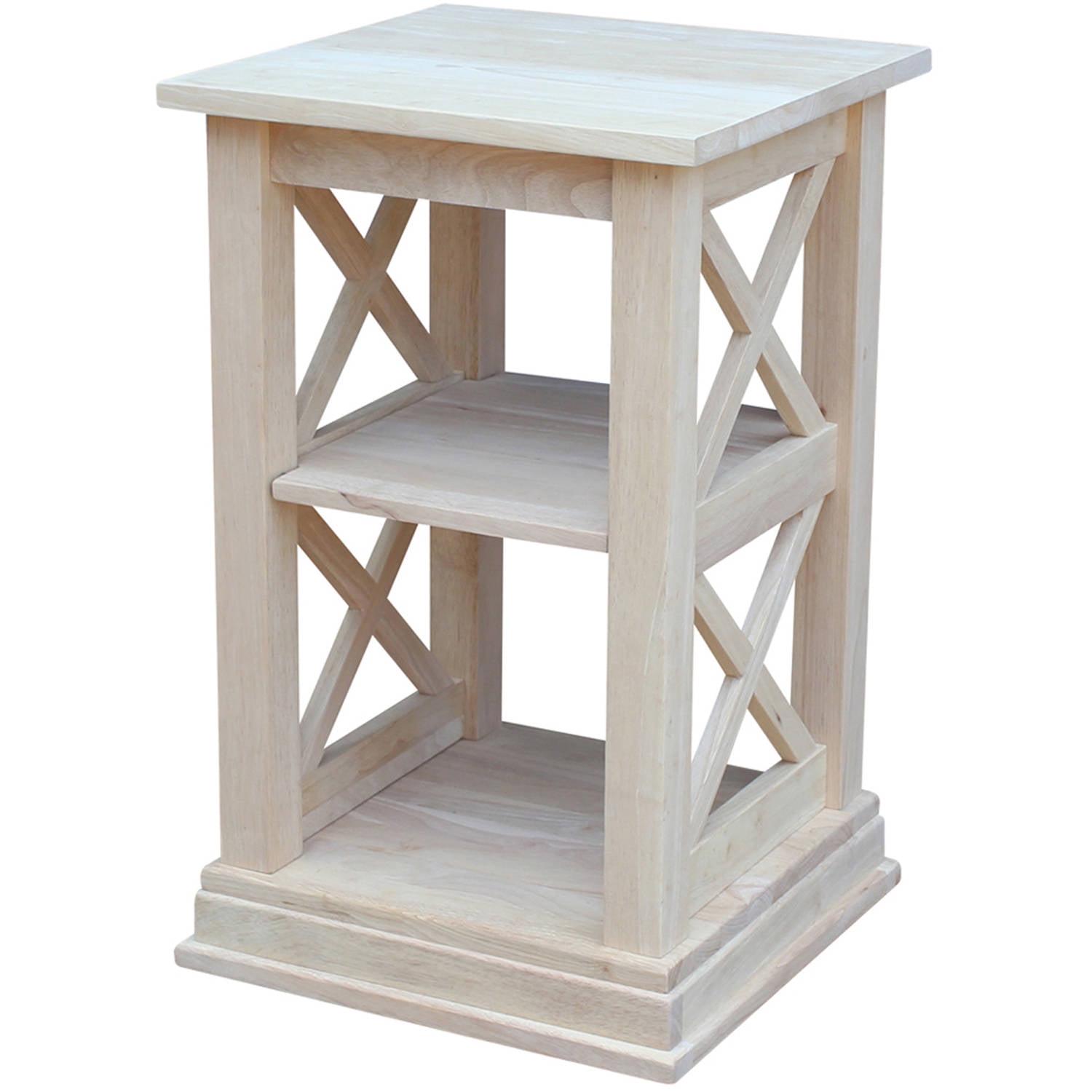 The X-shaped sides and stepped base molding give the International Concepts Hampton Accent Table with Shelves its classic, casual appeal. This solid wood accent table includes two handy shelves and is left unfinished so you can custom paint or stain it.