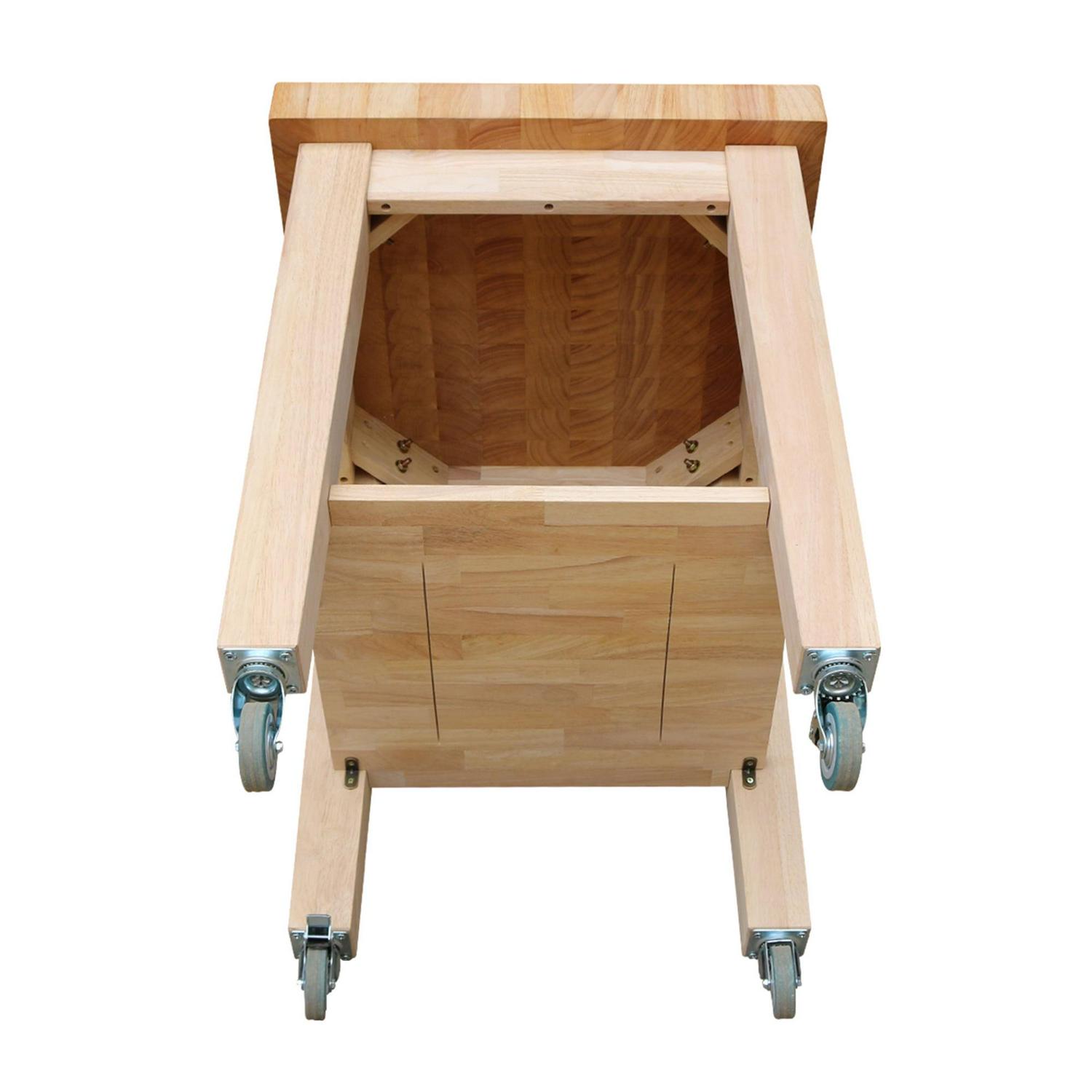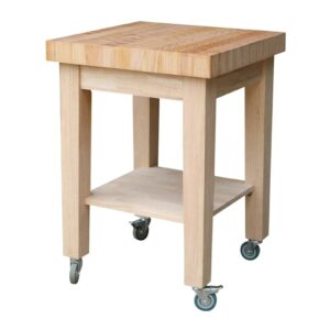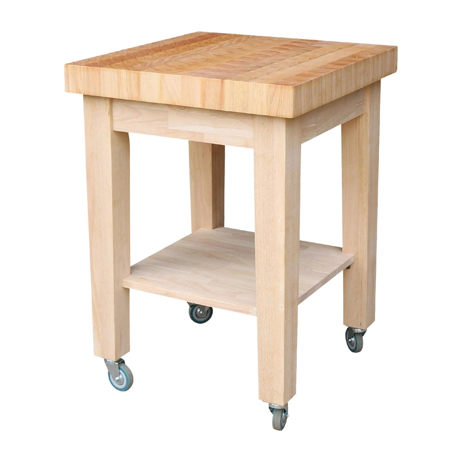 The International Concepts Kitchen Island offers a practical solution to limited counter space. This beautiful solid hardwood island will enhance most any kitchen or dining area. The unfinished surface allows you to adjust the finish to fit your kitchen decor. This easy-to-assemble wood kitchen island features an end-cut butcher block, giving you not only additional counter space but also a place to prepare meals. It also features four casters (two locking) that allow you to move it with ease.