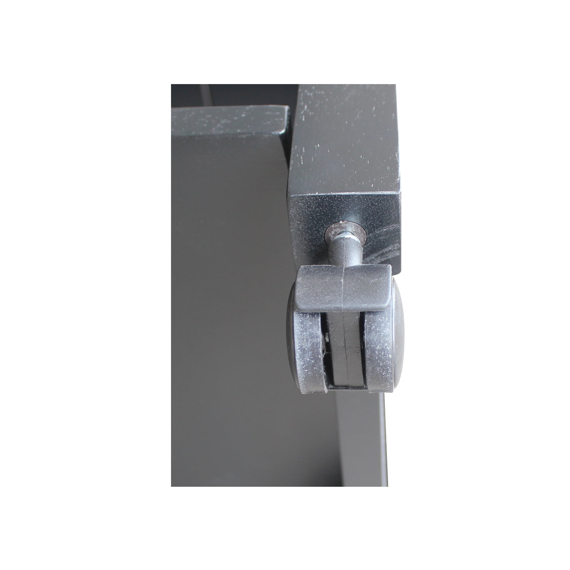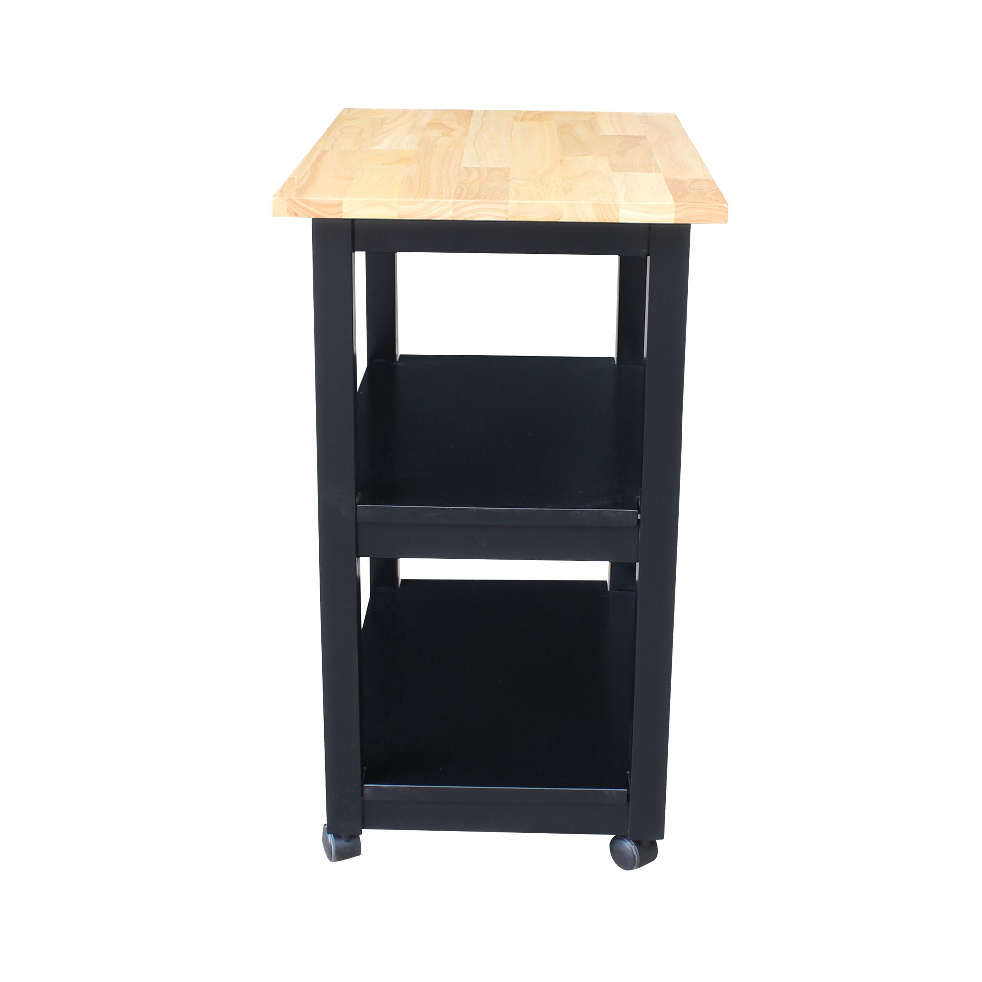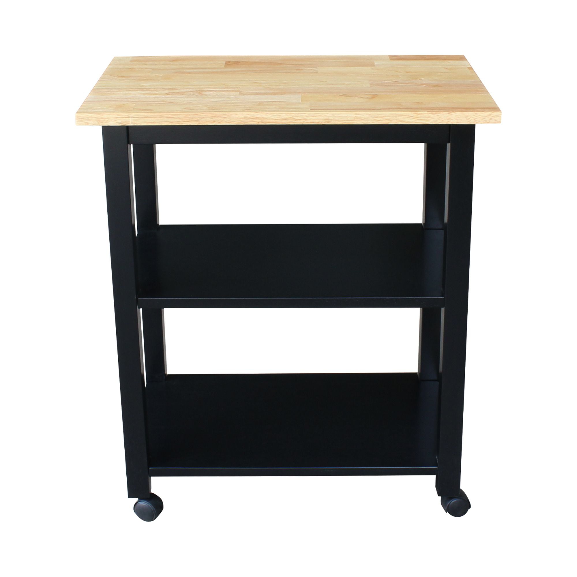 This piece is constructed using solid para-wood, which is highly recognized for its remarkable sturdiness and longevity. Dimensions: 26 in. W x 17.2 in. D x 29.9 in. H Includes 2 fixed shelves; each shelf measures 23 in. W x 14.5 in. D 4 casters, including 2 locking casters, for easy mobility Distance from floor to bottom of lower shelf: 3.7 in. Distance from top of lower shelf to bottom of upper shelf: 11.9 in. Distance between each shelf: 10.4 in. Distance from apron to top of shelf: 10.4 in. Table top weight capacity: 50 pounds; shelf weight capacity: 10 pounds Assembling the product has never been easier! You can put it together quickly and hassle-free with all the necessary hardware included.