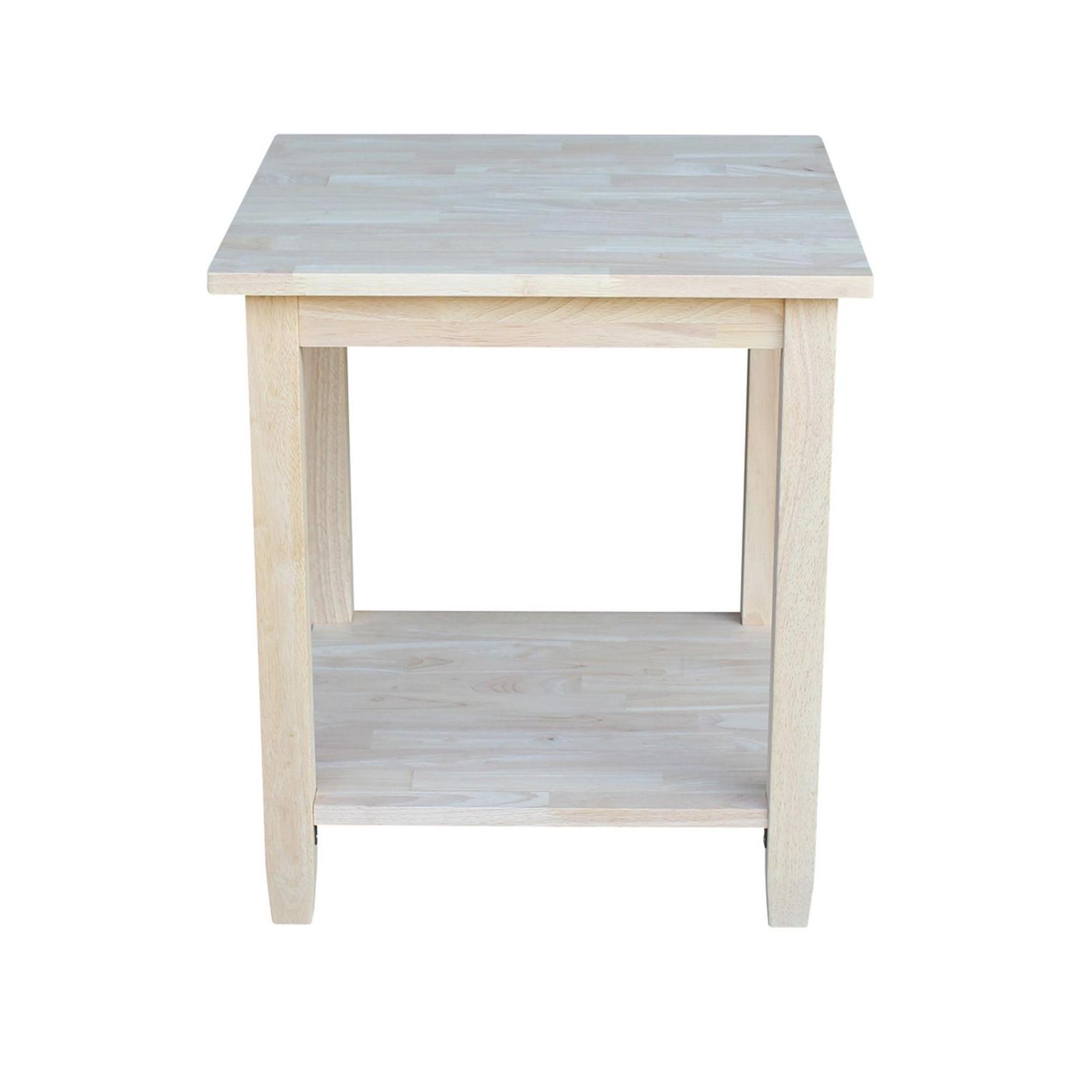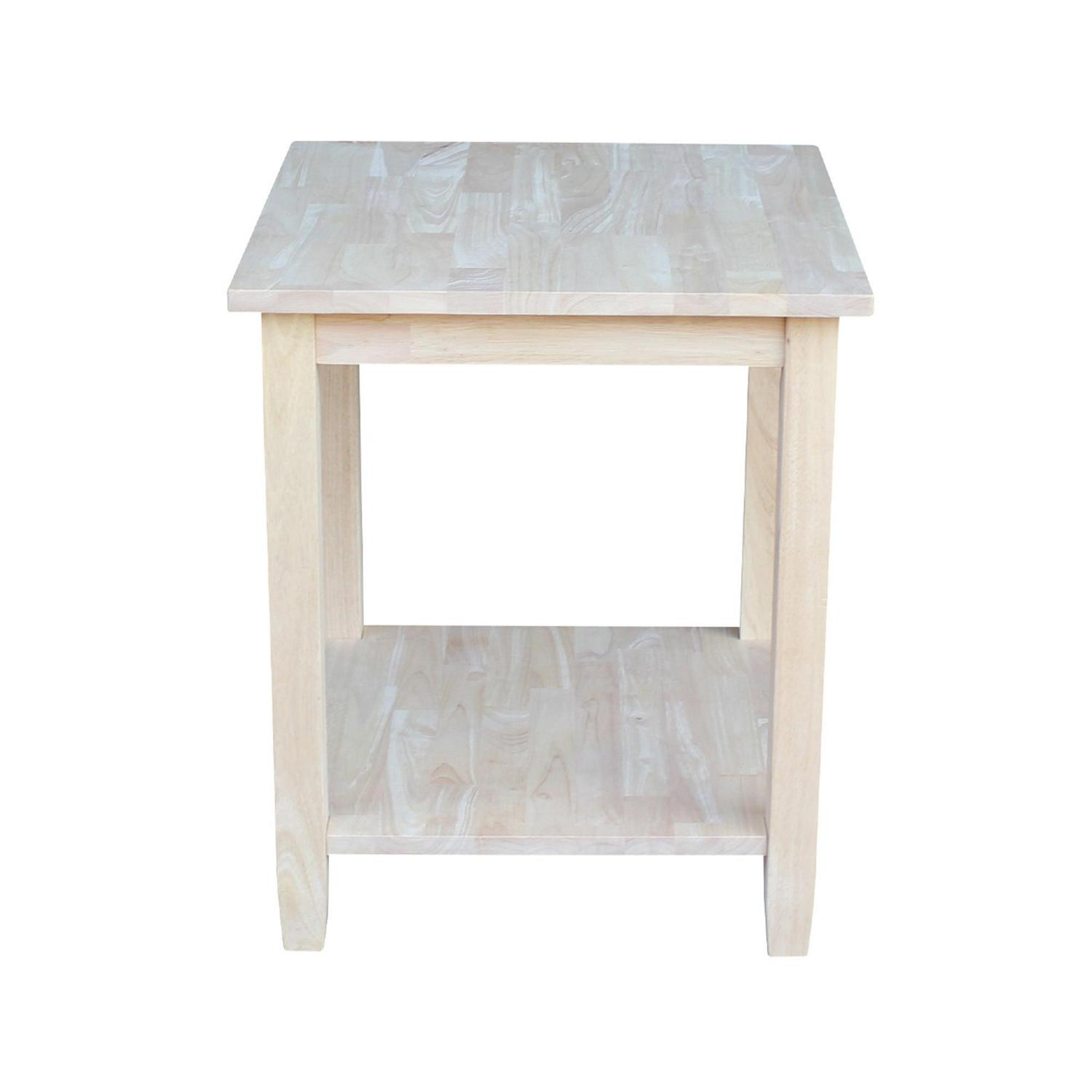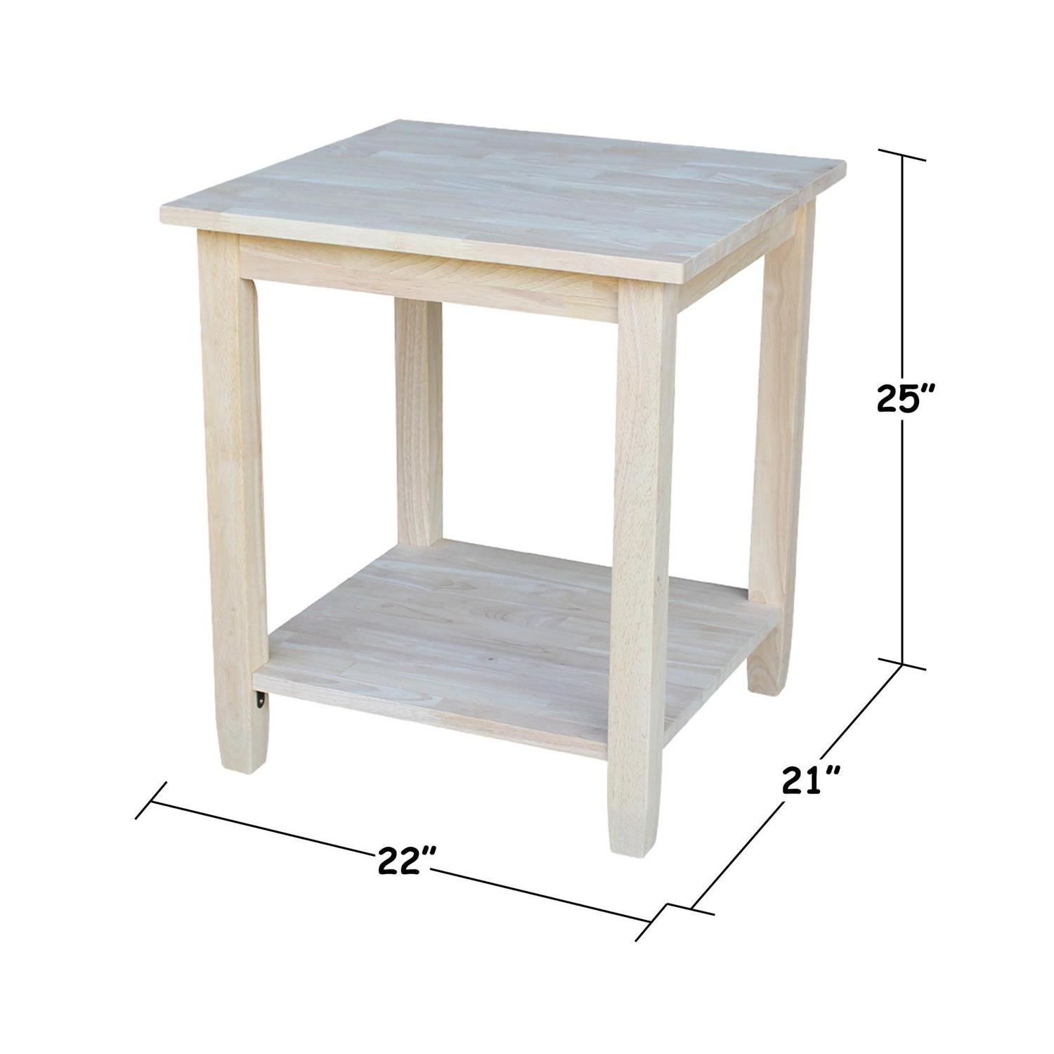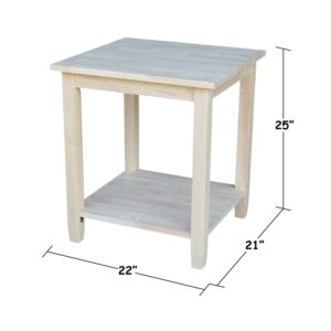 The uncomplicated lines of the International Concepts Solano End Table include block legs that slightly taper for a casual feel. The end table is made from solid wood and comes unfinished. It boasts a base shelf for twice the display space.