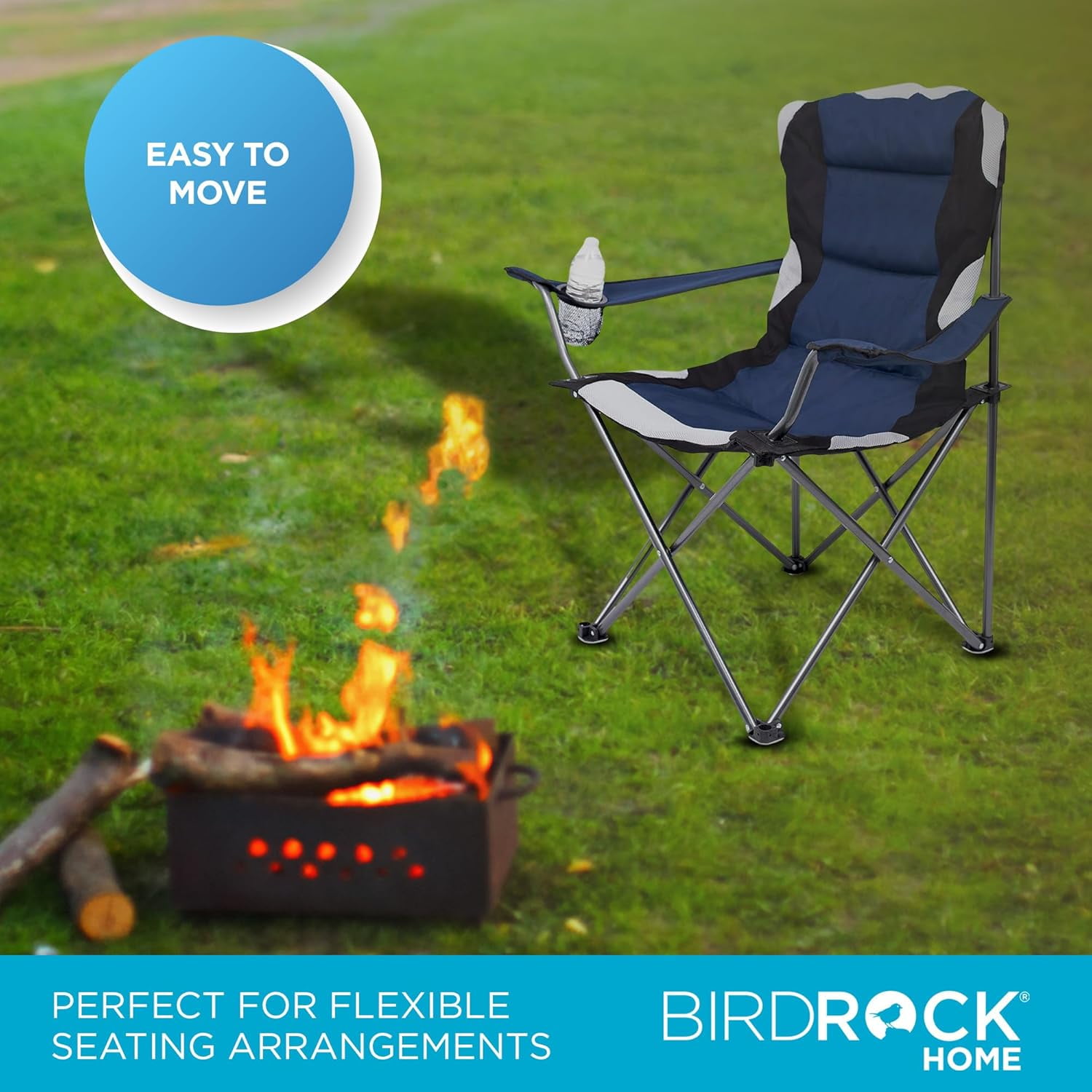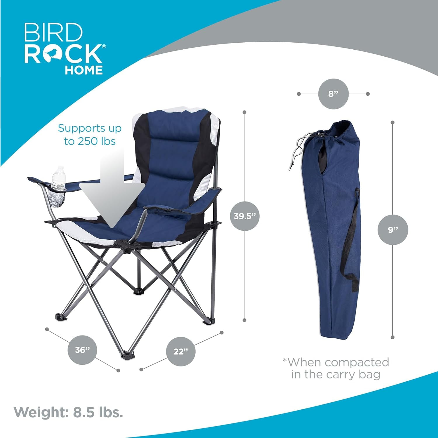 Product Description The INTERNET’S BEST Padded Camping Folding Chair is your ideal outdoor companion for sporting events, picnics, and camping trips. Designed with a cushioned seat and back for ultimate comfort, it features a lightweight and durable steel tube construction, making it easy to carry with the included strap and portable carry bag. The high-quality 600D fabric is weather, water, and stain-resistant, ensuring reliable use in any condition. With a built-in cup holder for added convenience, this foldable chair is ideal for the park, beach, soccer, baseball, softball, and more. This chair measures 22″ L x 36″ W x 39.5″ H, compacting to 41″ L x 9″ W x 8″ H in the bag, and supports up to 250 lbs. The navy blue color adds a stylish touch to your outdoor gear.