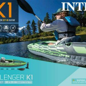 – The Intex Challenger K1 1-person inflatable kayak has a 220-pound capacity making it great for boating and fishing on lakes or mild rivers; The kayak only weighs 27 pounds and is U.S. Coast Guard I.D and TUV approved