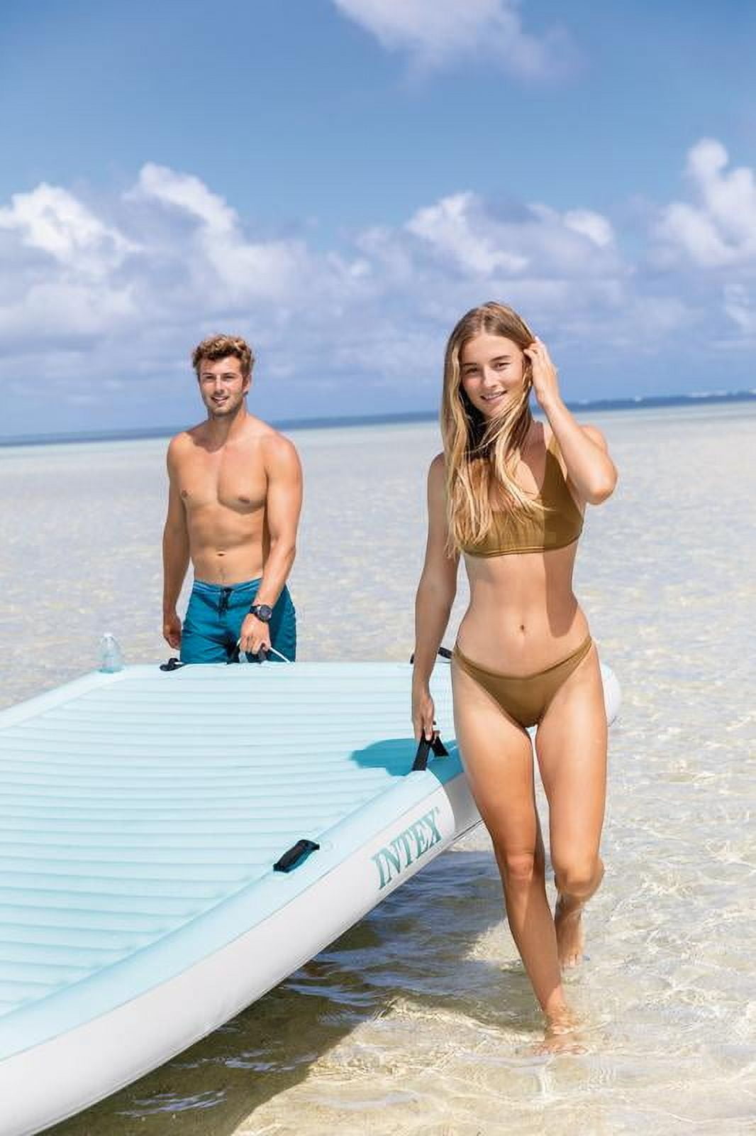Intex: Floating Water Lounge – (56289EP) Teal & White – The floating Intex Water Lounge offers a great way to enjoy your time out on the water. The beautiful color will be an attraction any time you have this item out on the water. Made with the Intex Fiber-Tech interior structure this item has the strength and durability to last. The huge surface area (122” x 72” x 7”) offers enough space to spread out and enjoy. It has 2 air chambers, 8 grab handles, and comes with 4 built in cup holders, so your beverage of choice is never too far away. The item is strong enough to support 880lbs.