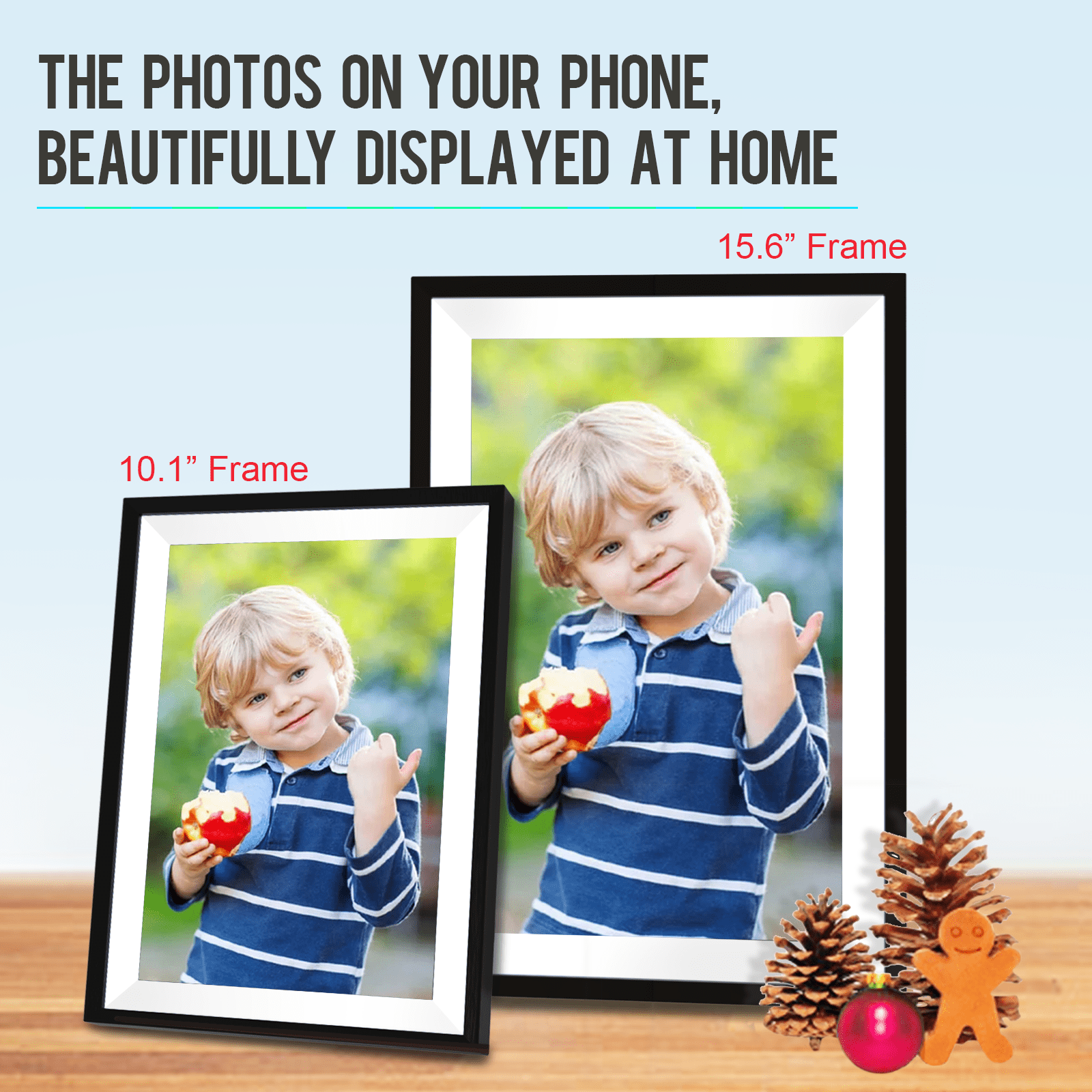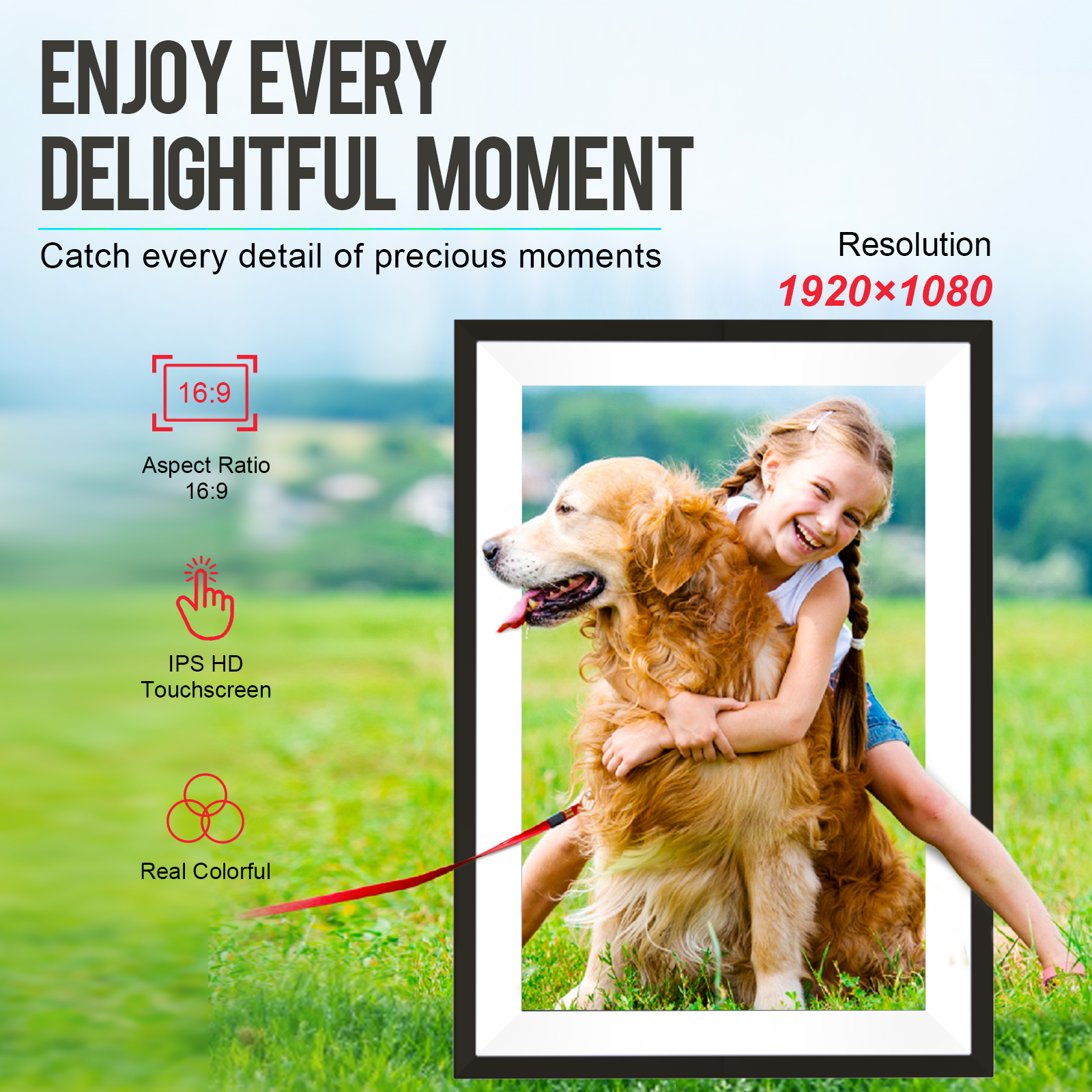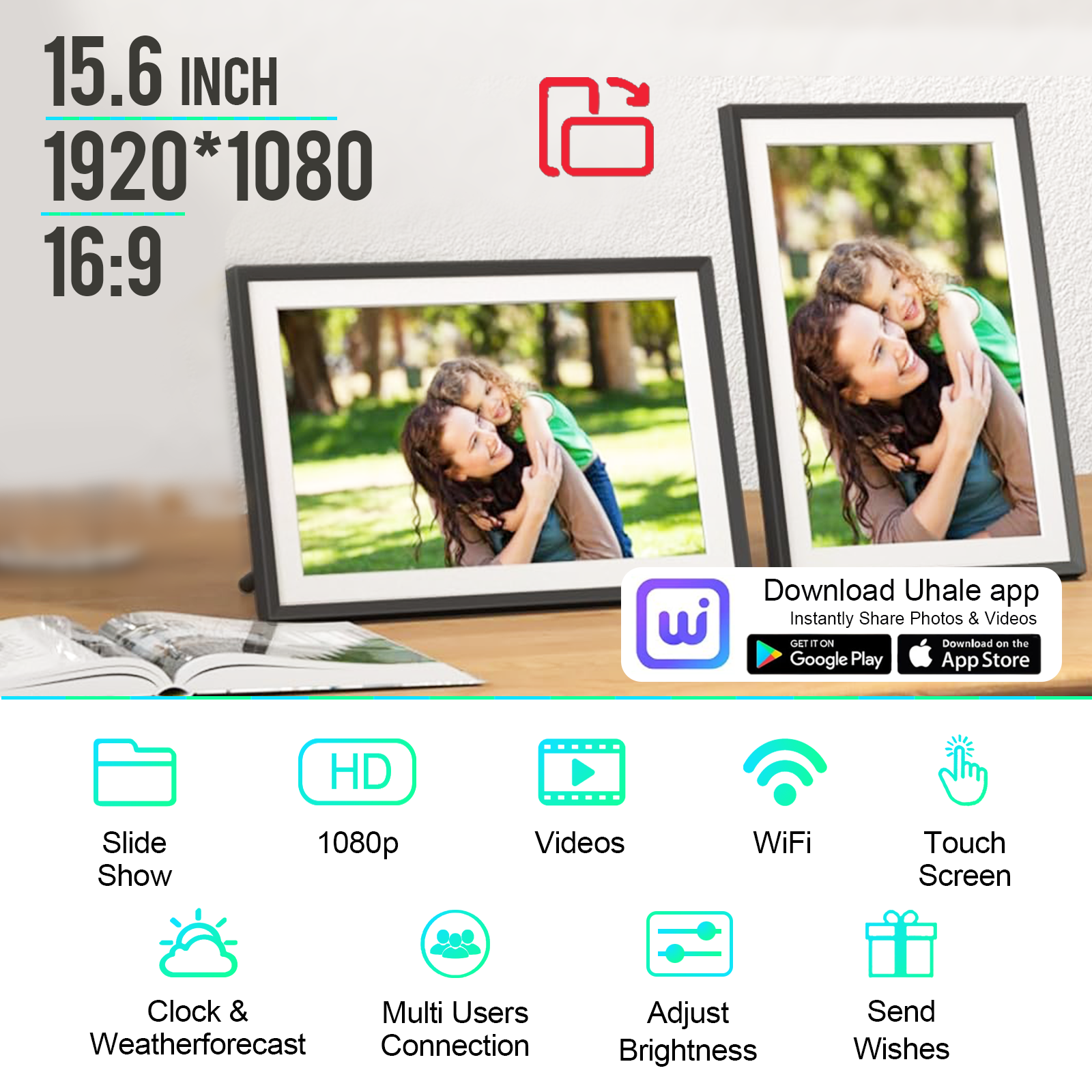 ?Private & Secure?IPRODA Digital Photo Frame’s cloud server is secure, encrypted, and GDPR compliant, so you can rest assured that your photo stream is safe and private. Invite unlimited users to share photos to your frame and photos and videos to their frames. Send precious photos or playlists to separate frames and set up your private home sharing network. ?IPS High Definition Touch Screen?The 15.6-inch large digital photo frame features a 1920*1080 IPS high-resolution touch screen, ensuring you get high-quality image display from various angles. Intuitive design with mounting holes that can be easily mounted on the wall for a better viewing experience. It can also be used as an advertising board for product marketing purposes. The user-friendly interface makes it easier to use than ever before for all ages. ?Large Storage Capacity?With built-in 32GB storage space and expandable SD card slot, you can share more than 40,000 photos with zero subscription fees. The auto-rotate feature allows pictures to adjust portrait or landscape orientation to fit your desired smart digital photo frame. ?UHALE APP SEND?WiFi digital photo frame shares photos or short videos (up to 15 seconds) from your phone through the “Uhale” app. WiFi photo frame supports JPG/JPEG/BMP/PNG image formats and MP4 video formats. Our WiFi photo frames and apps are available in a variety of languages. ?Sincere Gift for Loved Ones?Our digital photo frame is the perfect gift for loved ones of all ages. It’s also a great gift choice for Mother’s Day, Father’s Day, Thanksgiving, Christmas, birthdays, wedding anniversaries and other important days. Capture every precious moment and leave lasting memories. Sending a memorable image with a meaningful caption is sure to be an amazing way to express your feelings or confession.