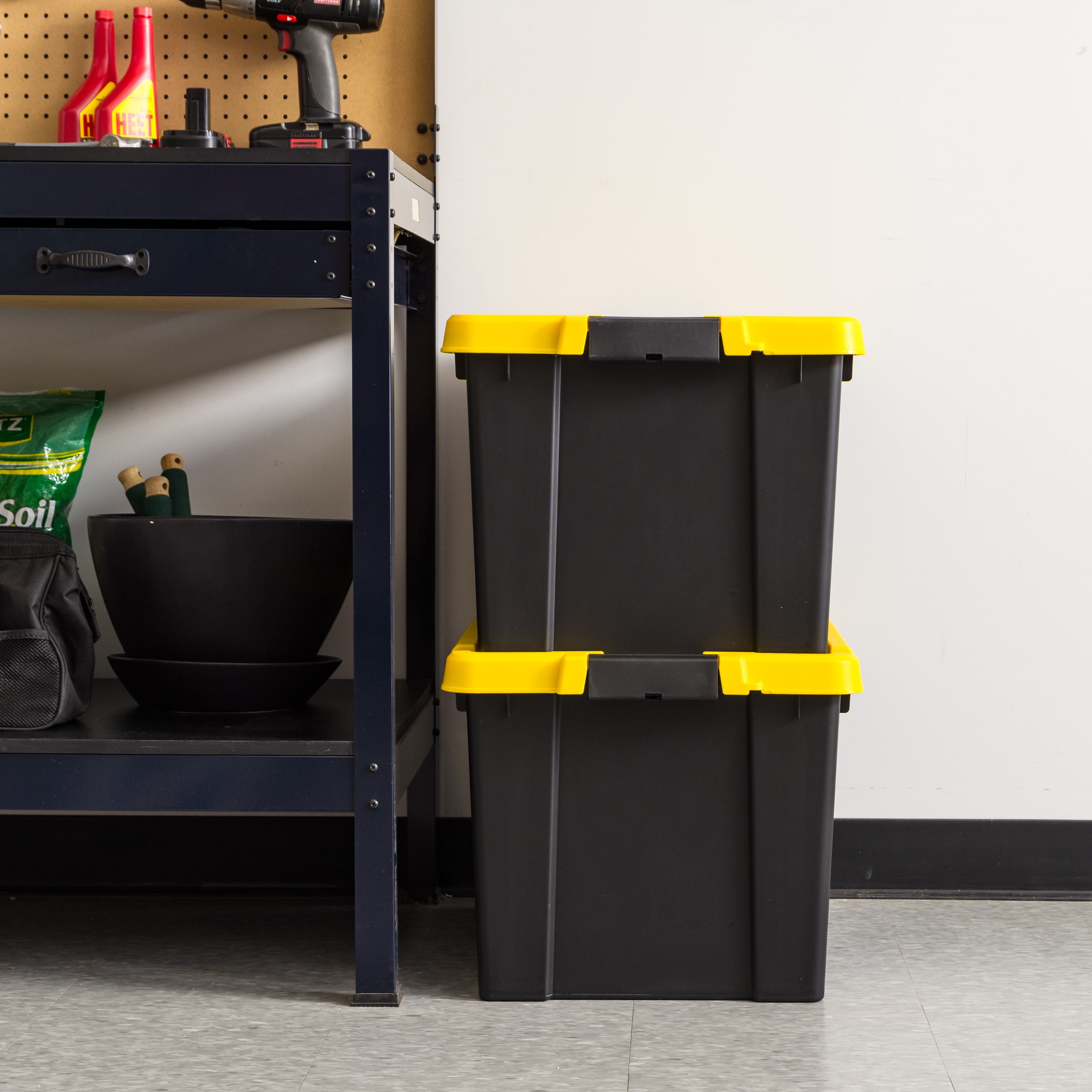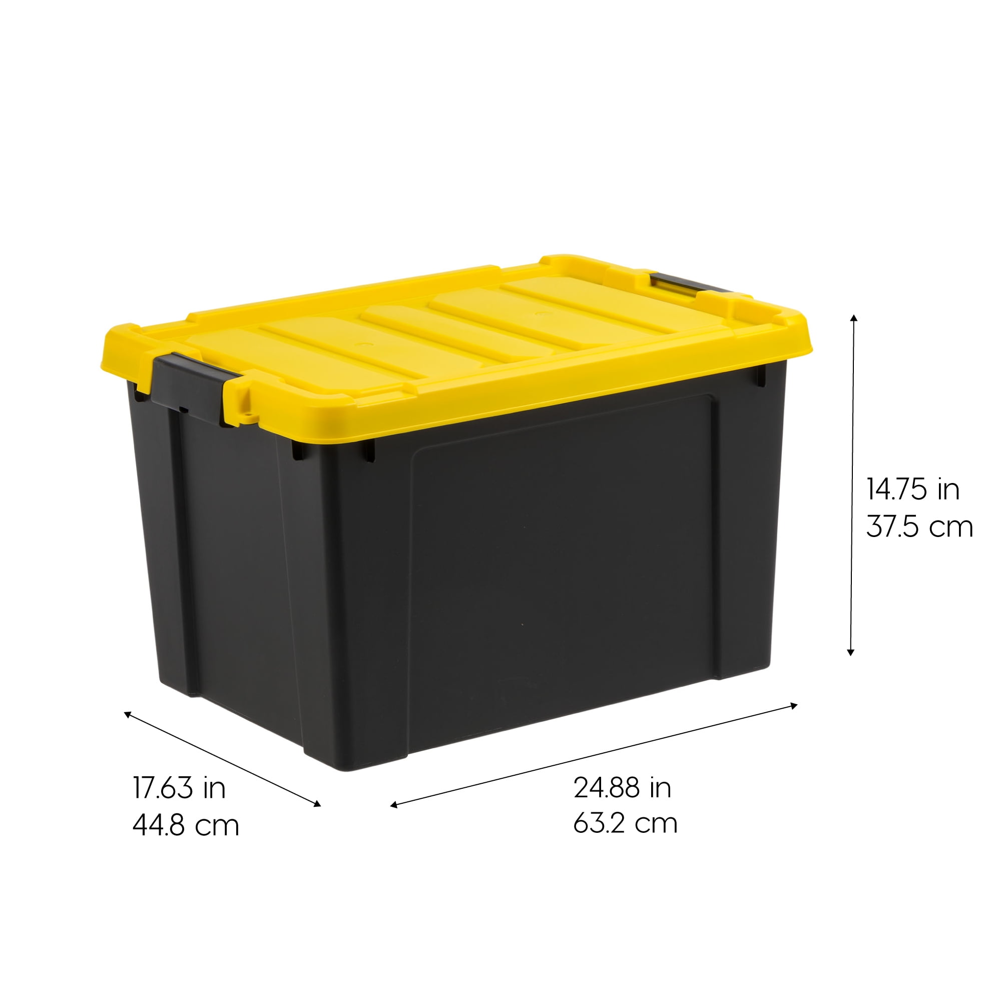 Transform your storage solutions with IRIS USA Heavy Duty Plastic Storage Bins with Lockable Lids, available in sizes 3 Gal, 5 Gal, 12 Gal and 19 Gal. These versatile utility totes are engineered to meet your toughest organizational challenges, offering secure and durable storage for tools, seasonal items, sports equipment, and more. Crafted from robust plastic, each bin is built to withstand heavy use, ensuring long-lasting durability in garages, basements, sheds, and beyond. The lockable lid design provides added security, keeping your belongings safe from dust, dirt, and moisture, while the secure latches ensure the lid stays firmly in place, even when stacked. Ergonomic handles make these bins easy to lift and carry, enhancing their practicality. Their stackable design maximizes storage space, helping you keep your environment neat and organized. Finished in sleek black, these bins offer a professional look that blends seamlessly into any setting, combining functionality with style.