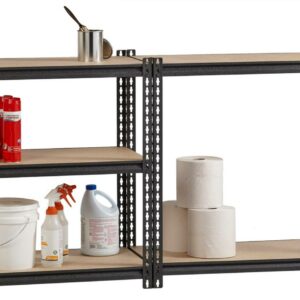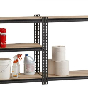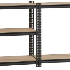 2300 Rivet shelving is designed for heavy-duty use. The boltless design allows for quick and easy assembly. The powder coated finish is rust resistant and durable. The Iron Horse shelving unit can be assembled either horizontally or vertically, depending on your storage needs. Each unit includes rugged particle board shelves. Steel five-shelf unit holds a total capacity of 2300 lb. evenly distributed. Assemble with a rubber mallet in less than 30 minutes. Shelving is made of heavy-duty riveted steel construction. Color: Black