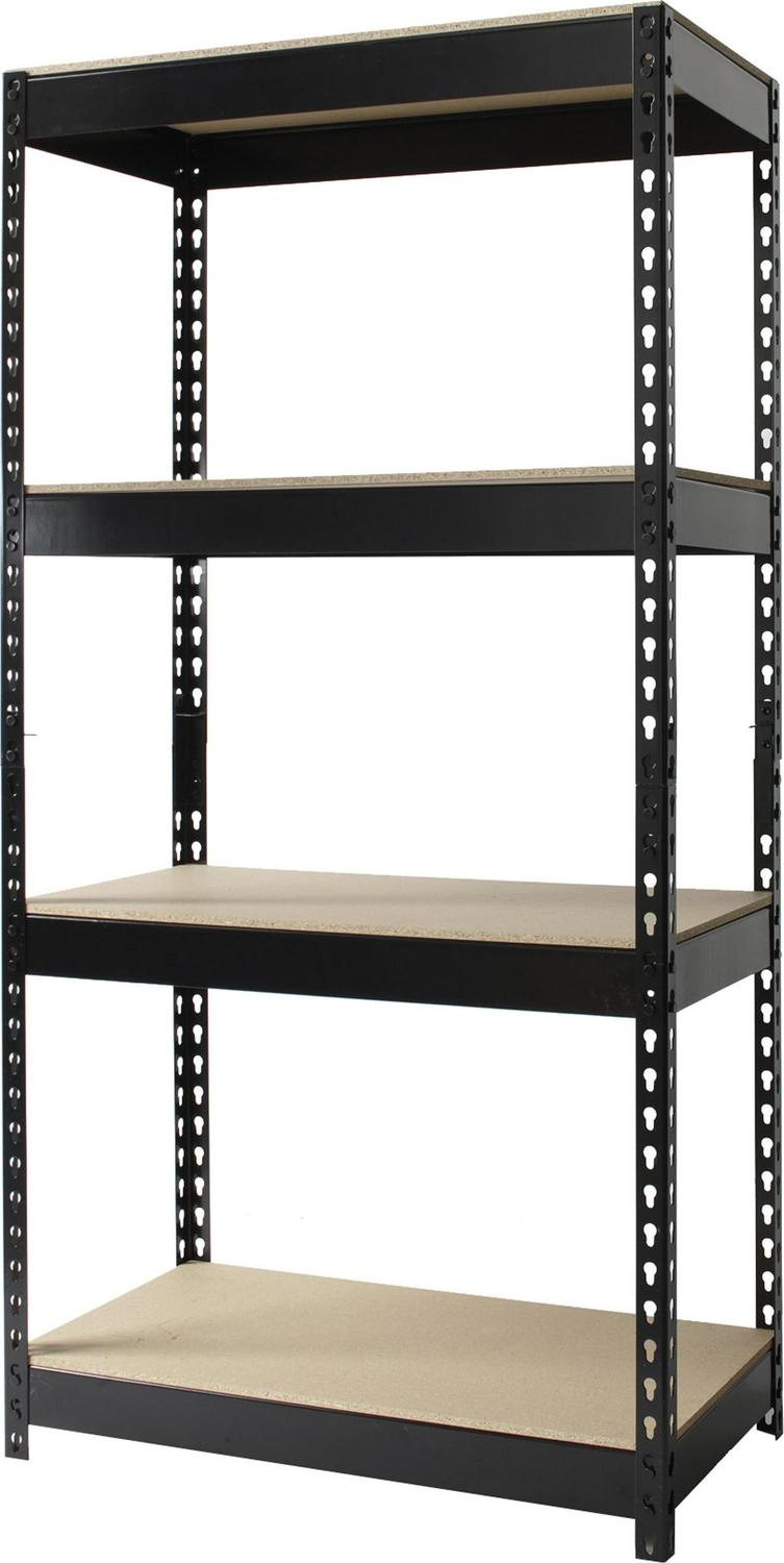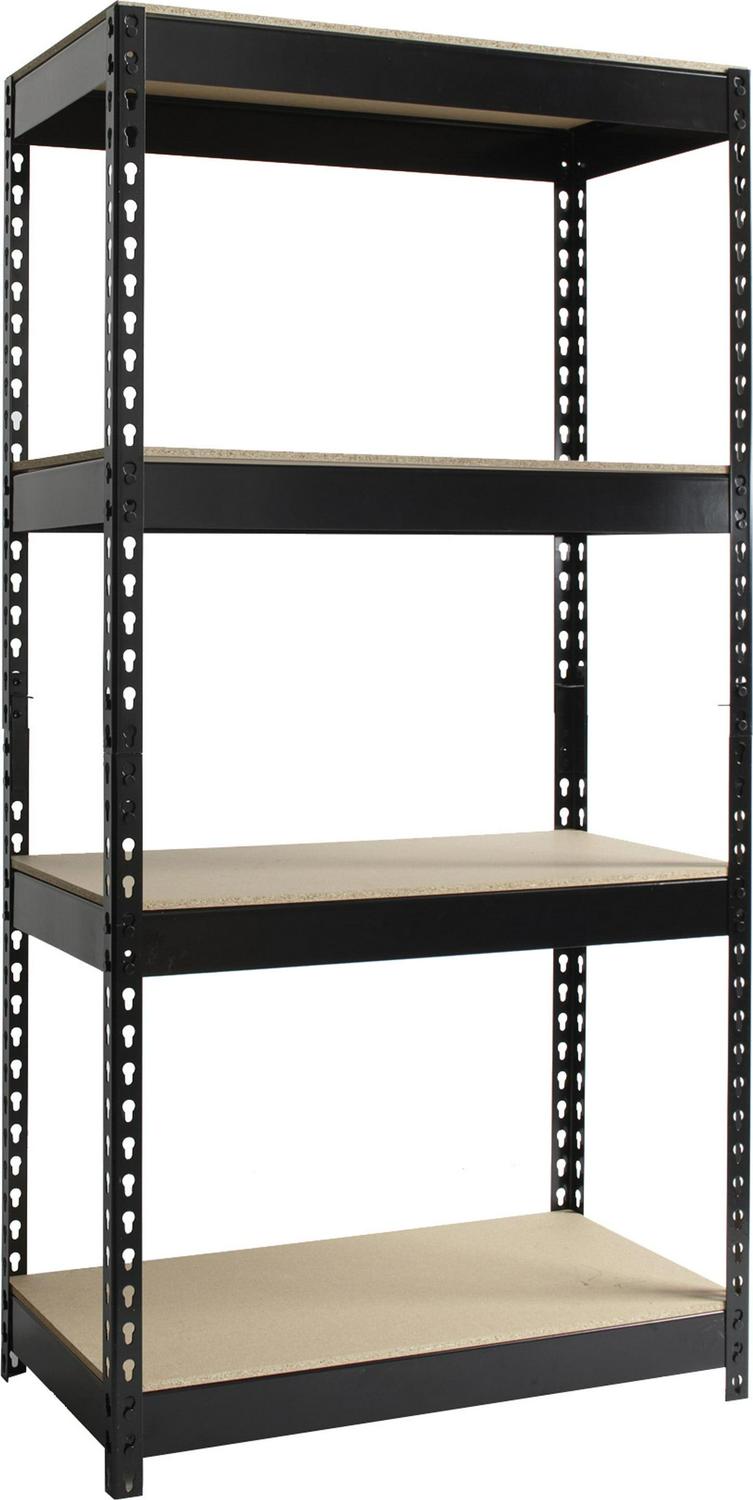 Iron Horse rivet shelving is designed for heavy-duty use. The boltless design allows for quick and easy assembly. The powder coated finish is rust resistant and durable. The Iron Horse shelving unit can be assembled either horizontally or vertically, depending on your storage needs. Each unit includes rugged particle board shelves. Steel four-shelf unit holds a total capacity of 3,800 lb. evenly distributed. Assemble with a rubber mallet in less than 30 minutes. Shelving is made of heavy-duty riveted steel construction. Color: Black