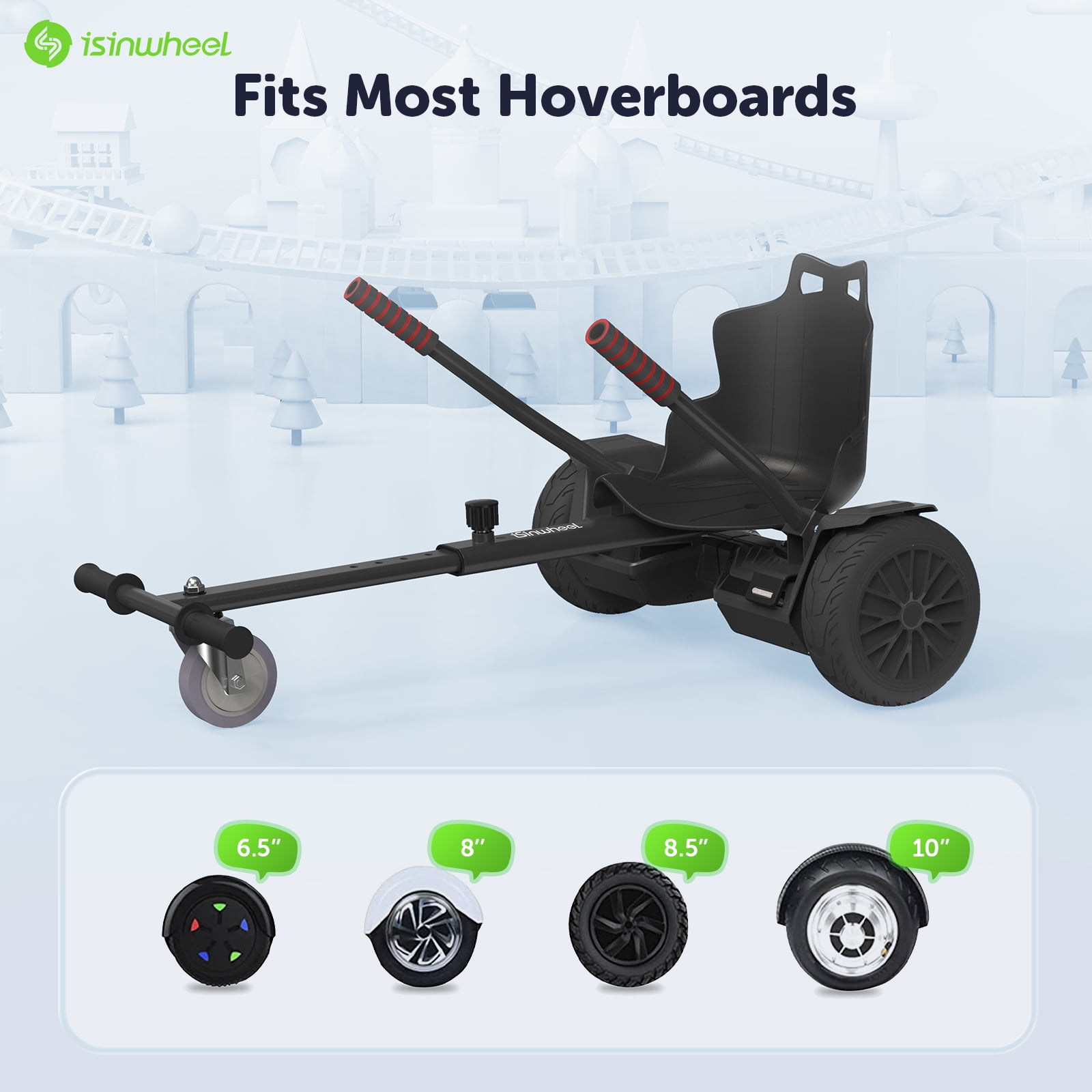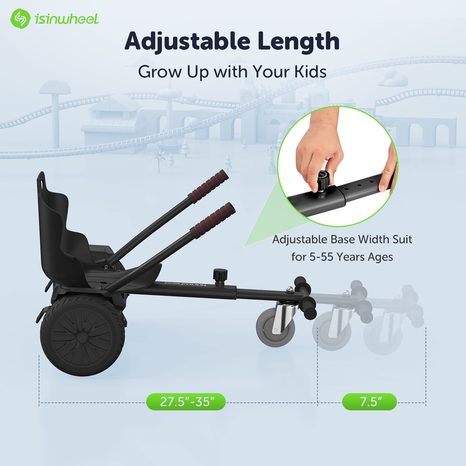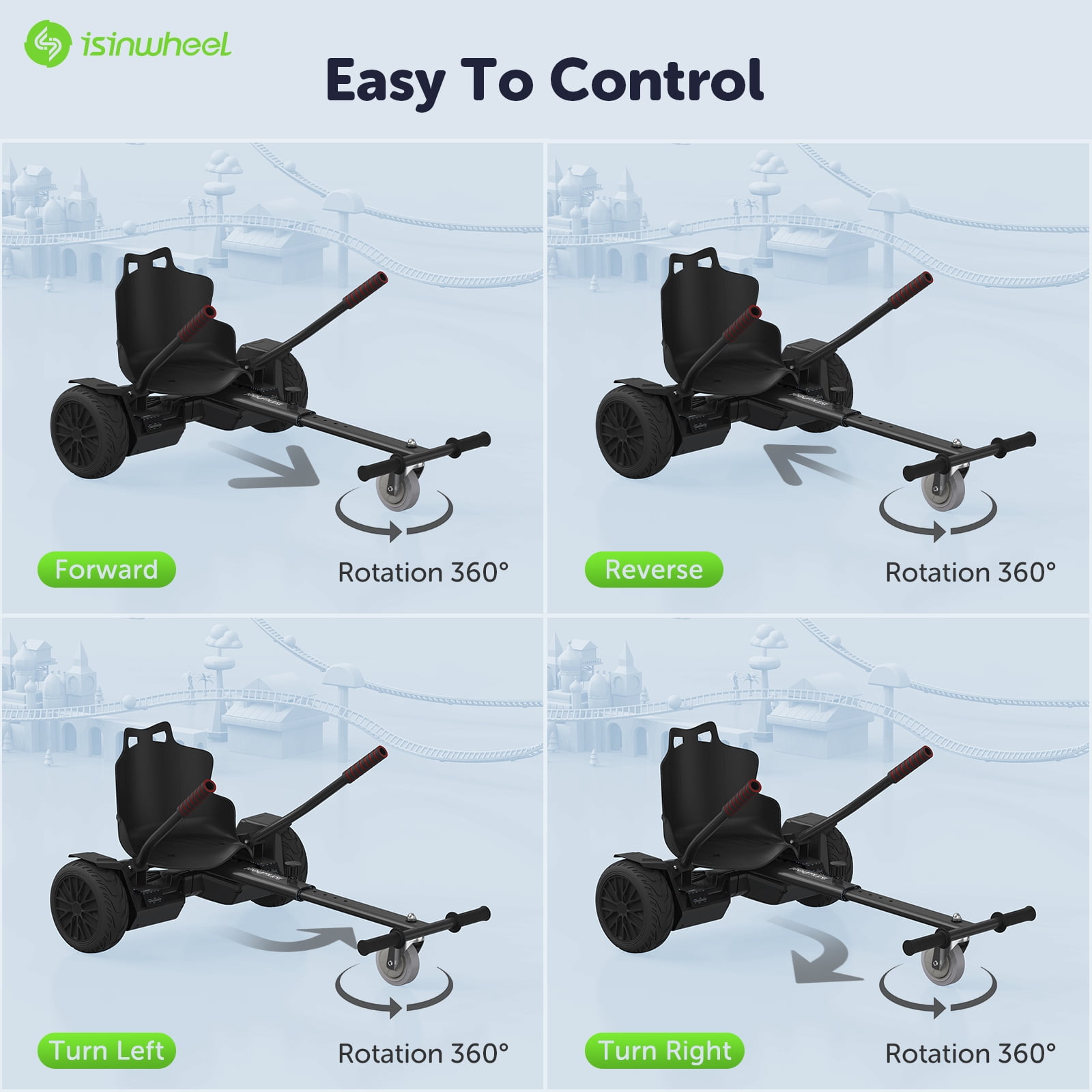 【Safe & Fun】Turn your hoverboard into a safe and more fun go-kart. Suitable for 6, 6. 5, 8, and 10-inch self-balancing scooters. (NOTE: Don’t fit the hoverboard which has a bar in the middle & Hoverboard is Not Included) 【Smooth & Controllable】isinwheel K3 hoverboard attachment has a 360° flexible swivel wheel and stable hand operation to provide power steering, which can help you control the directions super easily. Two handles can be used to control speed, braking, and turning, and you can also use the foot pads to control the direction of the hoverboard. Safer and Easier than on a hoverboard. 【Adjustable & Comfortable】Our hoverboard go-kart attachment has adjustable leg pedals from 27 inches to 35.5 inches. So you don’t have to keep buying new self-balancing karts because of their different heights, they will perfectly fit ages between 5-55 years. 【Easy To Assemble】Our hoverboard kart includes all the necessary mounting gear like screws, wrenches, nuts, washers, and other spare parts required for assembling the hoverboard cart. Almost fully assembled, you can refer to the instruction manual, and within 5-8 minutes, it’s ready to go. 【Quality Guarantee】The K3 hoverboard seat comes with 6 PCS free straps in case you need them, so you don’t have to worry about them breaking. It also comes with a one-year warranty.