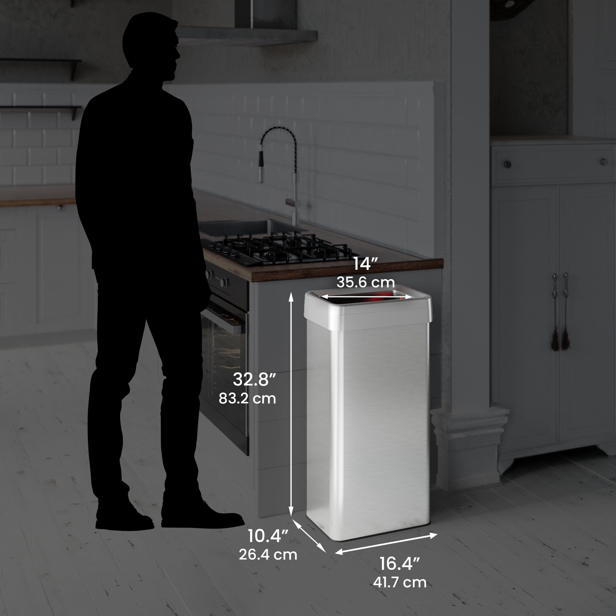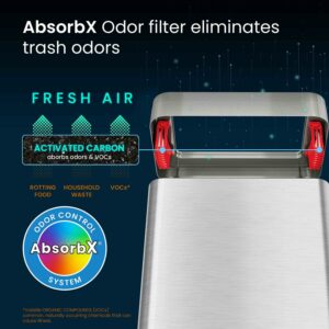 For Homes, Hotels, Offices The slim shape fits perfectly in the kitchen, against walls, at the end of tables, in the pantry, etc. Odor Control 2 Natural Carbon Odor Filters are included to absorb and neutralize trash odors, for a fresh and clean smelling area Fingerprint Proof Stainless Steel Body finish is resistant to fingerprints and smudges, for a clean and sophisticated look that complements any decor Easy Removal of a Full Bag Air Vents at the base create airflow to assist removal of a full bag.