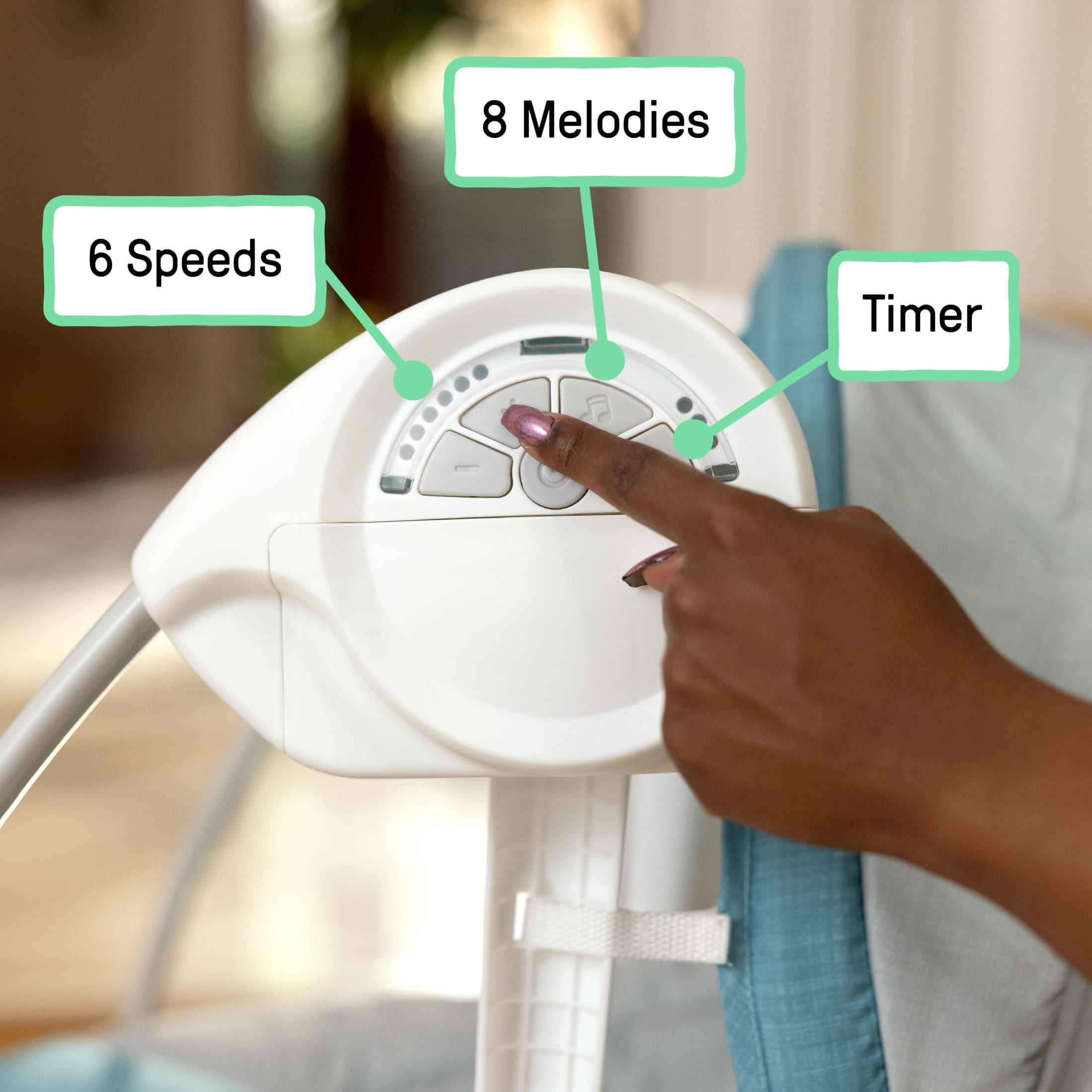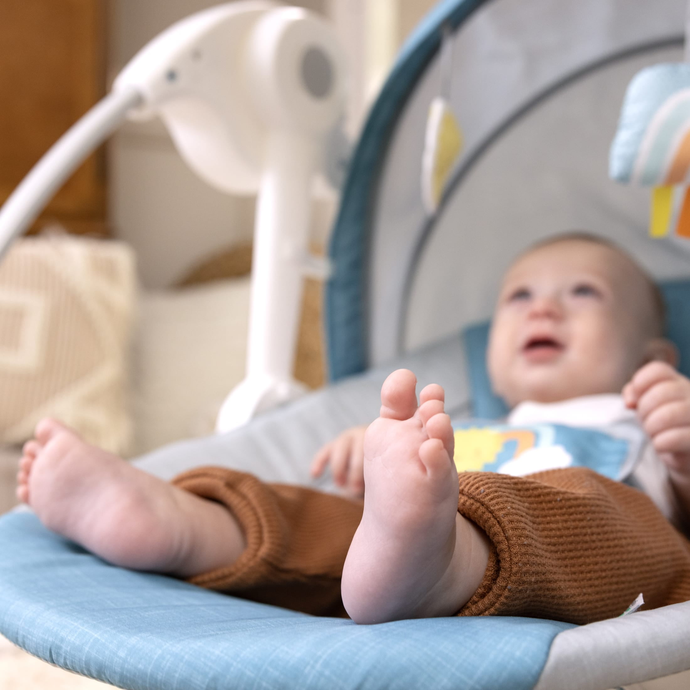 Simplicity meets versatile functionality with the ity by Ingenuity Sun Valley Canopy Portable Swing. This compact swing is ready to come along for the journey and entertain on the go with 2 toys (1 crinkle sun and 1 plush rainbow). This baby swing is equipped with a large, full canopy to provide your little one with comfort. The swing has 6 speed options and cutting-edge TrueSpeed weight-sensing technology with a timer. Keep baby comfy thanks to the 2-position reclining seat. The removable seat pad is machine-washable. Entertain baby with music from a selection of 8 melodies. This swing’s lightweight and foldable design has an integrated handle for easy transport and storage. The swing is battery-operated for ultimate portability (4 C batteries, not included). Keep baby safely secure with the adjustable 5-point harness. The assembled dimensions are 26.77″ x 22.64″ x 28.74.” For ages 0-9 months or up to 20 pounds, whichever comes first. This portable swing is a top-notch baby shower gift!