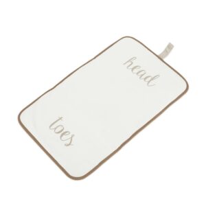 – Coordinating easy wipe changing pad included with whimsical “head” and “toes” printed on the inside.