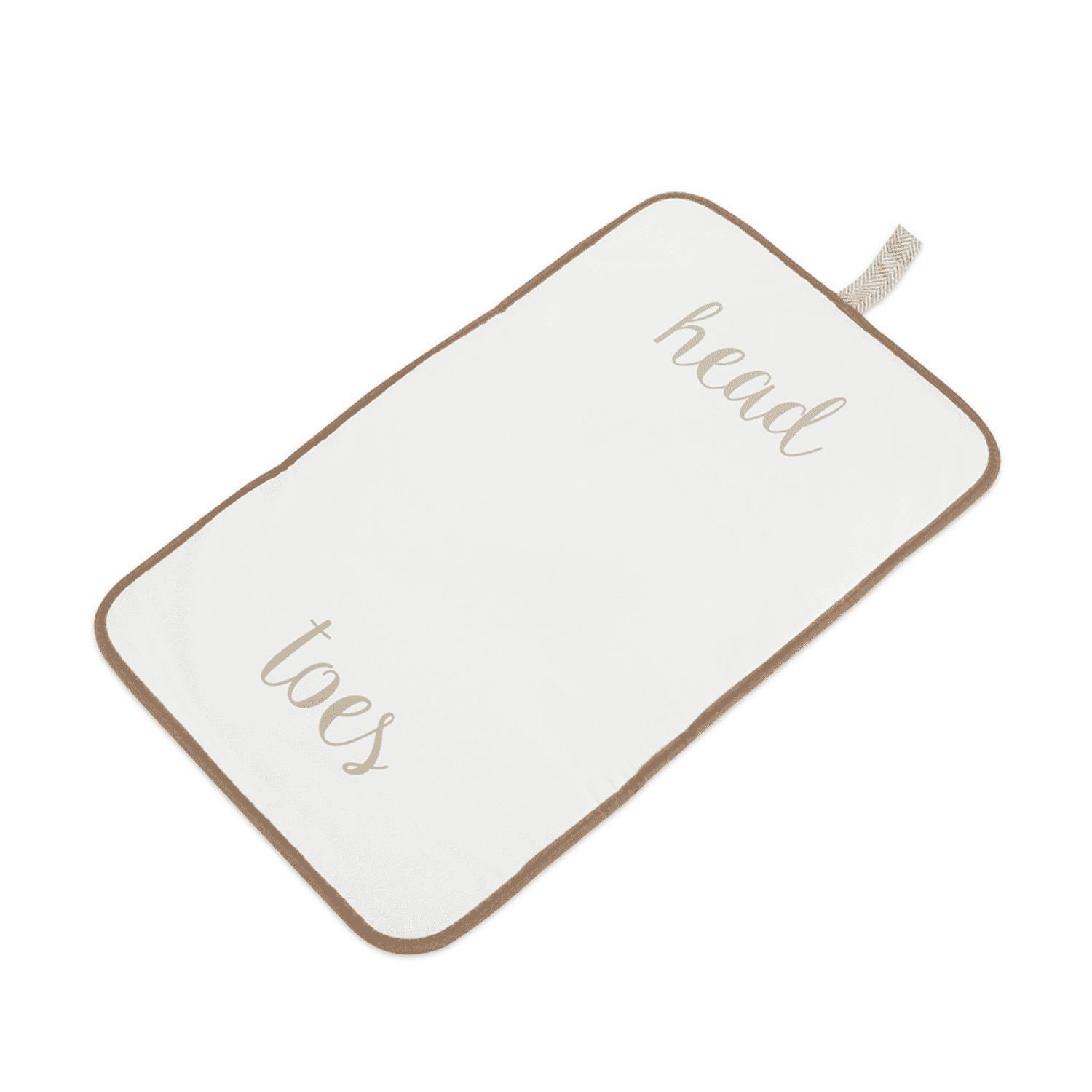 - Coordinating easy wipe changing pad included with whimsical “head” and “toes” printed on the inside