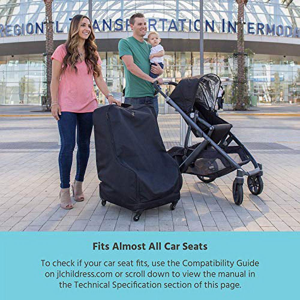 The J.L. Childress Spinner Wheelie Deluxe Car Seat Travel Bag has a combination of full padding to properly protect your car seat and four 360° spinner wheels will surpass your expectations. Use to protect your child s car seat from damage, dirt, moisture and germs when checked as luggage or gate checked. The multi-directional spinner wheels provide 360° upright rolling so you can push or pull the bag in any direction without needing to tilt. The Spinner Wheelie is fully padded and is constructed of durable, easy-clean and water-resistant fabric. It s easy to open and close with a full-access front opening, features high-quality dual, lockable zippers and a specially-designed bottom base with raised edges to help keep the car seat in place while rolling. Additional features include a top carry handle and clear ID card pocket. The Spinner Wheelie was designed to fit almost ALL brands and styles of convertible car seats, booster seats and infant car seats.