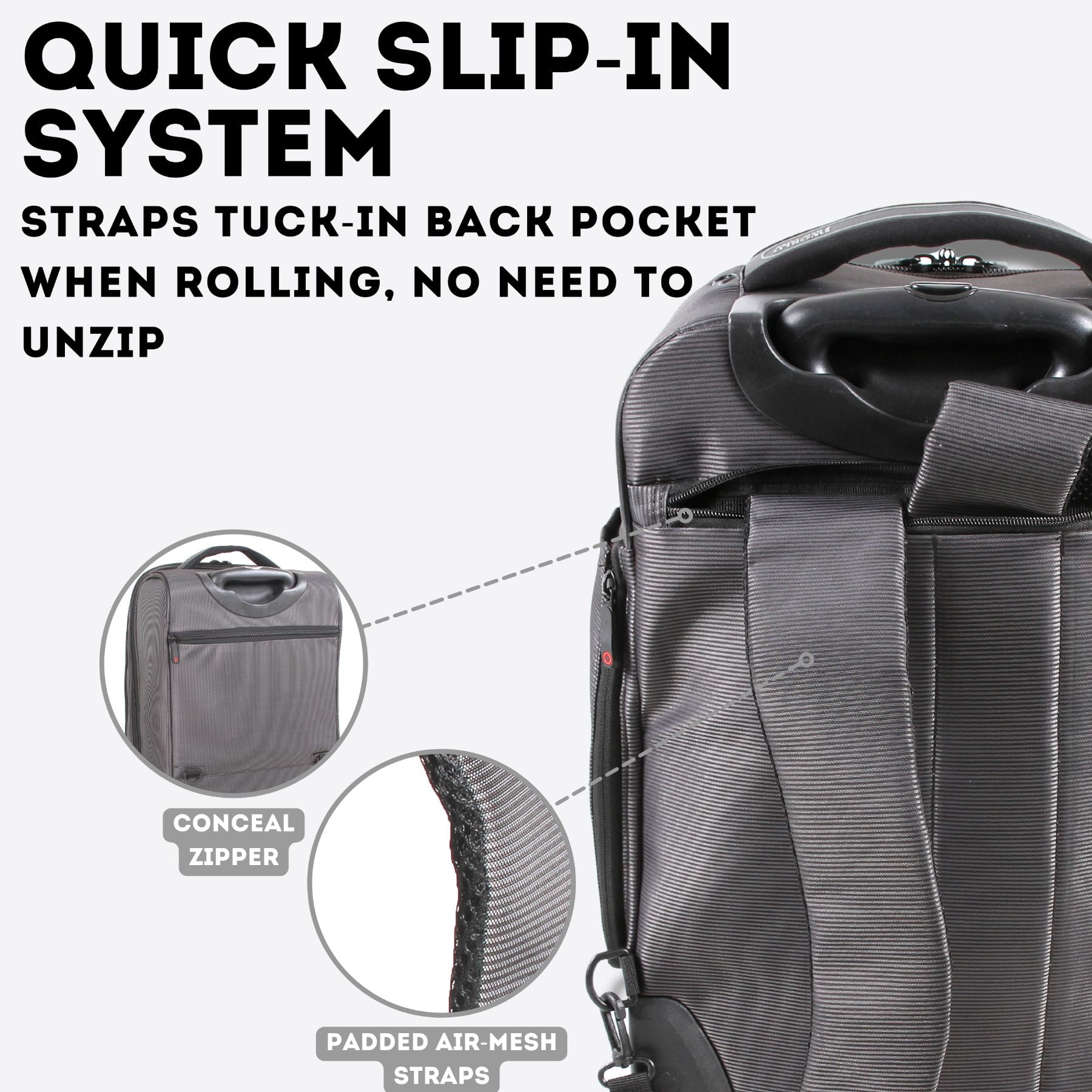 J World Ray Business Rolling Backpack features an expandable main compartment, a padded laptop compartment with side opening, padded top and side grip handles, air mesh cushion padded shoulder straps and back with slip-in system, and a front utility pocket.