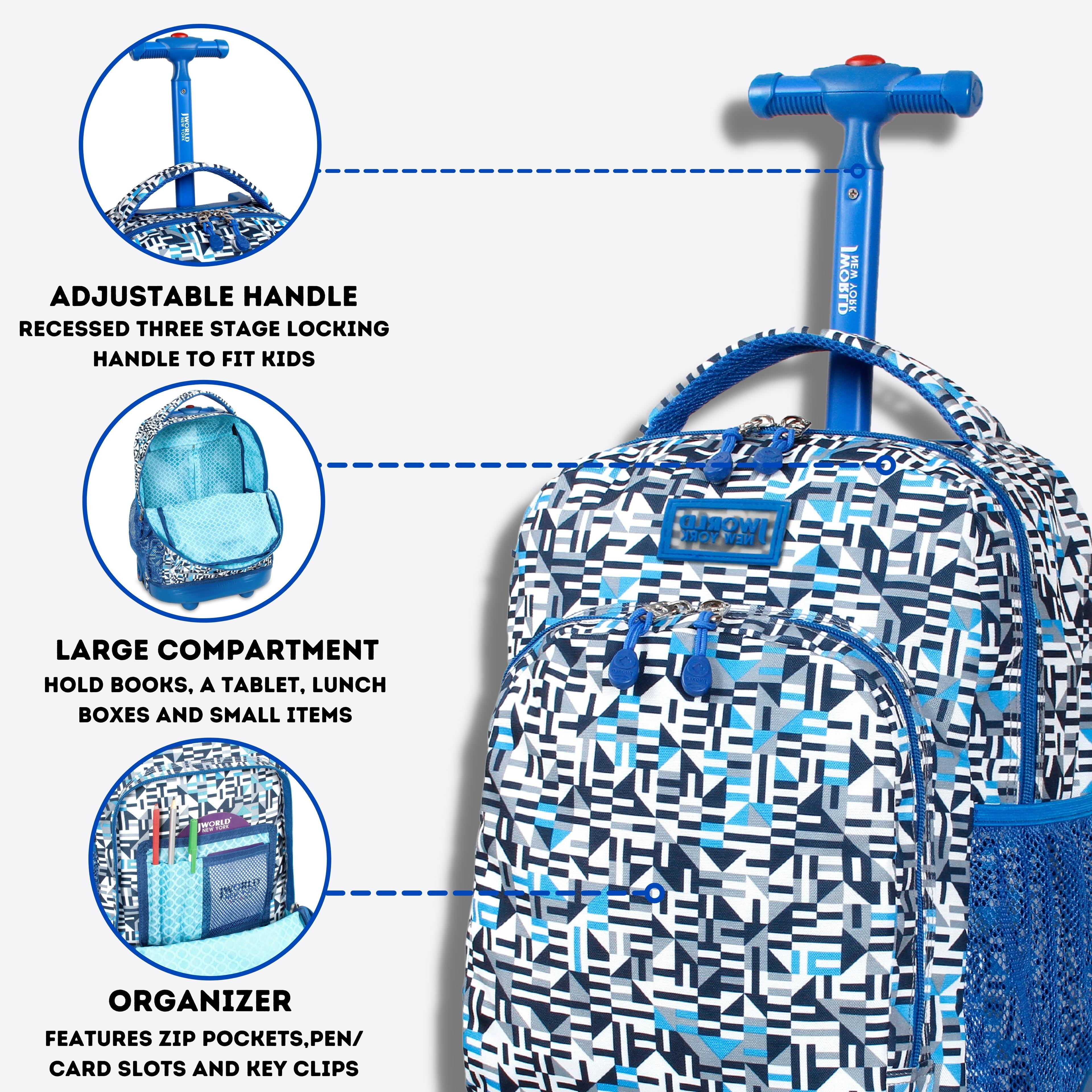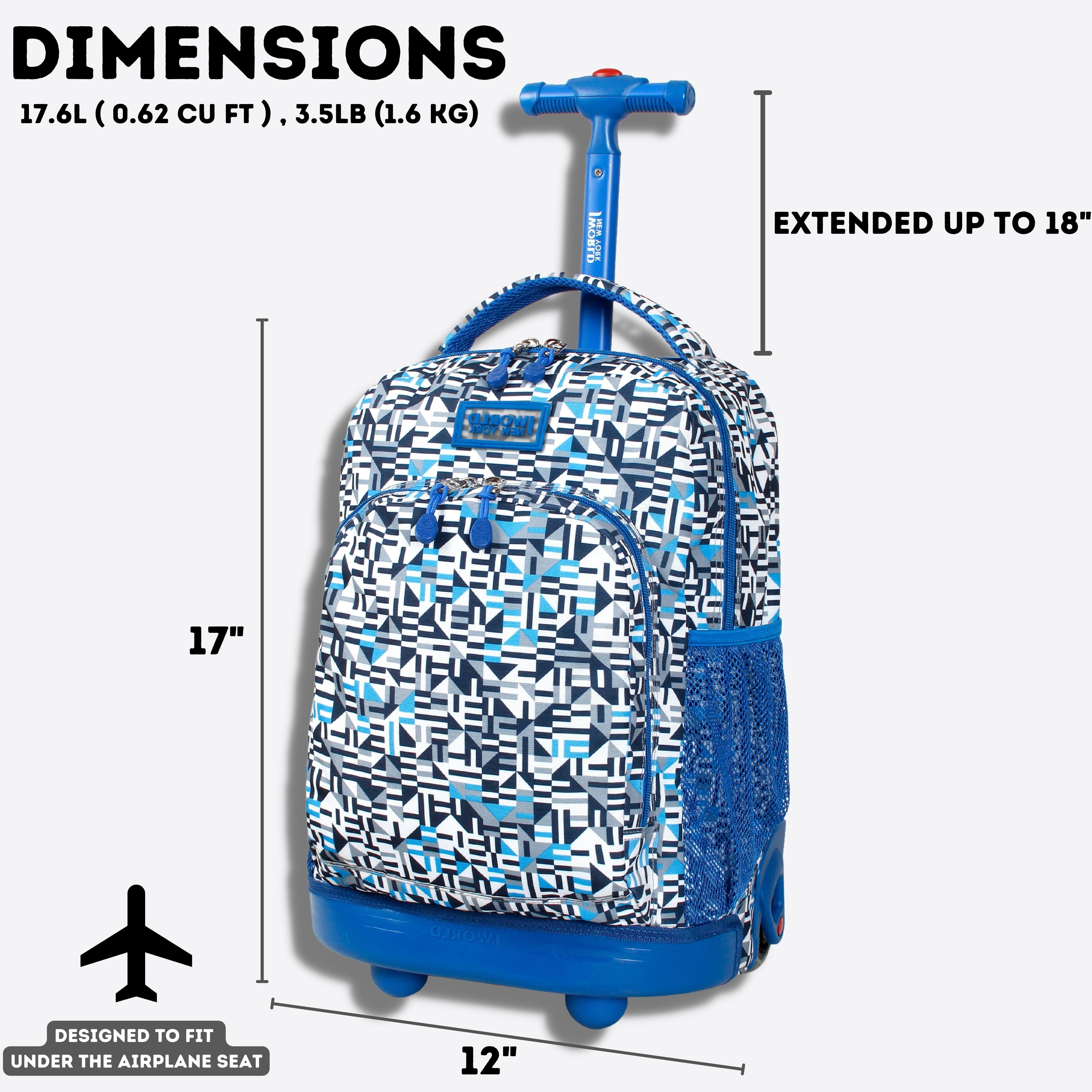 J World Boys and Girls Sunny 17″ Kids Rolling Backpack for School and Travel, Geo Blue