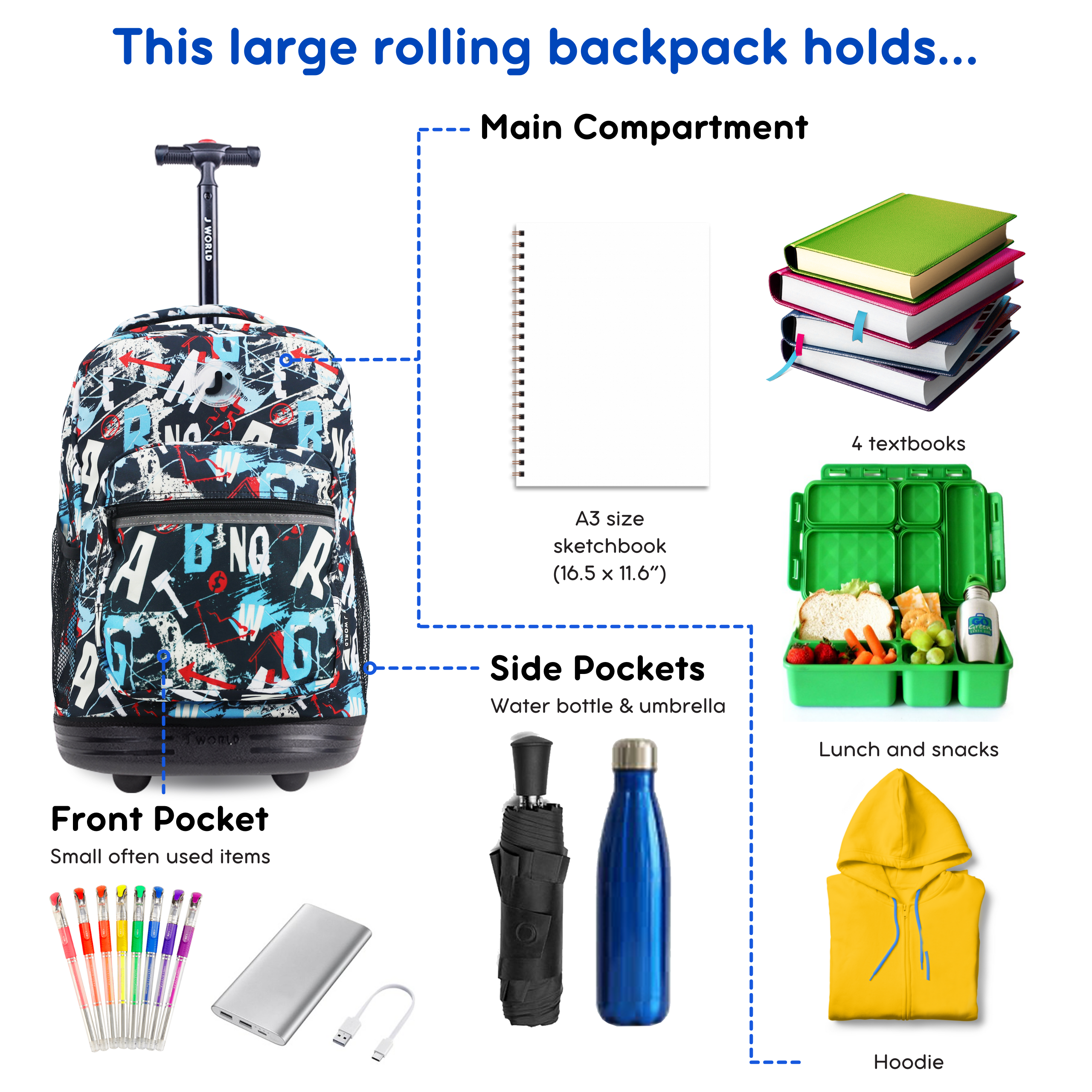 Rolling Backpack: Convertible wheeled backpack offers the load carrying ability of a rolling bag with wheels and the portability of a school backpack. For kids and adults who carry a lot Large Capacity: Main compartment holds 2 big text books, a laptop, lunch and many small items. Measures 18 x 13 x 9 inches. Use as underseat carry on luggage when travelling Organize: Front pocket organizer has a key clip, pen holders, card slots, and an internal zip pocket for keeping small items safe. Includes 2 mesh side pockets for water bottles Durable: Made of durable ripstop polyester fabric with a metal frame and reinforced edges, this backpack with wheels has a water resistant coating to keep your gear dry Adjustable Handle: Single-tube aluminum handle extends to 34 or 39 inches for easy maneuverability by kids and adults up to 6 feet 3 inches tall. Bag luggage handle stores nested in bag Shoulder Straps: Cushioned air mesh shoulder straps and back pad and a slip-in system for convenience. Or carry this rolling backpack like a suitcase with padded handle Smooth Rolling: Large rubber backpack wheels roll and turn effortlessly on sidewalks, paths and airplane aisles. Corner mounted wheels provide extra stability Size: 18 X 13 X 9″