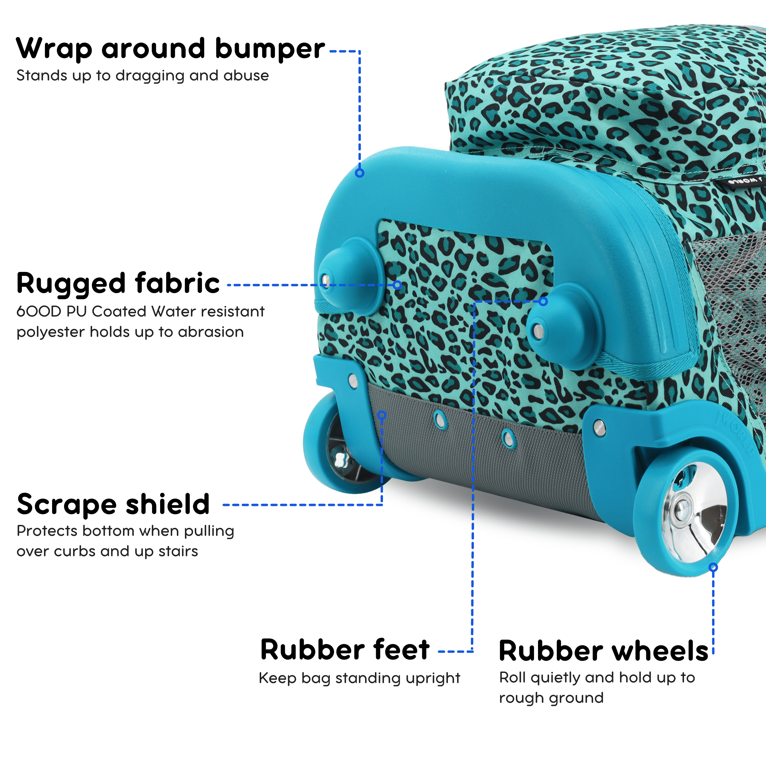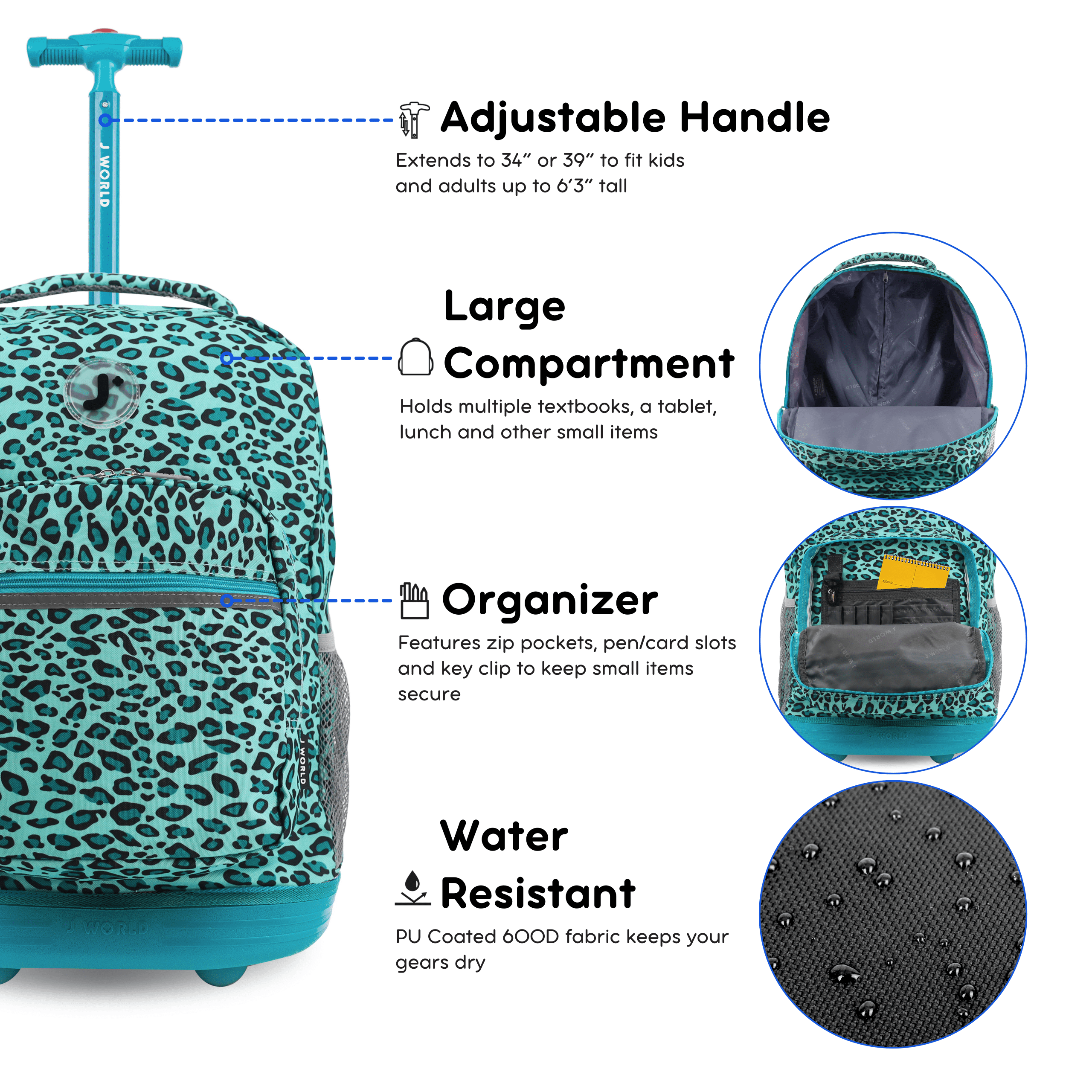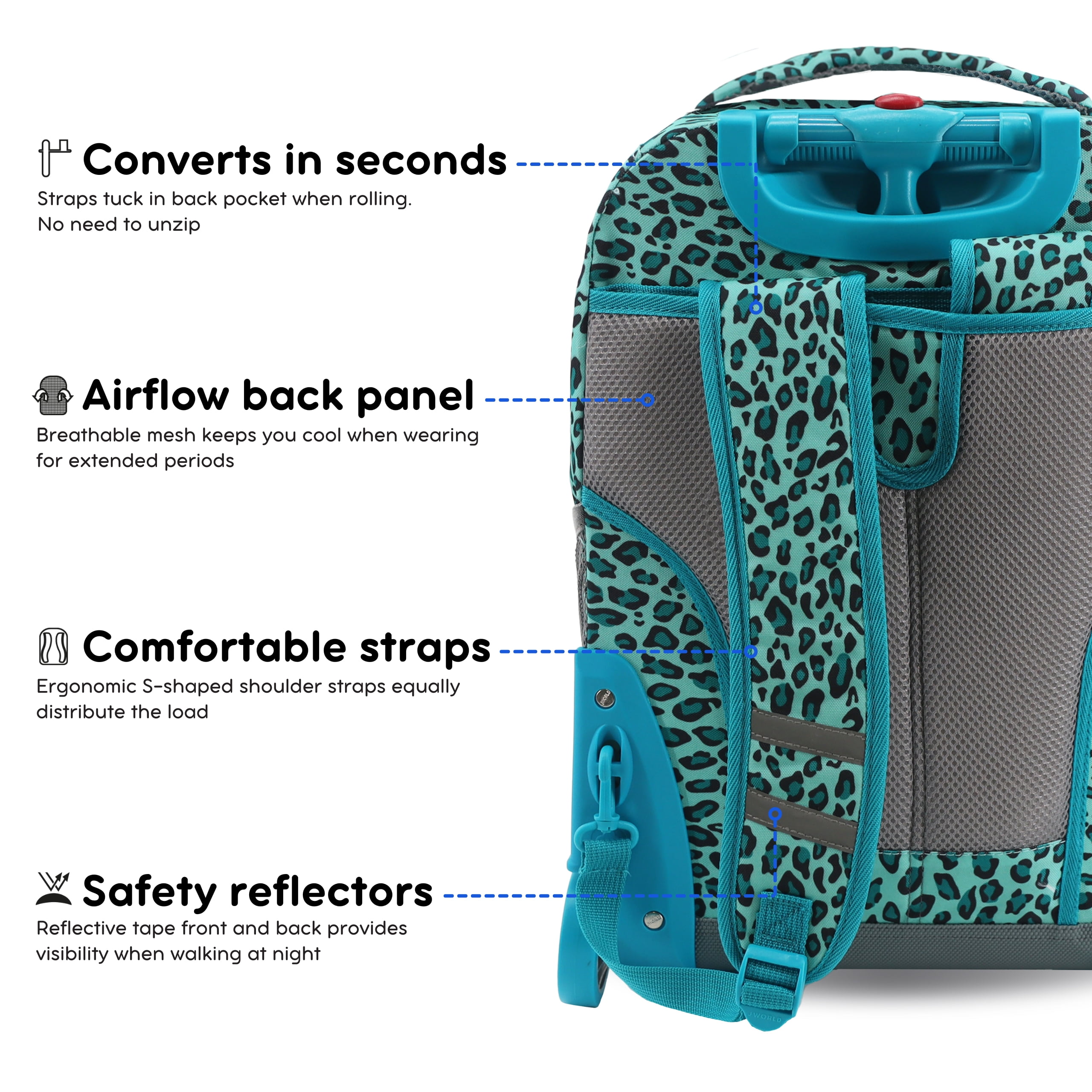 Rolling Backpack: Convertible wheeled backpack offers the load carrying ability of a rolling bag with wheels and the portability of a school backpack. For kids and adults who carry a lot Large Capacity: Main compartment holds 2 big text books, a laptop, lunch and many small items. Measures 18 x 13 x 9 inches. Use as underseat carry on luggage when travelling Organize: Front pocket organizer has a key clip, pen holders, card slots, and an internal zip pocket for keeping small items safe. Includes 2 mesh side pockets for water bottles Durable: Made of durable ripstop polyester fabric with a metal frame and reinforced edges, this backpack with wheels has a water resistant coating to keep your gear dry Adjustable Handle: Single-tube aluminum handle extends to 34 or 39 inches for easy maneuverability by kids and adults up to 6 feet 3 inches tall. Bag luggage handle stores nested in bag Shoulder Straps: Cushioned air mesh shoulder straps and back pad and a slip-in system for convenience. Or carry this rolling backpack like a suitcase with padded handle Smooth Rolling: Large rubber backpack wheels roll and turn effortlessly on sidewalks, paths and airplane aisles. Corner mounted wheels provide extra stability Size: 18 X 13 X 9″