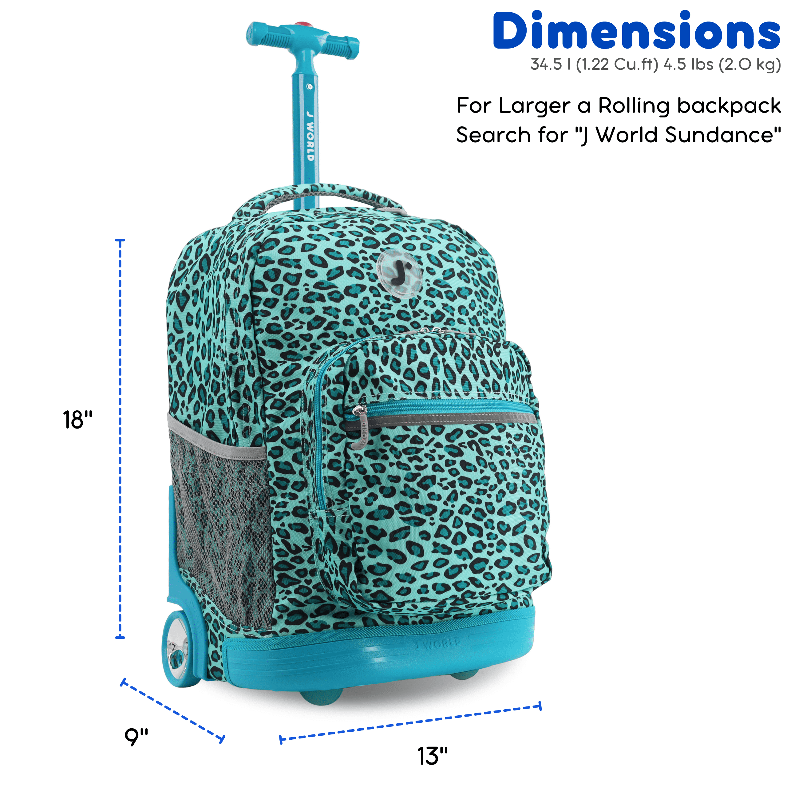 J World Girls Sunrise 18″ Rolling Backpack for School and Travel, Mint Leopard