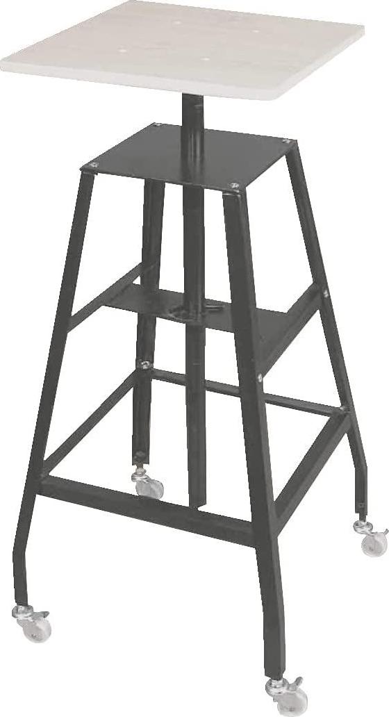 Built to handle heavy work in sculpture and pottery, this floor stand is made of steel. Adjustable center shaft raises from a height of 39.5 inches to 44 inches. The rotating working surface is a 12-inch square wood top. For the studio when working in Sculpture or pottery – or as a display stand.