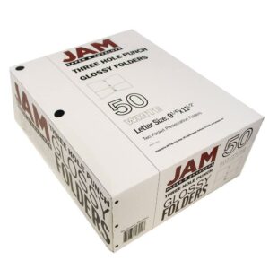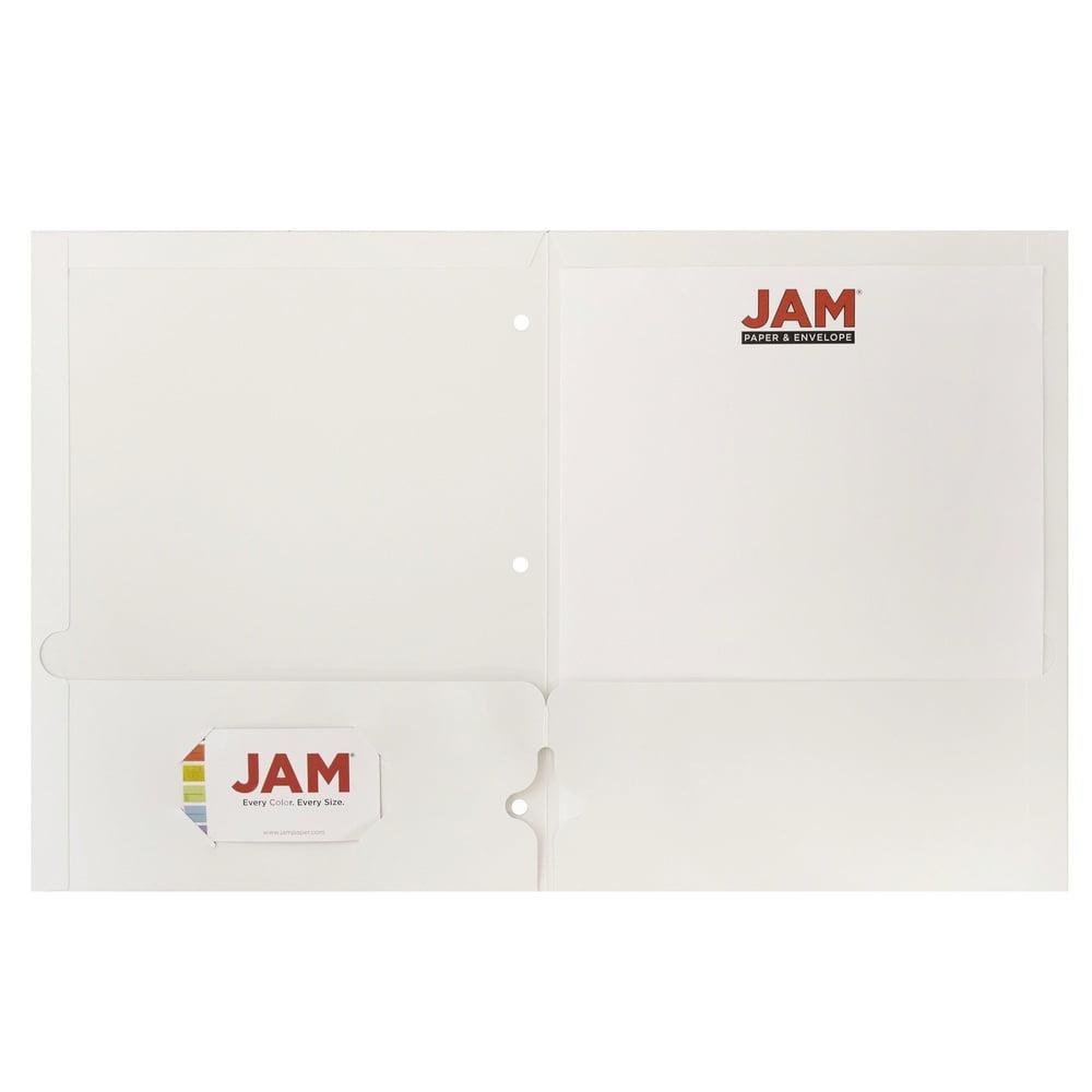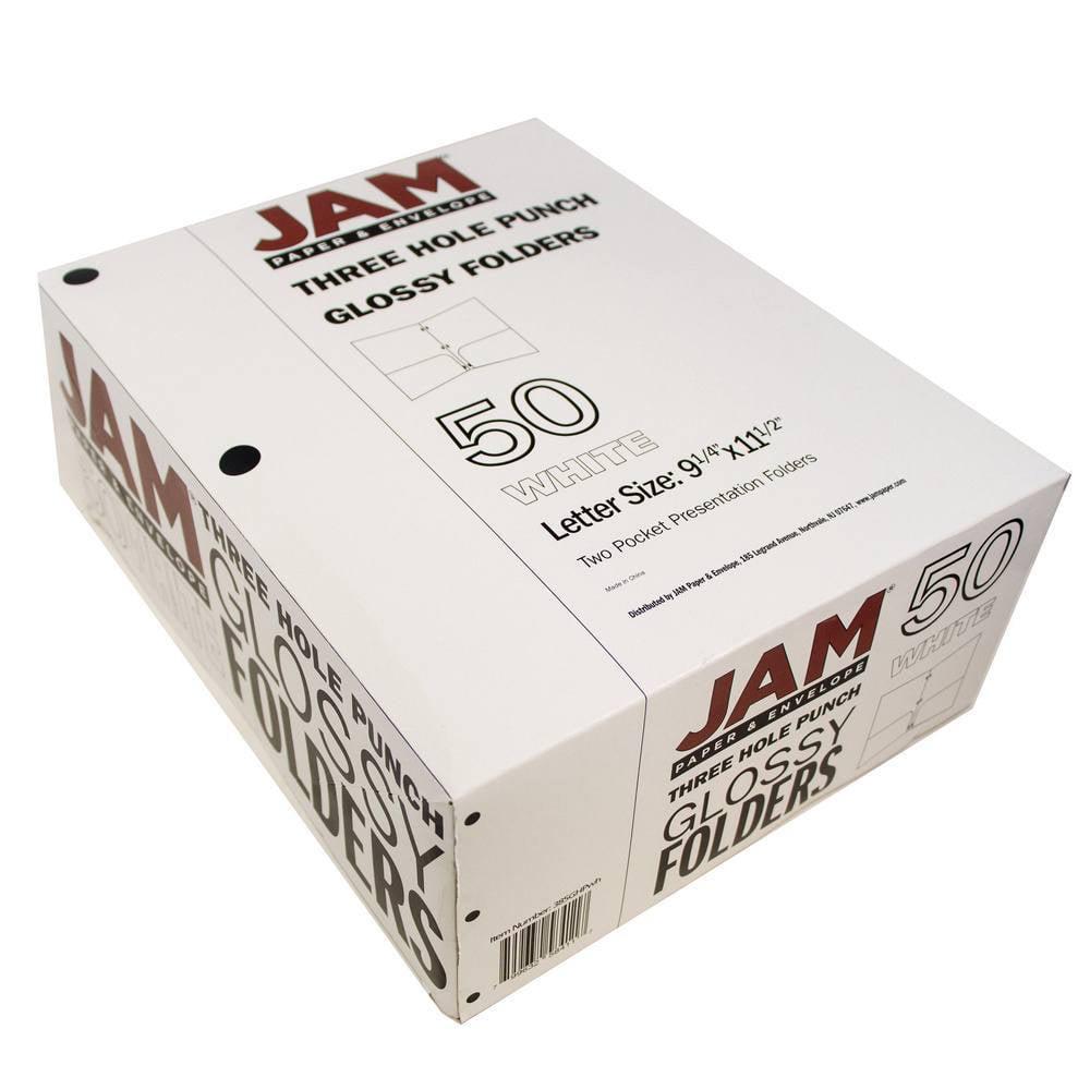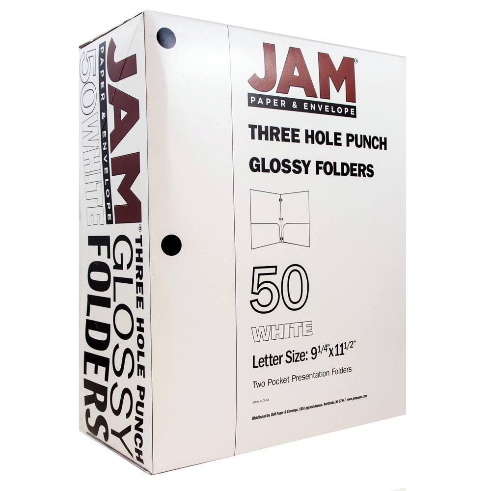 JAM Paper and Envelope Glossy 3 Hole Punch Folders, White, 50/Pack