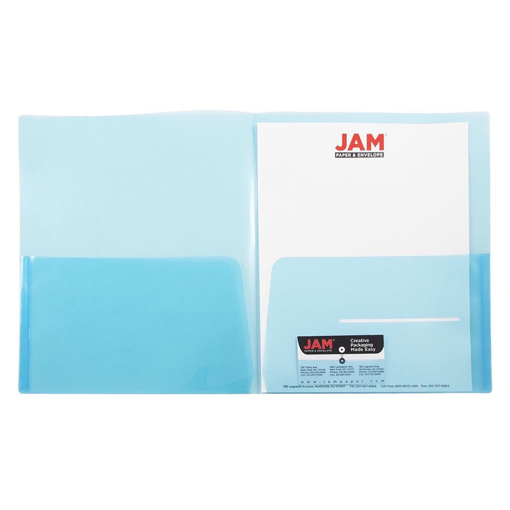 Supply your home business or office with high-quality poly presentation folders. JAM Paper Regular Weight Two Pocket Plastic Folders are made from top quality poly plastic material, making them both durable and light weight. They have a smooth texture and translucent blue color so they are both functional and comfortable to hold. Each folder has 2 pockets for holding your invoices, statements, or other presentation documents. These folders even have a slot for CD s and business cards so you will look even more professional at your next business pitch! Clients can see what’s inside with the light blue translucent plastic.