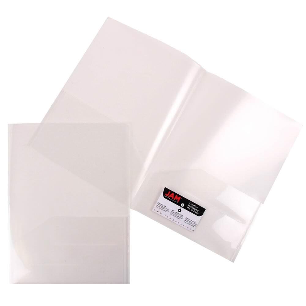 JAM Paper Regular Weight Two Pocket Plastic Folders. Smooth texture Regular Weigh Plastic Folders with slots for business cards. See what’s inside with a See Through Folder! Sometimes referred to as translucent folders, these lightweight See Through Folders have a smooth finish as well as a slot for your CD’s and business cards. Available in Yellow, Red, Smoke, Blue, Green, Clear, & Purple.
