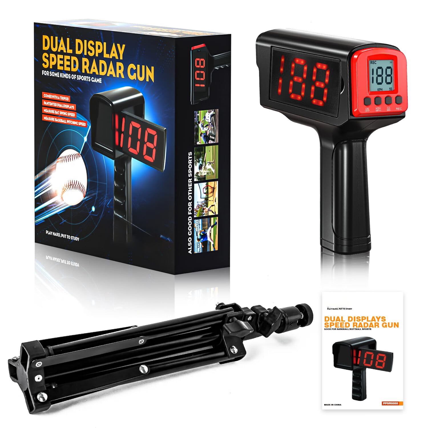 JASCOPRO Baseball hitting speed radar gun is the most accurate, clean and intuitive tool for any players/coaches to analyze pitching, hitting, and fielding. The radar gun is able to shoot and catch as low as 3 mph to as high as 150 mph,+/-1mph/kph accuracy. Perfect for baseball beginners or pros, individual training as well as team training. Material: Metal; Plastic Weight: 2.09 Pounds Product Dimensions: 11.69 x 11.22 x 3.43 Inches Power Supply: 6PCS AA batteries(Not Included) Tripod Adjust Height: 13- 21.6 Inch Speed Range/Accuracy: 3 To 150 MPH(5 To 199KM/H) Accuracy: +/-1MPH/KPH Packing Include: 1 X Baseball Pitching Gun 1 X Tripod For Baseball Pitching Gun