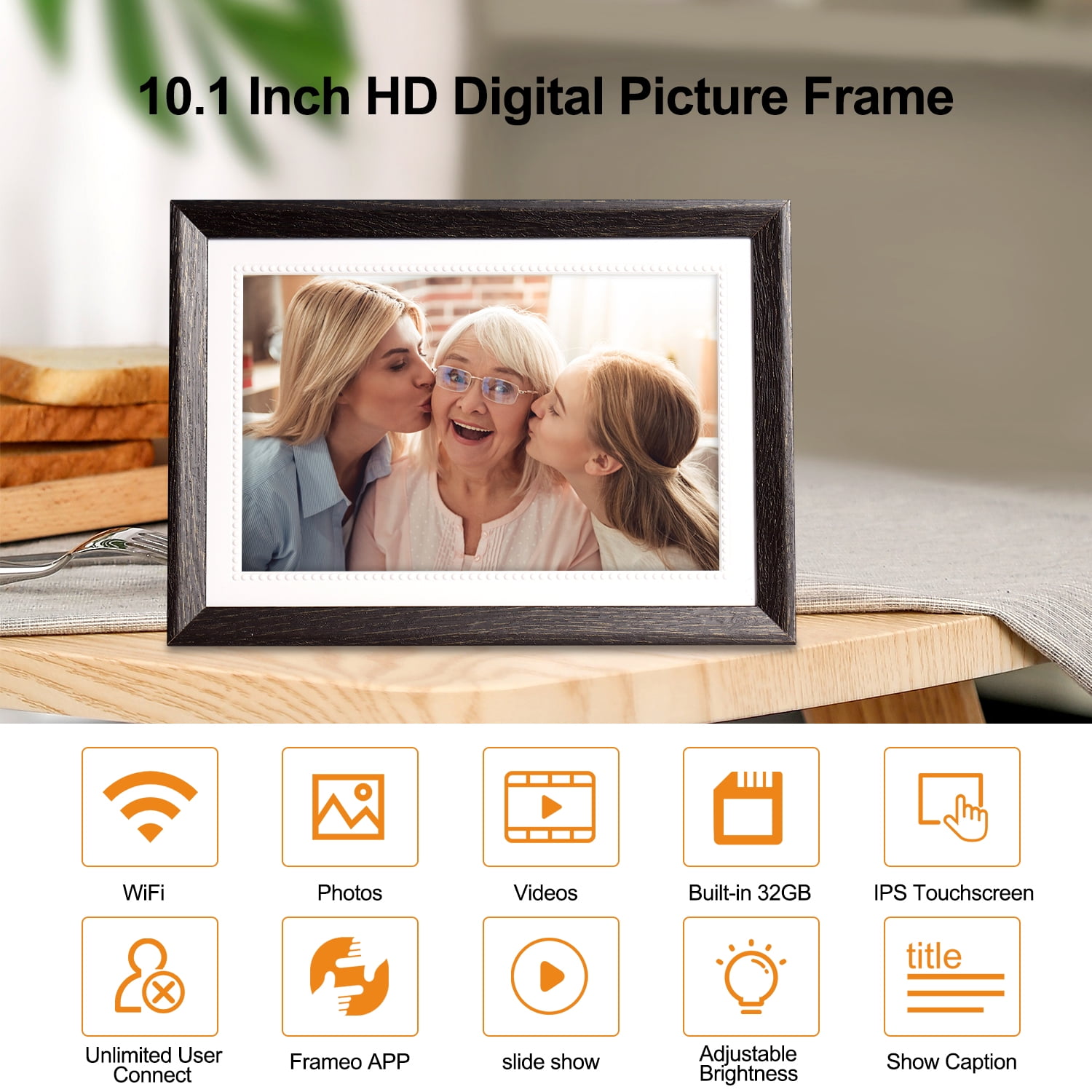 Instant wireless sharing: Smart digital photo frames can receive photos/videos instantly through the Wi-Fi network. You and your family and friends can share photos or videos to the photo frame through free Frameo APP, without any subscription fee. Auto Rotate & Large Storage: The WiFi electronic photo frame automatically rotates photos, allowing you to place the digital photo frame in portrait or landscape orientation, or mount it on a wall. Built-in 32GB of storage space (approx. 80,000+ photos). External SD card slot and USB port allows you to easily import or export multiple photos, enhancing the huge storage capacity. HD IPS Display and Touch Screen:This 10.1-inch wifi digital photo frame features a 1280*800 pixel IPS display with a viewing angle of nearly 180 degrees, allowing you to get a good visual effect from any angle. Just tap your finger to set up the wifi picture frame, browse photos, pause slideshow and adjust the brightness automatically. Easy to set up and use: The digital photo frame is equipped with a rotary touch screen, which can be set up with a tap of your finger, and you can use the digital photo frame by simply connecting it to Wifi. Easy to operate for Mom and Dad/Elders. Digital picture frame is best gift for family/friends: Digital picture frame is Frameo APP is completely free and supports unlimited data transmission of photos and videos. It is suitable for any group of people: Christmas,birthdays, weddings, graduation ceremony, mother’s day, father’s day, grandpa and grandma No matter where or how far away you are, you can feel that your family is by your side at all times. Digital photo frames are the best choice for gifts for mom.