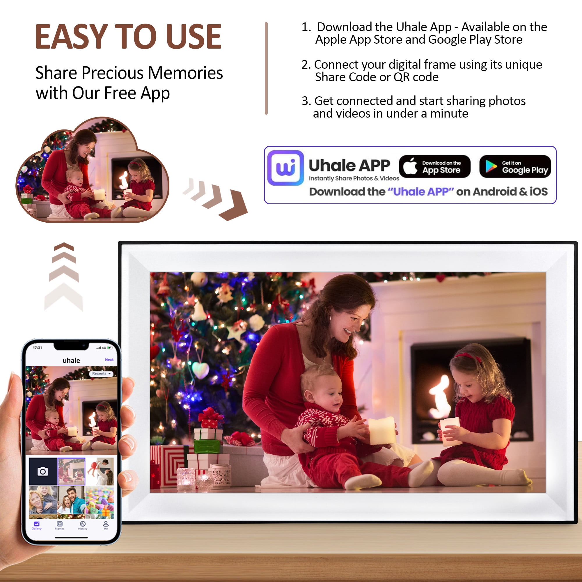 (15.6 inch Large Uhale Digital Picture Frame):It is more suitable for broadcasting group photos/wedding photos. 1920 x 1080 FHD IPS touchscreen delivers sharper images and beautiful visuals from any angle. Supports multiple image formats, including JPG/JPEG/BMP/PNG, and MP4 video format. You can also adjust the brightness and sleep mode settings to your liking. (Wall Mountable)The appearance is simple and suitable for different decoration styles.house warming gifts new home.digital photo album and digital calendar. (Free app): Uhale wifi digital photo frames comes with a free app called “UHALE”, which allows you to share photos/videos anytime, anywhere. digital picture frames load from phone,You can also send your best wishes to the photo frame through the app.You can send 500 photos at once from the webpage. (Easy To Use): The 15.6-inch smart digital photo frame features a user-friendly interface design and touch screen, making it easy to use even for the elderly and children. You can also invite an unlimited number of users to share photos and videos on the frame. If you don’t want to download the APP, you can use your computer or load all your photos onto a flash drive and then insert the flash drive into the frame. (The best gift):Wifi Picture frame 15.6 inch,digital frame you can send pics to,Every moment of longing can be shared.Gifts for Grandparents, Gifts for Mom, Birthday gifts, Wedding gifts, Christmas gifts. (One Year Limited Warranty):The electronic picture frame comes with a one year limited warranty. If you have any questions about our digital photo frames, you can contact technical support by email. We will be happy to help you!