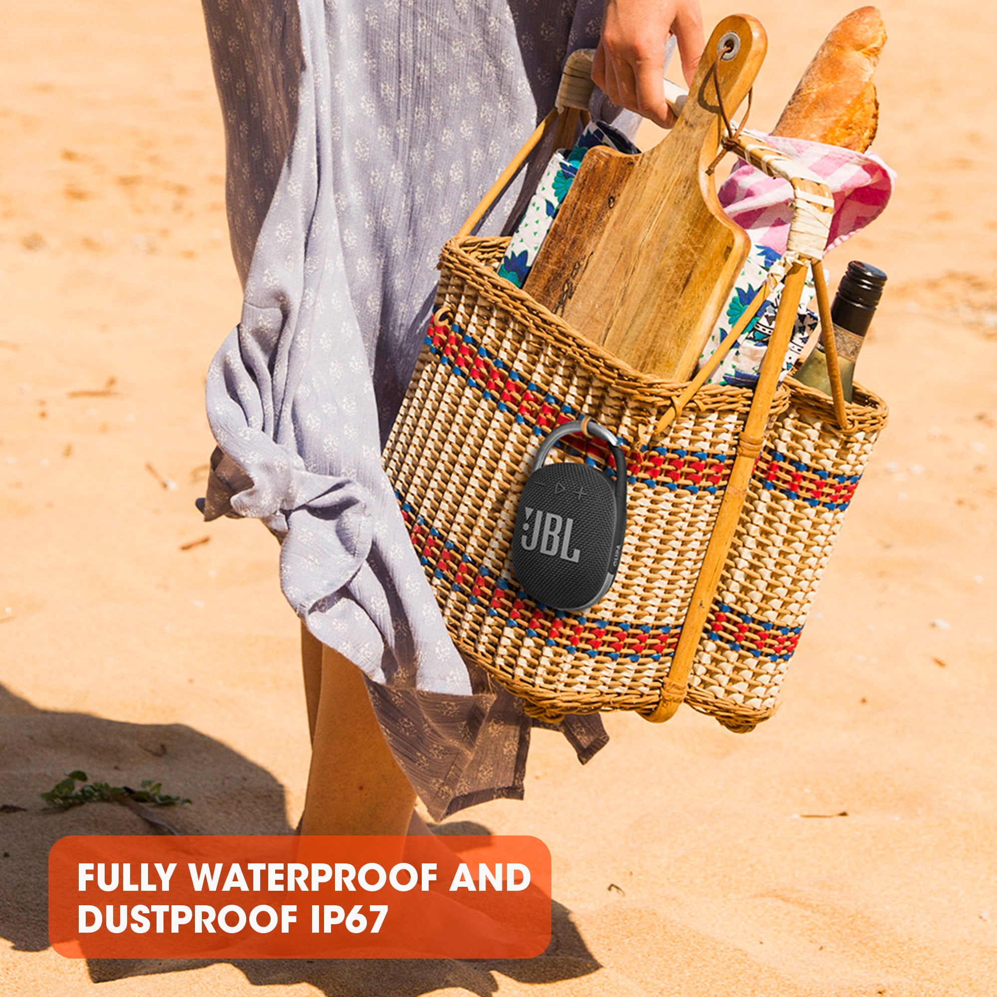 Rich JBL Original Pro Sound Bold style and ultra-portable design Upgraded integrated carabiner IP67 waterproof and dustproof Wireless Bluetooth streaming 10 hours of battery life Vibrant color options