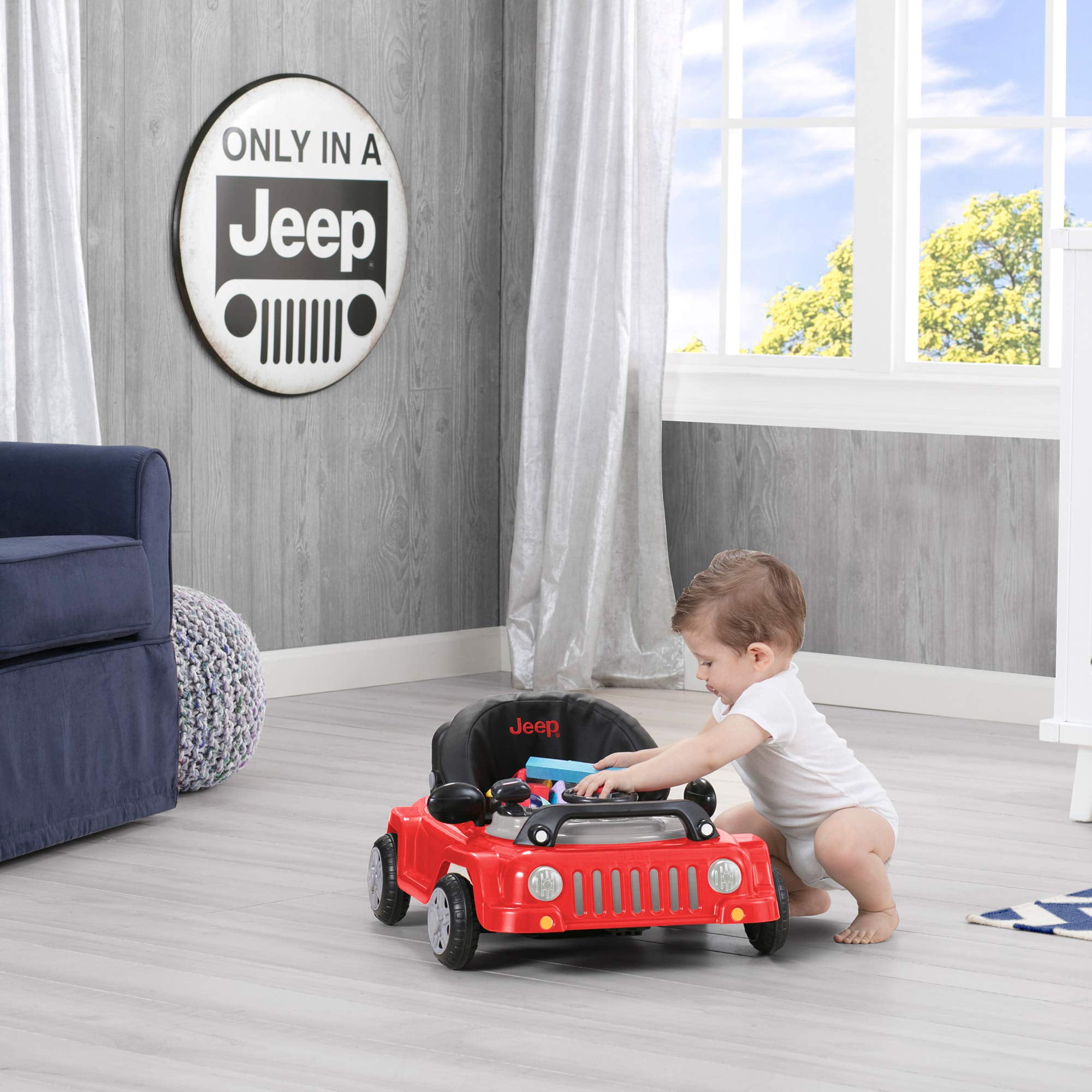 Adjustable seat height allows the walker to grow with your child , 3-in-1 design converts from baby walker mode into push-behind mode and a rolling toy car mode with toy storage,Resembles the classic Wrangler with its seven-slot grille, round headlamps and flat fender flares,Toy tray features steering wheel that turns left to right and makes realistic horn and engine sounds, turn signals light up, remove the toy tray to reveal a snack tray,The high seat back provides comfort and maximum support , Seat pad easily wipes clean,Assembled dimensions: 29.2″L x 25.1″W x 12″H
