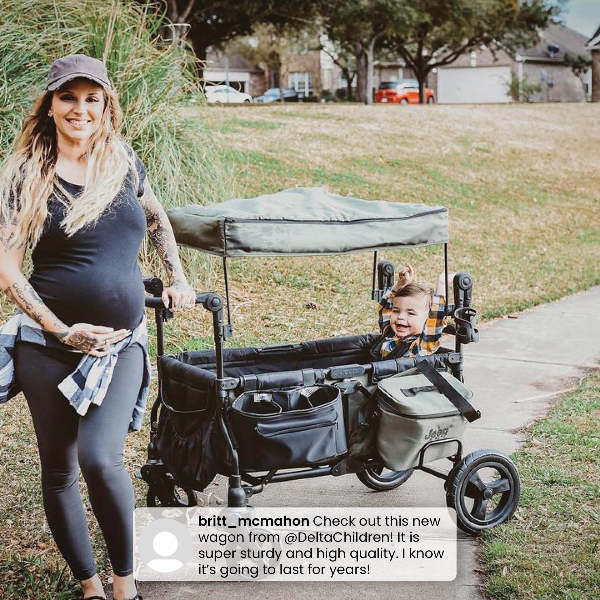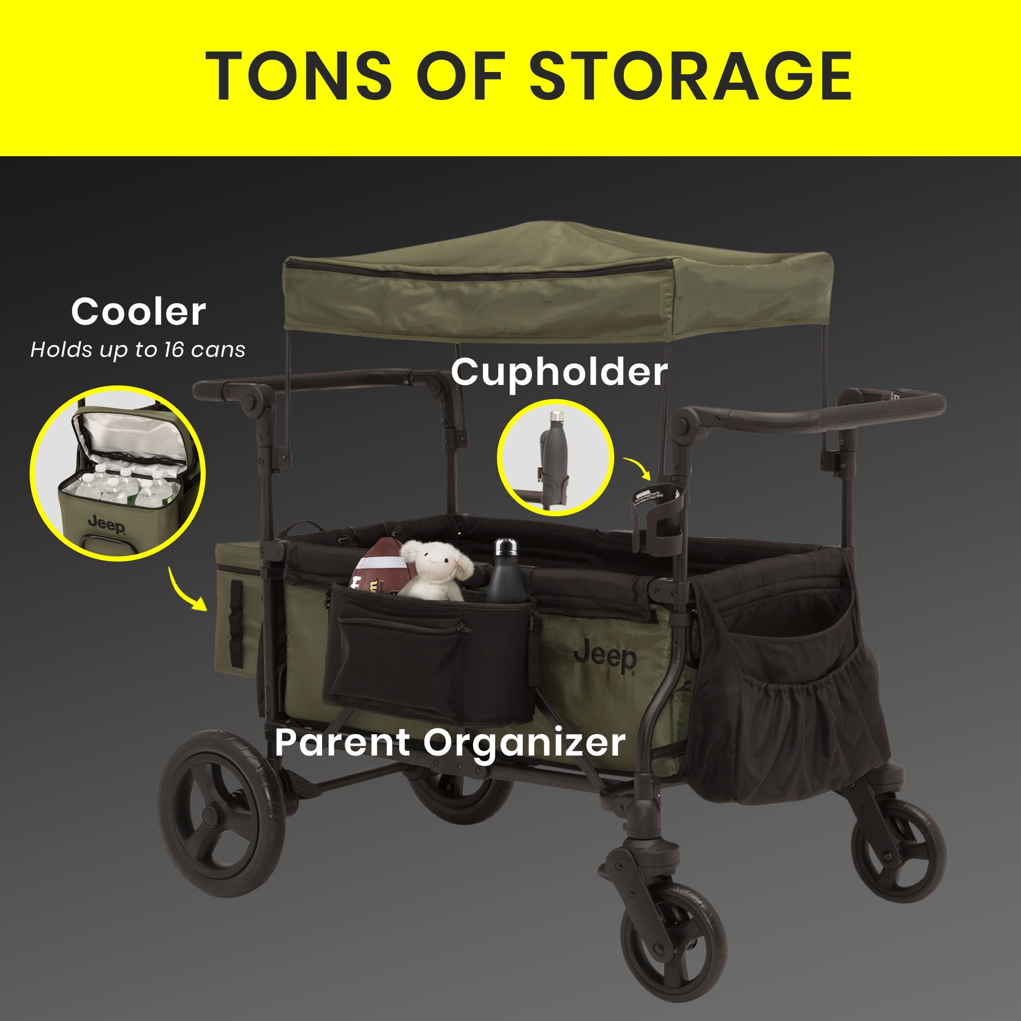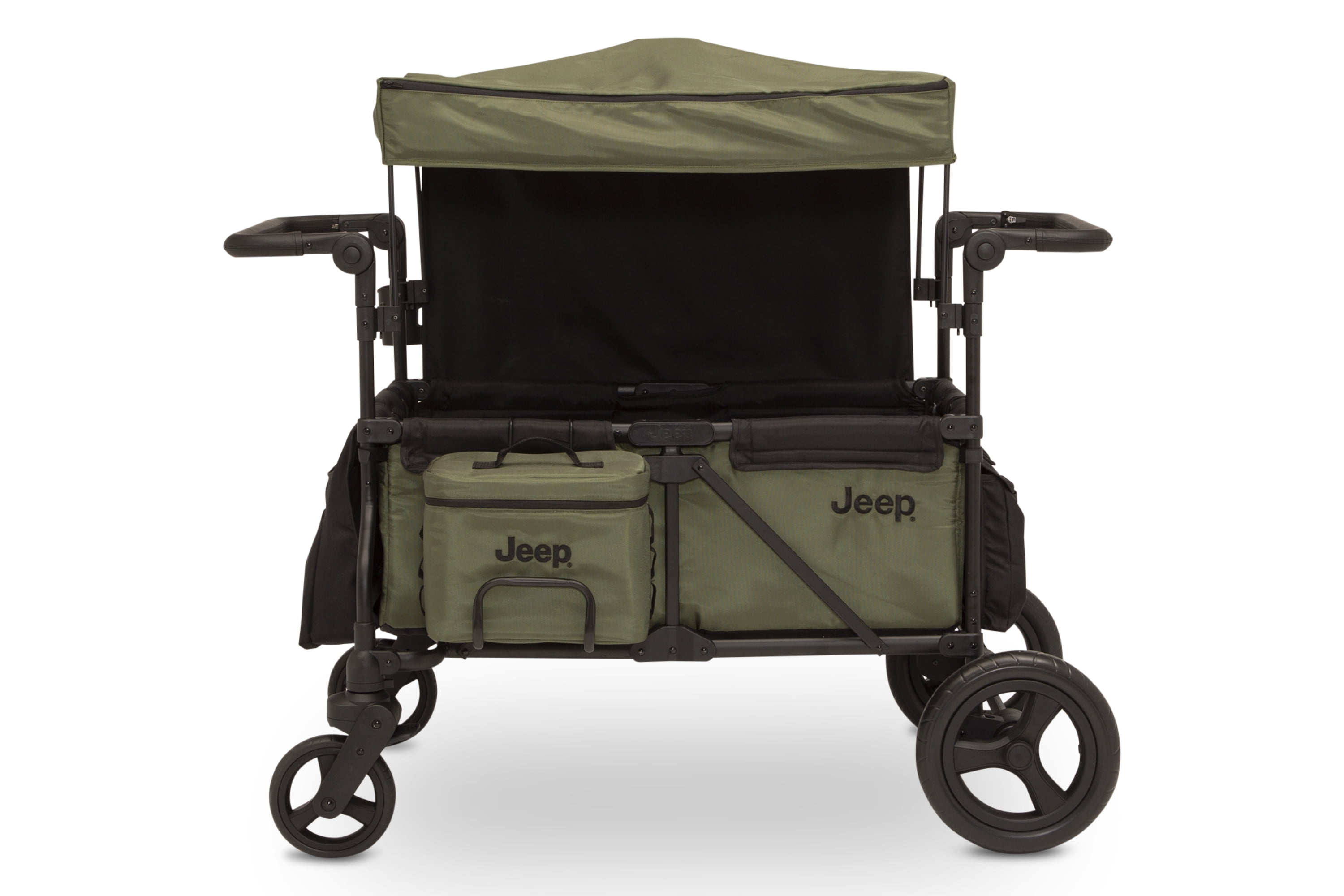 The Jeep Deluxe Wrangler stroller wagon with cooler bag and parent organizer by Delta Children is ready to tackle any family adventure. Designed with all the conveniences of a double stroller and the rugged durability of a wagon, it’s a super-fun crossover that makes any outing easy to take to the park, beach, or sporting event. With so many ways to ride, it’s ideal for kids of varying ages. The UV-blocking canopy protects little ones from the sun while pull-down shades block additional light during naptime. Remove the canopy for open-air cruising. Equipped with more storage than the average stroller, this wagon comes with a removable cooler bag, parent organizer, cup holder, and multiple storage pockets to keep all your must-have travel gear on hand. This wagon is the most off-road capable option ever thanks to its all-terrain puncture-proof airless tires. Easy to maneuver, swivel front wheels allow you to turn and pivot. To store or transport, the Jeep Deluxe Wrangler stroller wagon by Delta Children features a compact fold and quick-release back wheels which make it easier to fit tight spaces. And when your children outgrow the need for a stroller/wagon, use it to haul your gear at the farmers market, while gardening, or at the grocery store.