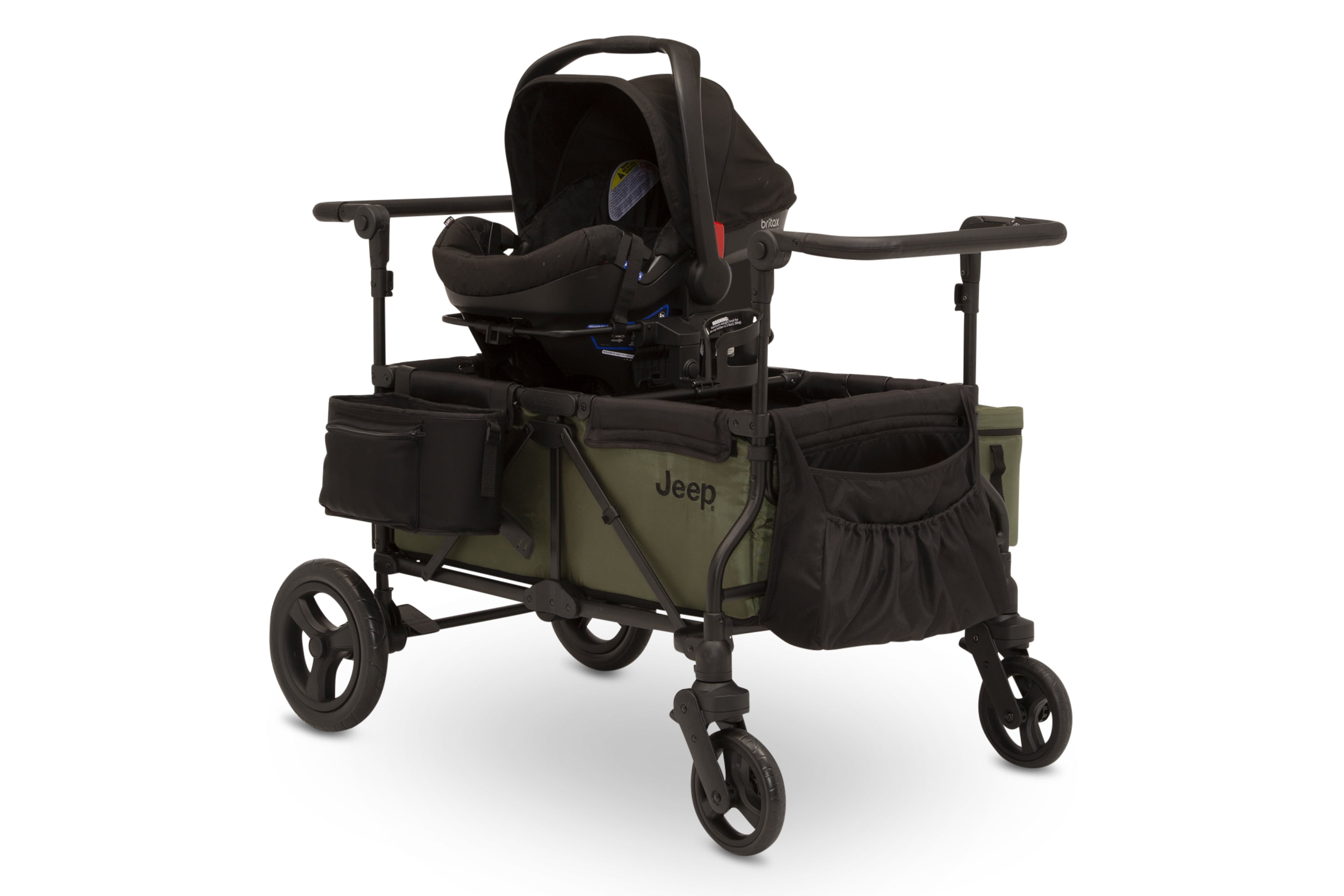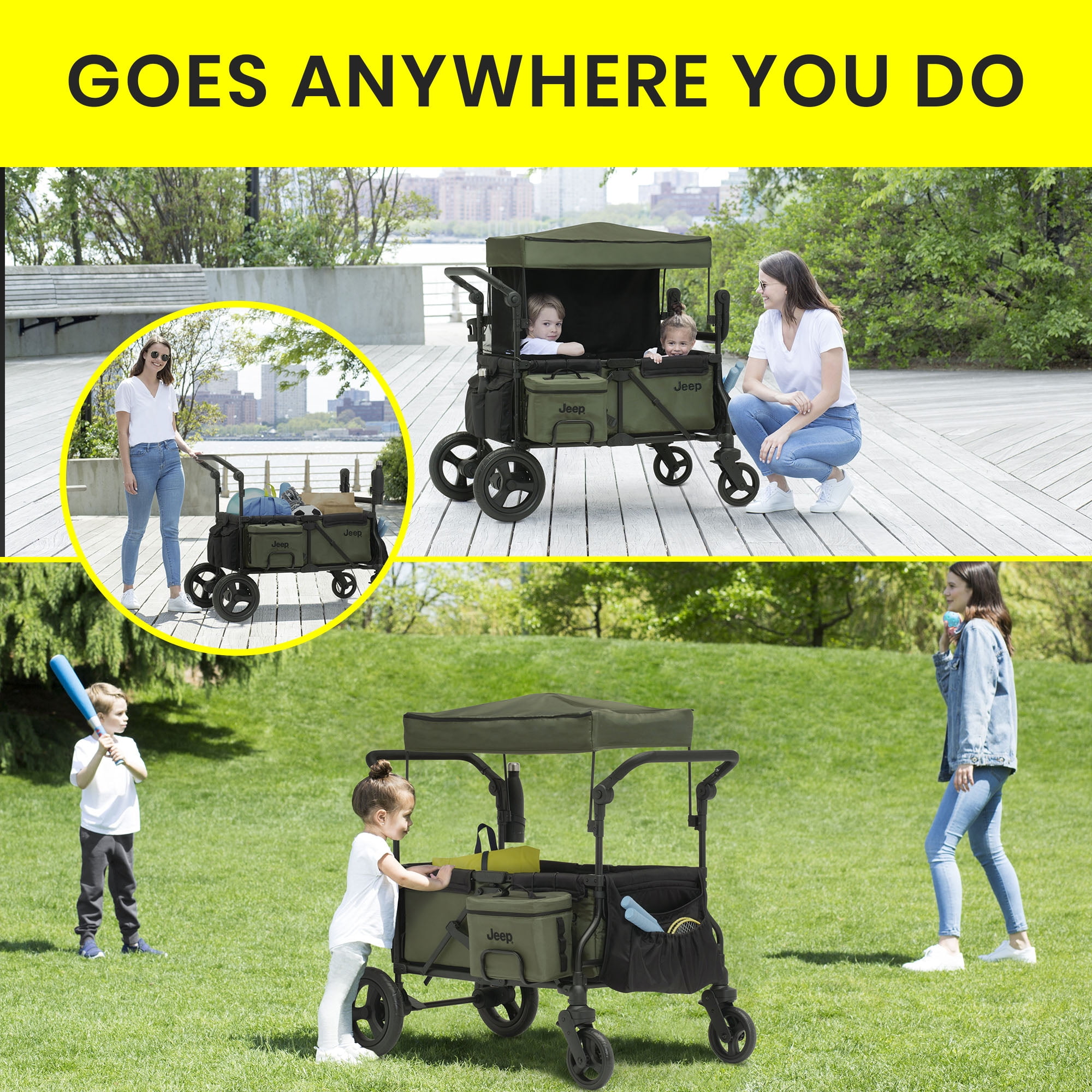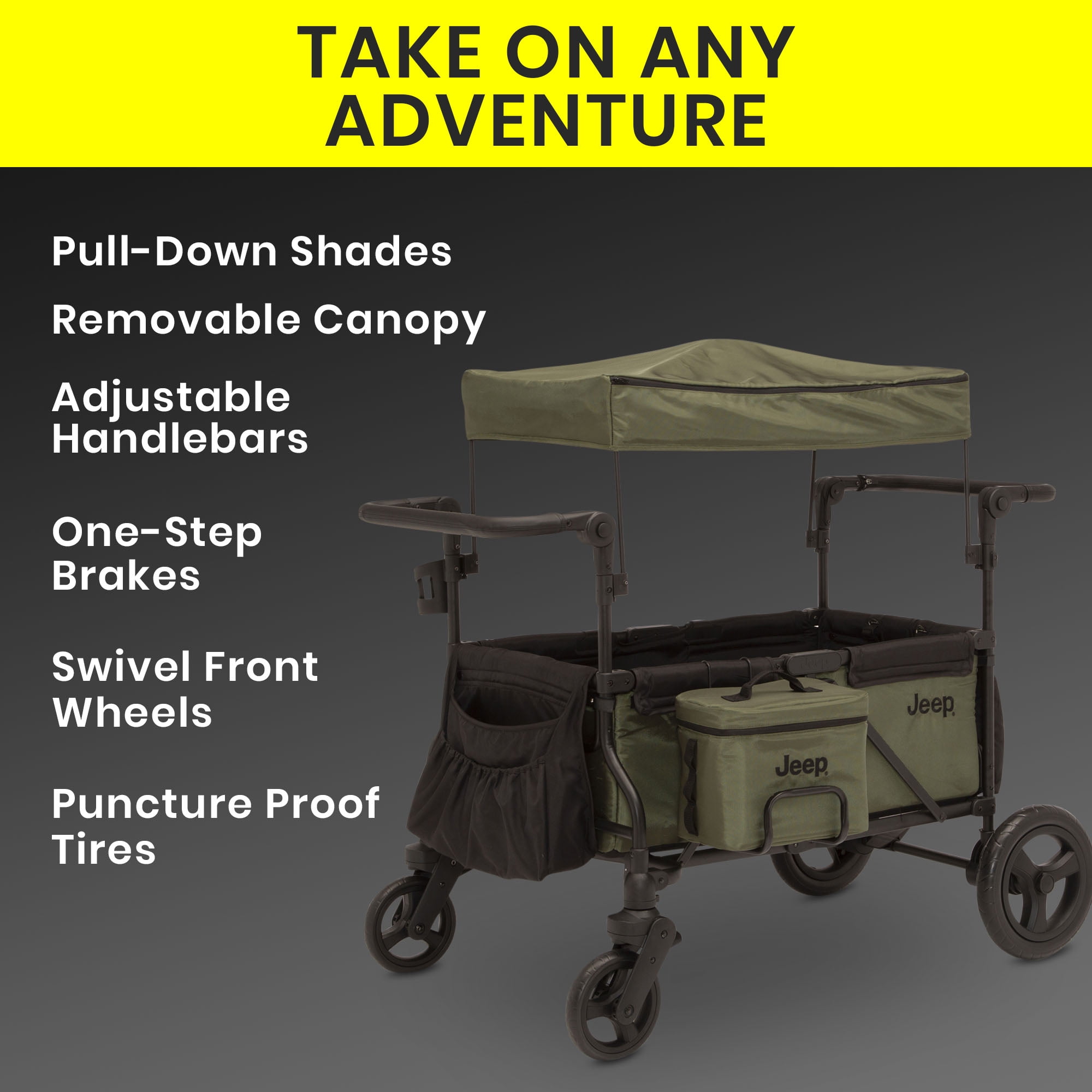 The Jeep Deluxe Wrangler stroller wagon with cooler bag and parent organizer by Delta Children is ready to tackle any family adventure. Designed with all the conveniences of a double stroller and the rugged durability of a wagon, it’s a super-fun crossover that makes any outing easy to take to the park, beach, or sporting event. With so many ways to ride, it’s ideal for kids of varying ages. The UV-blocking canopy protects little ones from the sun while pull-down shades block additional light during naptime. Remove the canopy for open-air cruising. Equipped with more storage than the average stroller, this wagon comes with a removable cooler bag, parent organizer, cup holder, and multiple storage pockets to keep all your must-have travel gear on hand. This wagon is the most off-road capable option ever thanks to its all-terrain puncture-proof airless tires. Easy to maneuver, swivel front wheels allow you to turn and pivot. To store or transport, the Jeep Deluxe Wrangler stroller wagon by Delta Children features a compact fold and quick-release back wheels which make it easier to fit tight spaces. And when your children outgrow the need for a stroller/wagon, use it to haul your gear at the farmers market, while gardening, or at the grocery store.